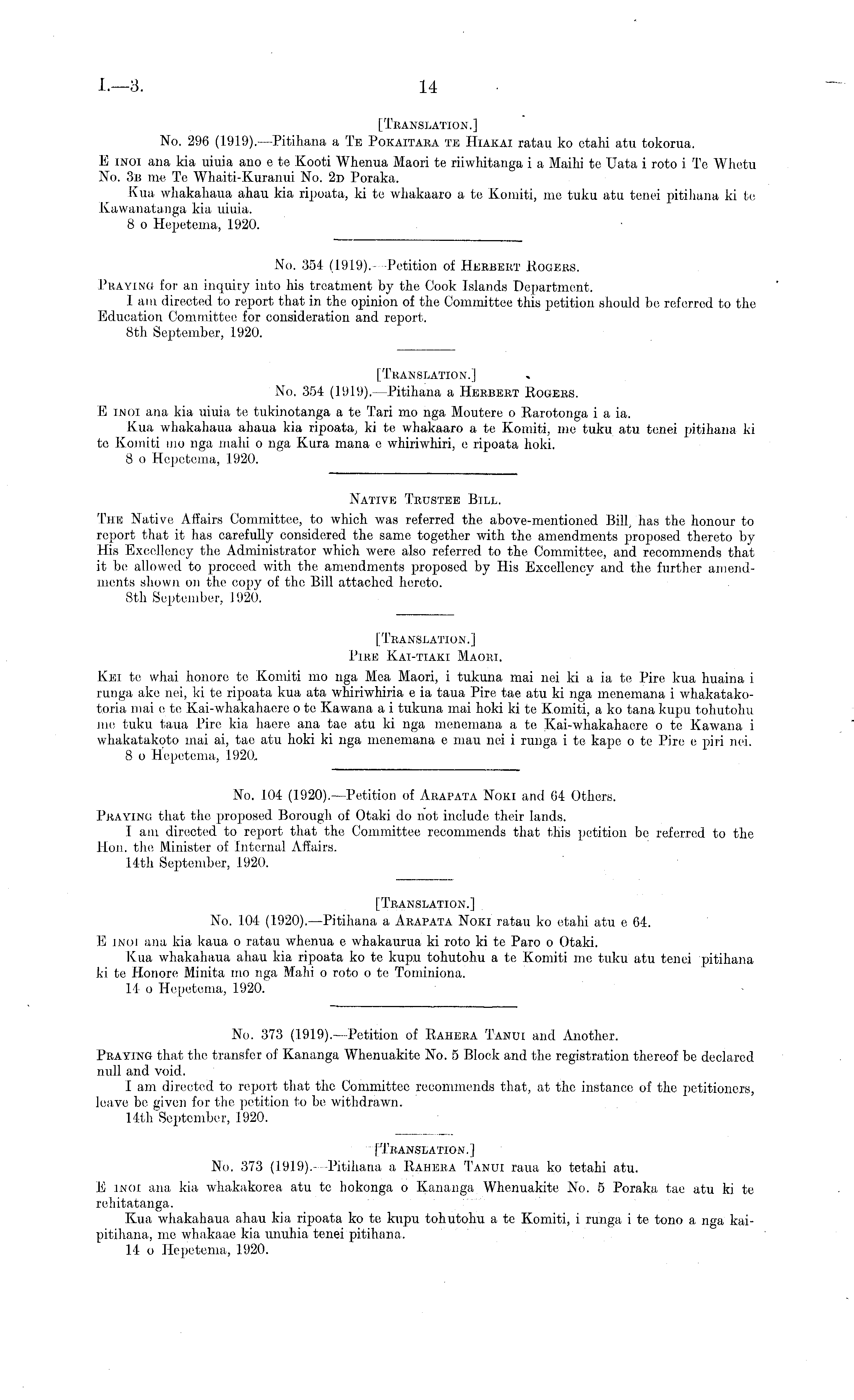 [Translation.] No. 296 (1919). —Pitihana a Te Pokaitara te Hiakai ratau ko etahi atu tokorua. E inoi ana kia uiuia ano c te Kooti Whenua Maori te riiwhitanga i a Maihi te Uata i roto i Te Whetu No. 3b me Te Whaiti-Kuranui No. 2d Poraka. Kua whakahaua ahau kia ripoata, kite whakaaro a te Komiti, me tuku atu tenei pitihana kite Kawanatanga kia uiuia. 8 o Hepetema, 1920. No. 354 (1919). Petition of Herbert Rogers. Praying for an inquiry into his treatment by the Cook Islands Department, I am directed to report that in the opinion of the Committee this petition should be referred to the Education Committee for consideration and report. Bth September, 1920. [Translation.) No. 354 (1919). —Pitihana a Herbert Rogers. E inoi ana kia uiuia te tukinotanga a te Tari mo nga Moutere o Rarotonga i a ia. Kua whakahaua ahaua kia ripoata, kite whakaaro a te Komiti, me tuku atu tenei pitihana ki to Komiti mo nga mahi o nga Kura mana c whiriwhiri, c ripoata hoki. 8 o Hepetema, 1920. Native Trustee Bill. The Native Affairs Committee, to which was referred the above-mentioned Bill, has the honour to report that it has carefully considered the same together with the amendments proposed thereto by His Excellency the Administrator which were also referred to the Committee, and recommends that it be allowed to proceed with the amendments proposed by His Excellency and the further amendments shown on the copy of the Bill attached hereto. Bth September, 1920. | Translation.] Pi hue Kai-tiaki Maori. Kei to whai. honore te Komiti mo nga Mea Maori, i tukuna mai nei ki a ia te Pire kua huaina i runga ake nei, kite ripoata kua ata whiriwhiria c ia taua Pire tae atu ki nga menemana i whakatakotoria mai c te Kai-whakahaere o te Kawana a i tukuna mai hoki ki. te Komiti, a ko tana kupu tohutohu me tuku taua Pire kia haere ana tae atu ki nga menemana a tc Kai-whakahaere o te Kawana i whakatakoto mai ai, tae atu hoki ki nga menemana c mau nei i runga i te kape o te Pire c piri nei. 8 o Hepetema, 1920, No. 104 (1920).—Petition of Arapata Noki and 64 Others. Praying that the proposed Borough of Otaki do not include their lands. I am directed to report that the Committee recommends that this petition be referred to the Hon. the Minister of Internal Affairs. 14th September, 1920. [Translation.] No. 104 (1920).—Pitihana a Arapata Noki ratau ko etahi atu c 64. E inoi ana kia kaua o ratau whenua c whakaurua ki roto kite Paro o Otaki. Kua whakahaua ahau kia ripoata ko tc kupu tohutohu a te Komiti me tuku atu tenei pitihana kite Honore Minita mo nga Mahi o roto o te Tominiona. 14 o Hepetema, 1920. No. 373 (1919).—Petition of Rahera. Tanui arid Another. Praying that the transfer of Kananga Whenuakite No. 5 Block and the registration thereof be declared null and void. I am directed to report that the Committee recommends that, at the instance of the petitioners, leave be given for the petition to be withdrawn. Uth September, 1920. [Translation.] No. 373 (1919).- Pitiliana a Rahera Tanui raua ko tetahi atu. E inoi ana kia whakakorea atu te hokonga o Kananga Whenuakite No. 5 Poraka tae atu kite rehitatanga. Kua whakahaua ahau kia ripoata ko te kupu tohutohu a te Komiti, i runga i te tono a nga kaipitihana, me whakaae kia unuhia tenei pitihana, 14 o Hepetema, 1920.