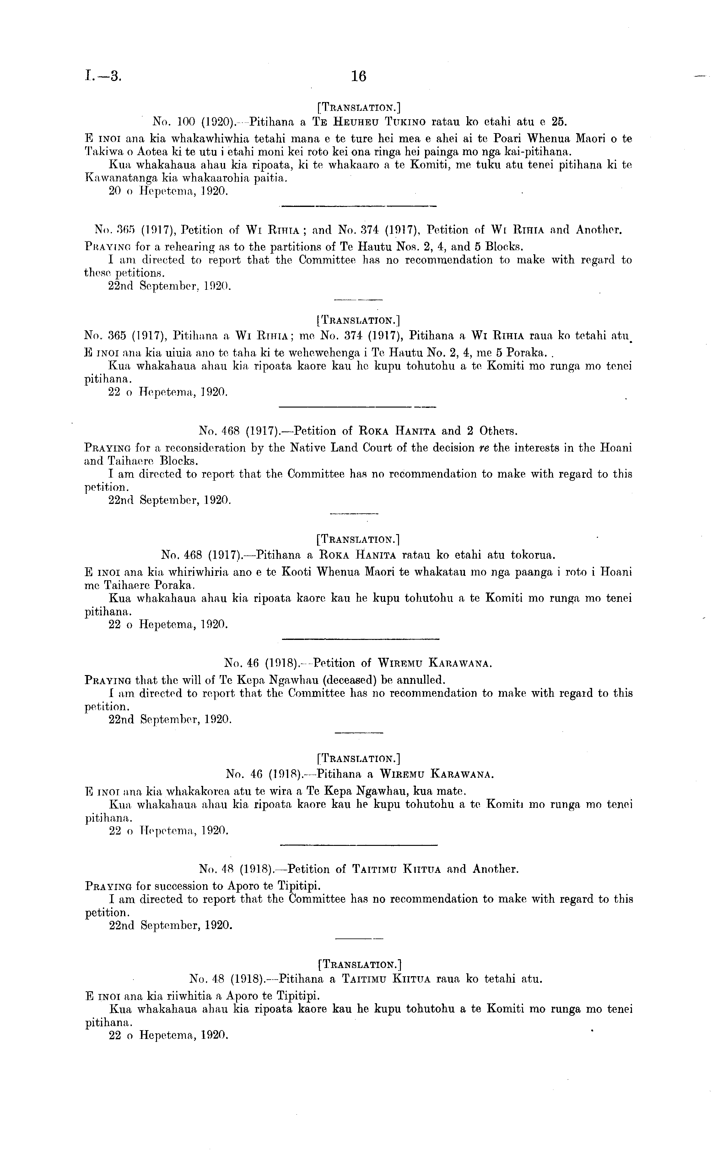 [Translation.] No. 100 (1920). Pitihana a Te Heuiieu Tukino ratau ko etahi atu c 25. E inoi ana kia whakawhiwhia tetahi mana c te ture hei mea c ahei ai tc Poari Whenua Maori o te Takiwa o Aotea kite utu i etahi moni kei roto kei ona ringa hei painga mo nga kai-pitihana. Kua whakahaua ahau kia ripoata, kite whakaaro a te Komiti, me tuku atu tenei pitiliana kite Kawanatanga kia whakaarobia paitia. 20 o Hepetema, 1920. No. 365 (1917), Petition of Wi Rihta ; and No. 374 (1917). Petition of Wi Rthta and Another. Praying for a rehearing as to the partitions of Te Hautu Nos. 2, 4, and 5 Blocks. I am directed to report that the Committee has no recommendation to make with regard to these petitions. 22nd September, 1.920. [Translation. ] No. 365 (1917), Pitihana a Wi Rthia ; me. No. 374 (1917), Pitihana a Wi Rihta raua ko tetahi atU E inoi ana kia uiuia ano te, taha kite wehewehenga i Te Hautu No. 2, 4, me 5 Poraka, . Kua whakahaua ahau kia ripoata kaore kau ho kupu tohutohu a te Komiti mo runga mo tenei pitihana. 22 o Hepetema, 1920. No. 468 (1917).—Petition of Roka Hanita and 2 Others. Praying for a reconsideration by the Native Land Court of the decision re the interests in the Hoani and Taihaere Blocks. I am directed to report that the Committee has no recommendation to make with regard to this petition. 22nd September, 1920. [Translation.] No. 468 (191.7). —Pitihana a Roka Hanita ratau ko etahi atu tokorua. E inoi ana kia, whiriwhiria ano c te Kooti Whenua Maori te whakatau mo nga paanga i roto i Hoani me Taihaere Poraka. Kua whakahaua ahau kia ripoata kaore kau he kupu tohutohu a, te Komiti mo runga mo tenei pitihana. 22 o Hepetema, 1920. No. 46 (1918).- Petition of Wiremu Karawana. Praying that the will of Te Kepa Ngawhau (deceased) be, annulled. I am directed to report that the Committee has no recommendation to make with regard to this petition. 22nd September, 1920. [Translation.] No. 46 (1918).- -Pitihana, a Wiremu Karawana. E inoi ana kia whakakorea atu te wira a Te Kepa Ngawhau, kua mate. Kua whakahaua ahau kia ripoata kaore kau he kupu tohutohu a te Komiti mo runga mo tenei pitihana. 22 o Hepetema, 1920. No. 48 (1918). —Petition of Taitimu Kiitua and Another. Praying for succession to Aporo te Tipitipi. I am directed to report that the Committee has no recommendation to make with regard to this petition. 22nd September, 1920. [Translation.] No. 48 (1918).- Pitihana a, Taitimu Kiitua raua ko tetahi atu. E inoi ana kia riiwhitia a Aporo te Tipitipi. Kua whakahaua, ahau kia ripoata kaore kau he, kupu tohutohu a te Komiti mo runga mo tenei pitihana. 22 o Hepetema, 1920.