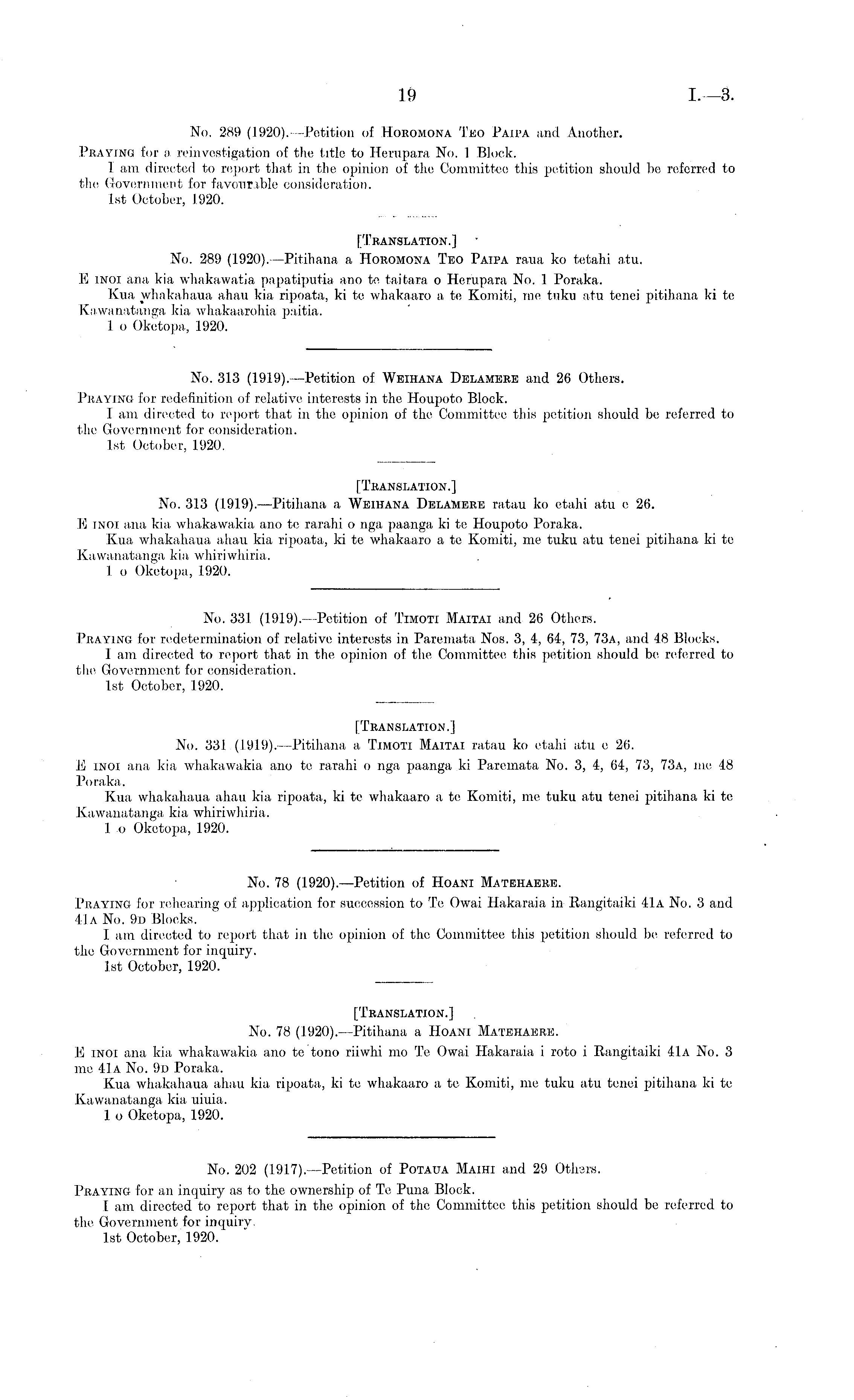 No. 289 (1920). -Petition of Horomona Teo Paipa and Another. Praying for a reinvestigation of the title to Herupara No. 1 Block. 1 am directed to report that in the opinion of the Committee! this petition should be referred to the Government for favourable consideration. Ist October, 1920. [Translation.] No. 289 (1920). —Pitihana a Horomona Teo Paipa ra,ua ko tetahi atu. E inoi ana kia whakawatia papatiputia ano te taitara o Herupara No. 1 Poraka. Kua whakahaua ahau kia ripoata, kite whakaaro a te Komiti, me tuku atu tenei pitihana kite Kawanatanga kia whakaarohia p.-iitia. 1 o Okotopa, .1920. No. 313 (1919). —Petition of Weihana Delamere and 26 Others. Praying for redefinition of relative interests in the Houpoto Block. I am directed to report that in the opinion of the Committee this petition should be referred to the Government for consideration. Ist October, 1920. [Translation.] No. 313 (1919). —Pitiliana a Weihana DelaMere ratau ko etahi atu c 26. E inoi ana kia whakawakia ano te rarahi o nga paanga, kite Houpoto Poraka. Kua whakahaua ahau kia ripoata, kite whakaaro a tc Komiti, me tuku atu tenei pitihana kite Kawanatanga kia whiriwhiria. 1 o Oketopa, 1920. No. 331 (1.9.1.9). Petition of Timoti Maitai and 26 Others. Praying for redetermination of relative interests in Paremata Nos. 3, 4, 64, 73, 73a, and 48 Blocks. I am directed to report that in the, opinion of the Committee, this petition should be, referred to the Government for consideration. Ist October, 1920. [Translation.] No. 331 (1919),—Pitihana a Timoti Maitai ratau ko etahi atu c 26. E inoi ana kia whakawakia ano to rarahi o nga paanga ki Paremata No. 3, 4, 64, 73, 73a, me 48 Poraka. Kua whakahaua ahau kia ripoata, kite whakaaro a te Komiti, me tuku atu tenei pitihana kite Kawanatanga, kia whiriwhiria, 1 o Oketopa, 1920. No. 78 (1920).—Petition of Hoani Mateehaere. Praying for rehearing of application for succession to Te Owai Hakaraia in Rangitaiki 41a No. 3 and 41a No. 9d Blocks. I am directed to report that in the opinion of the Committee this petition should be referred to the Government for inquiry. Ist October, 1920. [Translation.] No. 78 (1920). —Pitihana a Hoani Matehaere. E inoi ana Ida whakawakia ano tc tono riiwhi mo Te Owai Hakaraia, i roto i Rangitaiki 41a No. 3 me 41a No. 9d Poraka. Kua whakahaua ahau kia ripoata, kite whakaaro a te Komiti, me tuku atu tenei pitihana kite Kawanatanga kia uiuia. 1 o Oketopa, 1920. No. 202 (1917).—Petition of Potaua Maihi and 29 Others. Praying for an inquiry as to the ownership of Te Puna Block. 1 am directed to report that in the opinion of the Committee this petition should be referred to the Government for inquiry. Ist October, 1920.