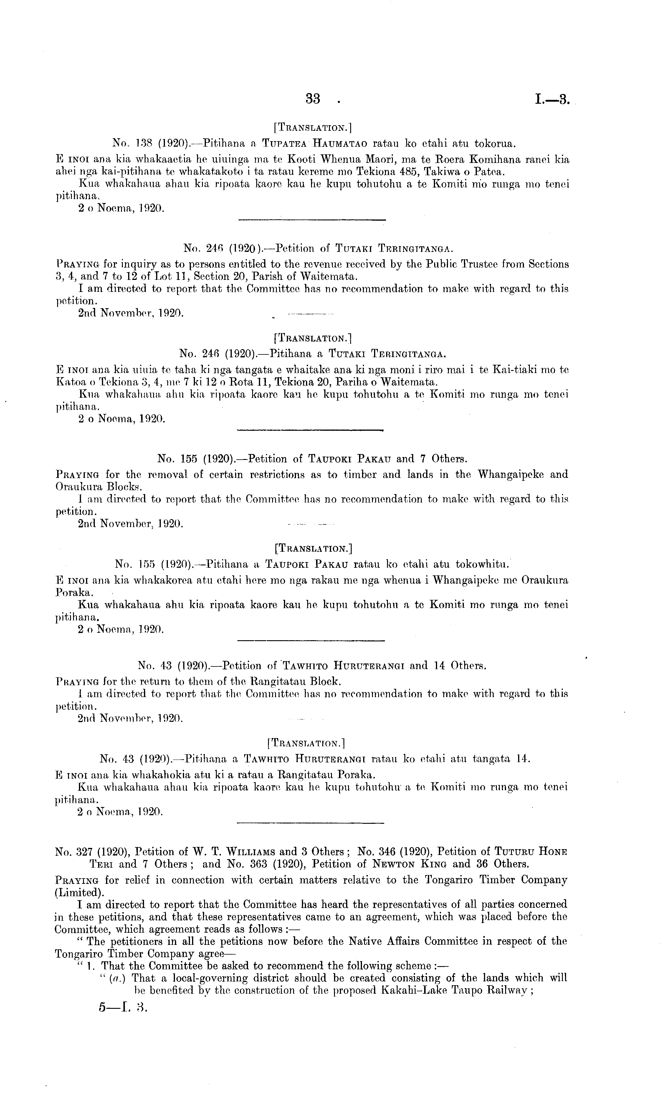 [Translation.] No. 138 (1920). Pitihana a Tupatea Haumatao ratau ko etahi atu tokorua. E inoi ana kia whakaaetia he uiuinga ma te Kooti Whenua Maori, ma te Roera Komihana ranei kia ahei nga kai-pitihana te whakatakoto i ta ratau kereme mo Tekiona 485, Takiwa o Patea. Kua whakahaua ahau kia ripoata kaore kau he kupu tohutohu a te Komiti mo runga mo tenei pitihana. 2o Noema, 1920. No. 246 (1920).—Petition of Tutaki Teringttanga. PrayiiNG for inquiry as to persons entitled to the revenue received by the Public Trustee from Sections 3, 4, and 7to 12 of' Lot 11, Section 20, Parish of Waitemata. 1 am directed to report that the Committee, has no recommendation to make with regard to this petition. 2nd November, 1920. [Translation.] No. 246 (1920).—Pitihana a Tutaki Teringitanga. E inoi ana Ida uiuia te taha ki nga tangata c whaitake ana ki nga moni i riro mai i te Kai-tiaki mo te Katoa o Tekiona 3, 4, hue 7 ki 12 o Rota 11, Tekiona 20, Pariha o Waitemata. Kua whakahaua ahu kia ripoata kaore, kau he kupu tohutohu a te Komiti mo runga mo tenei pitihana, 2 o Noema, 1920. No. 155 (1920).—Petition of Taupoki Pakau and 7 Others. Praytng for the removal of certain restrictions as to timber and lands in the Whangaipeke and Oraukura Blocks. J am directed to report that the Committee has no recommendation to make witli regard to this petition. 2nd November, 1920. [Translation.] No. 155 (1.920). —Pitihana a Taupoki Pakau ratau ko (Etahi atu tokowhitu. E inoi ana kia whakakorea atu (Etahi here mo nga rakau mo nga whenua i Whangaipeke me Oraukura Poraka. Kua whakahaua ahu kia ripoata kaore kau he kupu tohutohu a, te Komiti mo runga mo tenei pitihana. 2 o Noema, 1920. No. 43 (1920). —Petition of Tawhito HtTRTJTHRANOI and 14 Others. Praying for the return to them of the Rangitatau Block. i am directed to report that the. Committee has no recommendation to make with regard to this petition. 2nd November, 1920. | Translation.] No. 43 (1920). —Pitihana a Tawhito Huruterangi ratau ko etahi atu tangata 14. E inoi ana kia whakahokia atu ki a ratau a Rangitatau Poraka, Kua whakahaua ahau kia ripoata kaore kau he, kupu tohutohu a, te Komiti mo runga mo tenei pitihana. 2o Noema, 1920. No. 327 (1920), Petition of W. T. Williams and 3 Others; No. 346 (1920), Petition of Tuturu Hone Teri and 7 Others ; and No. 363 (1920), Petition of Newton King and 36 Others. Praying for relief in connection with certain matters relative to the Tongariro Timber Company (Limited). I am directed to report that the Committee has heard the representatives of all parties concerned in these petitions, and that these representatives came to an agreement, which was placed before the Committee, which agreement reads as follows : — " The petitioners in all the petitions now before tho Native Affairs Committee in respect of the Tongariro Timber Company agree — "1. That the Committee be asked to recommend the following scheme : — " (a.) That a local-governing district should be created consisting of the lands which will be benefited by the construction of the proposed Kakahr-Lake Taupo Railway ;
