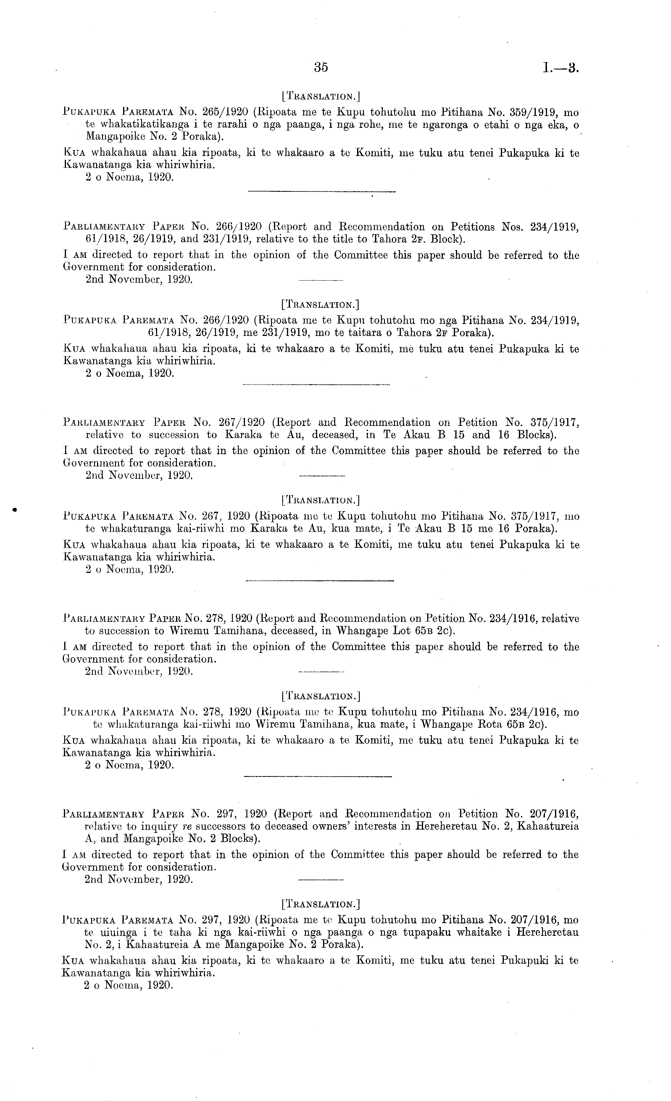 [Translation.] Pukapuka Paremata No. 265/1920 (Ripoata me te Kupu tohutohu mo Pitihana No. 359/1919, mo te whakatikatikanga i te rarahi o nga paanga, i nga rohe, me te ngaronga o etahi o nga eka, o Mangapoike No. 2 Poraka). Kua whakahaua ahau kia ripoata, kite whakaaro a tc Komiti, me tuku atu tenei Pukapuka kite Kawanatanga Ida whiriwhiria. 2 o Noema, 1920. Parliamentary Paper No. 266/1920 (Report and Recommendation on Petitions Nos. 234/1919, 61/1918, 26/1919, and 231/1919, relative to the title to Tahora 2e. Block). I am directed to report that in the opinion of the Committee this paper should be referred to the Government for consideration. 2nd November, 1920. [Translation.] Pukapuka Paremata No. 266/1920 (Ripoata me te Kupu tohutohu mo nga Pitihana No. 234/1919, 61/1918, 26/1919, me 231/1919, mo to taitara o Tahora 2e Poraka). Kua whakahaua ahau kia ripoata, kite whakaaro a te Komiti, me tuku atu tenei Pukapuka kite Kawanatanga kia whiriwhiria, 2 o Noema, 1920. Parliamentary Paper No. 267/1920 (Report and Recommendation on Petition No. 375/1917, relative to succession to Karaka te Au, deceased, in Te Akau B 15 and .1.6 Blocks). 1 am directed to report that in the opinion of the Committee this paper should be referred to the Government for consideration. 2nd November, 1920. [ Translation.] Pukapuka Paremata No. 267, 1920 (Ripoata mo te Kupu tohutohu mo Pitihana No. 375/1917, mo te whakaturanga kai-riiwhi mo Karaka te Au, kua mate, i Te Akau B 15 me 16 Poraka). Kua whakahaua ahau kia ripoata, kite whakaaro a te Komiti, me tuku atu tenei Pukapuka kite Kawanatanga kia whiriwhiria. 2 o Noema, 1920. Parliamentary Paper No. 278, 1920 (Report and Recommendation on Petition No. 234/1916, relative to succession to Wiremu Tamihana, deceased, in Whangape Lot 65b 2c). 1 am directed to report that in tho opinion of the Committee this paper should be referred to the Government for consideration. 2nd November, 1920. | Translation.] Pukapuka Paremata No. 278, 1.920 (Ripoata me te Kupu tohutohu mo Pitihana No. 234/1916, mo te, whakaturanga kai-riiwhi mo Wiremu Tamihana, kua mate, i Whangape Rota 65b 2c). Kua whakahaua ahau kia ripoata, kite whakaaro a te Komiti, me tuku atu tenei Pukapuka kite Kawanatanga kia whiriwhiria. 2 o Noema, 1920. Parliamentary Paper No. 297, 1920 (Report and Recommendation on Petition No. 207/1916, relative to inquiry re successors to deceased owners' interests in Hereheretau No. 2, Kahaatureia A, and Mangapoike No. 2 Blocks). I am directed to report that in the opinion of the Committee this paper should be referred to the Government for consideration, 2nd November, 1920. [Translation.] Pukapuka Paremata No. 297, 1920 (Ripoata me te Kupu tohutohu mo Pitihana No. 207/1916, mo te uiuinga i te taha ki nga kai-riiwhi o nga paanga o nga tupapaku whaitake i Hereheretau No. 2, i Kahaatureia A me Mangapoike No. 2 Poraka). Kua whakahaua ahau kia ripoata, kite whakaaro a te Komiti, me tuku atu tenei Pukapuki kite Kawanatanga kia whiriwhiria. 2 o Noema, 1920.