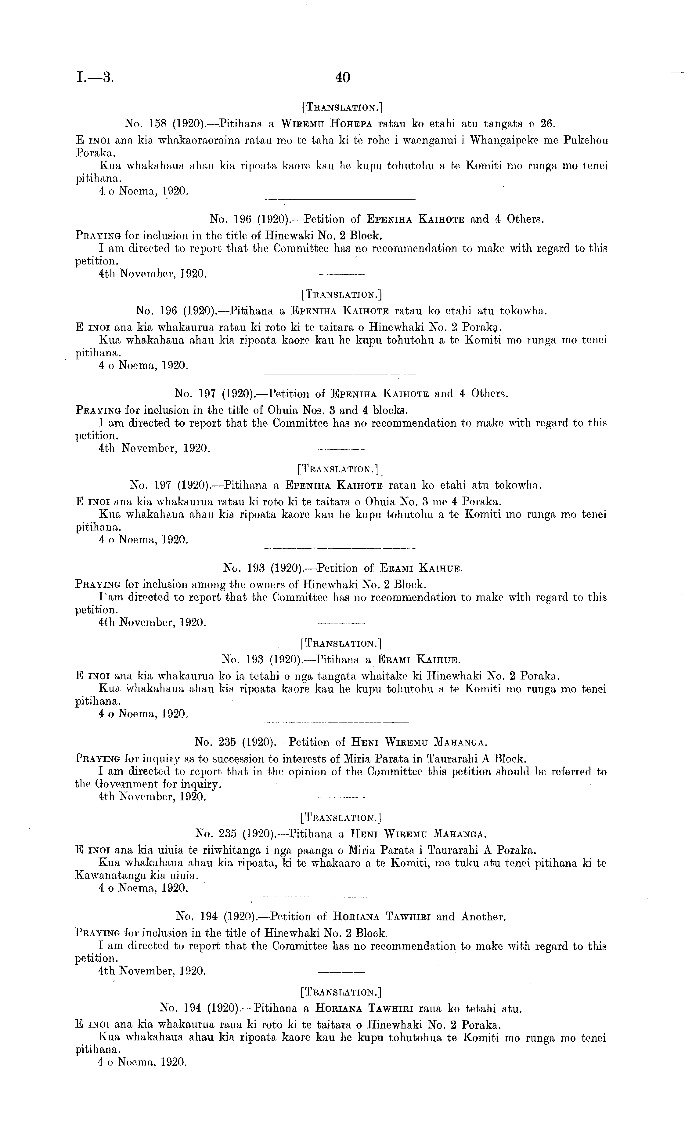 [Translation.] No. 158 (1920). —Pitihana. a Wiremu Hohepa ratau ko etahi atu tangata c 26. E inoi ana, kia whakaoraoraina ratau mo te taha kite rohe i waenganui i Whangaipeke me Pukchou Poraka. Kua whakahaua ahau kia ripoata kaore, kau he kupu tohutohu a te Komiti mo runga, mo tenei pitihana. 4o Noema, 1920. No. 196 (1920). —Petition of Epeniha Kaihote and 4 Others. Praying for inclusion in the title of Hinewaki No. 2 Block. I am directed to report that the Committee has no recommendation to make with regard to this petition. 4th November, 1920. [Translation.] No. 196 (1920). —Pitihana a, Epeniha Kaihote ratau ko etahi atu tokowha. E inoi ana kia whakaurua, ratau ki roto kite taitara o Hinewhaki No. 2 Poraka. Kua whakahaua ahau kia ripoata kaore kau he, kupu tohutohu a te Komiti mo runga mo tenei pitihana. 4 o Noema, 1920. No. 197 (1920). —Petition of Epeniha Kaihote and 4 Others. Praying for inclusion in the title of Ohuia Nos. 3 and 4 blocks. I am directed to report that the Committee has no recommendation to make with rcga,rd to this petition. 4th November, 1920. [Translation.] No. 1.97 (1920),- -Pitihana a Epeniha Kaihote ratau ko etahi atu tokowha. E inoi ana Ida whakaurua ratau ki. roto kite taitara o Ohuia No. 3 me 4 Poraka. Kua whakahaua ahau kia ripoata kaore kau. he kupu tohutohu a te Komiti mo runga mo tenei pitihana. 4 o Noema, 1920. No. 193 (I.92o).—Petition of Erami Kaihue. Praying for inclusion among the owners of Hinewhaki No. 2 Block. I*am directed to report that the Committee has no recommendation to make with regard to this petition. 4th November, 1920. [Translation.] No. 193 (1920).—Pitihana, a Erami Kathiie. E inoi ana kia whakaurua ko ia, tetahi o nga tangata, whaitake ki Hinewhaki No. 2 Poraka, Kua whakahaua ahau Ida ripoata kaore kau he kupu tohutohu a te Komiti mo runga mo tenei pitihana. 4 o Noema, 1920. No. 235 (1920).—Petition of Heni Wiremu Mahanga. Praying for inquiry as to succession to interests of Miria Parata in Taurarahi A Block. I am directed to report, that in. the opinion of tho Committee this petition should be referred to the Government for inquiry. 4th November, 1920. [Translation. | No. 235 (1920).—Pitihana a Heni Wiremu Mahanga. E inoi ana kia uiuia te. riiwhitanga i nga paanga o Miria Parata i Taurarahi A Poraka. Kua whakahaua ahau kia ripoata, kite whakaaro a te Komiti, me tuku atu tenei pitihana kite Kawanatanga kia uiuia, 4 o Noema, 1.920. No. 194 (1920). —Petition of Horiana Tawhiri and Another. Praying for inclusion in the title of Hinewhaki. No. 2 Block. I am directed to report that the Committee has no recommendation to make with regard to this petition. 4th November, 1920. ■ — [Translation.] No. 194 (1.920). —Pitihana a Horiana Tawhiri raua ko tetahi atu. E inoi ana kia whakaurua raua ki roto kite taitara o Hinewhaki No. 2 Poraka. Kua whakahaua ahau kia ripoata kaore kau he kupu tohutohua te Komiti mo runga mo tenei pitihana. 4 o Noema, 1920.