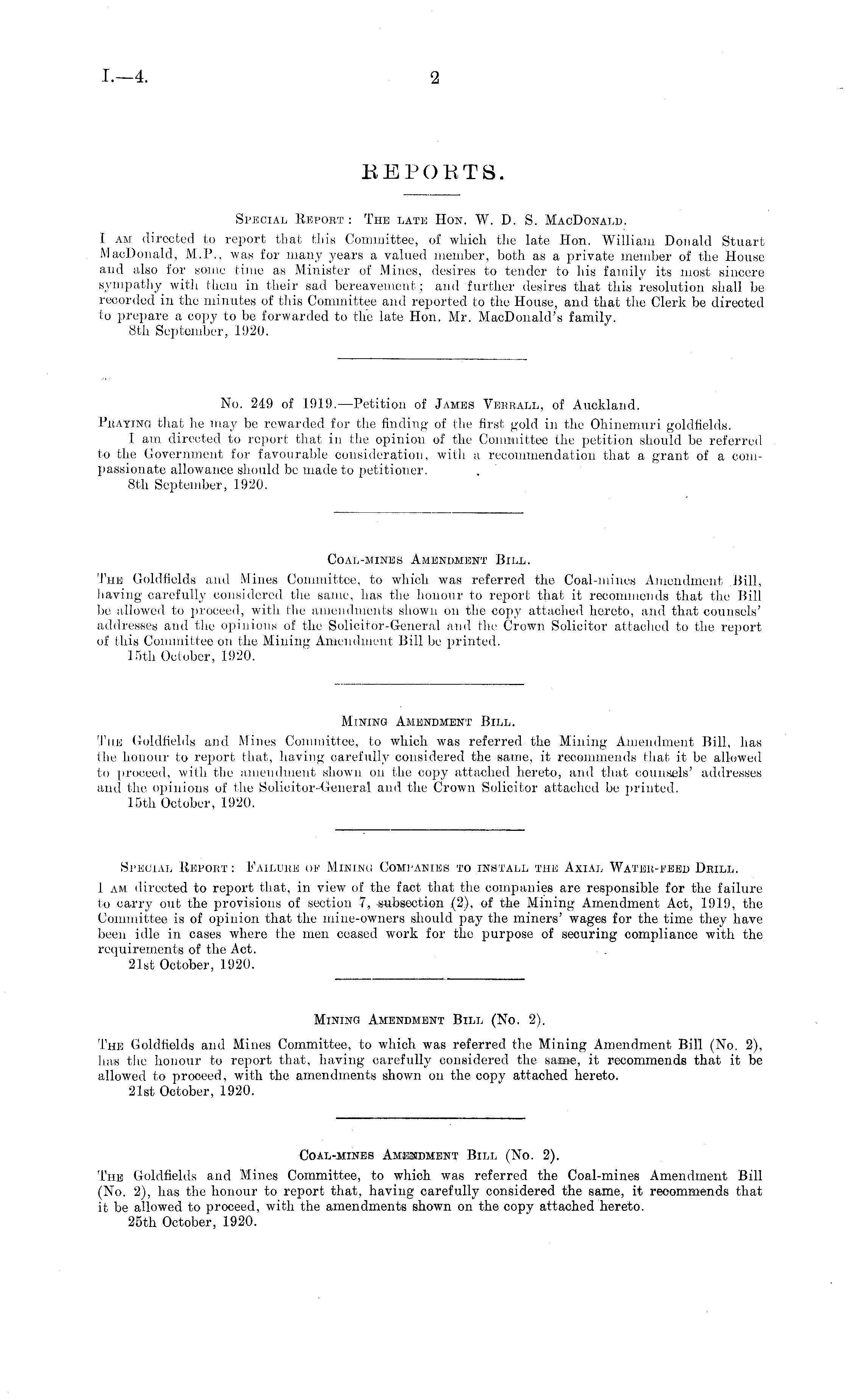 BE PORTS. Special Report: The late Hon. W. D. S. Mac Donald. I am directed to report that this Committee, of which the late Hon. William Donald Stuart Mac Donald, M.P., was for many years a valued member, both as a private member of the House and also for some time as Minister of Mines, desires to tender to his family its most sincere sympathy with them in their sad bereavement ; and further desires that this resolution shall be recorded in the minutes of this Committee and reported to the House, and that the Clerk be directed to prepare a copy to be forwarded to the late Hon. Mr. Mac Donald's family. Bth September, 1920.,