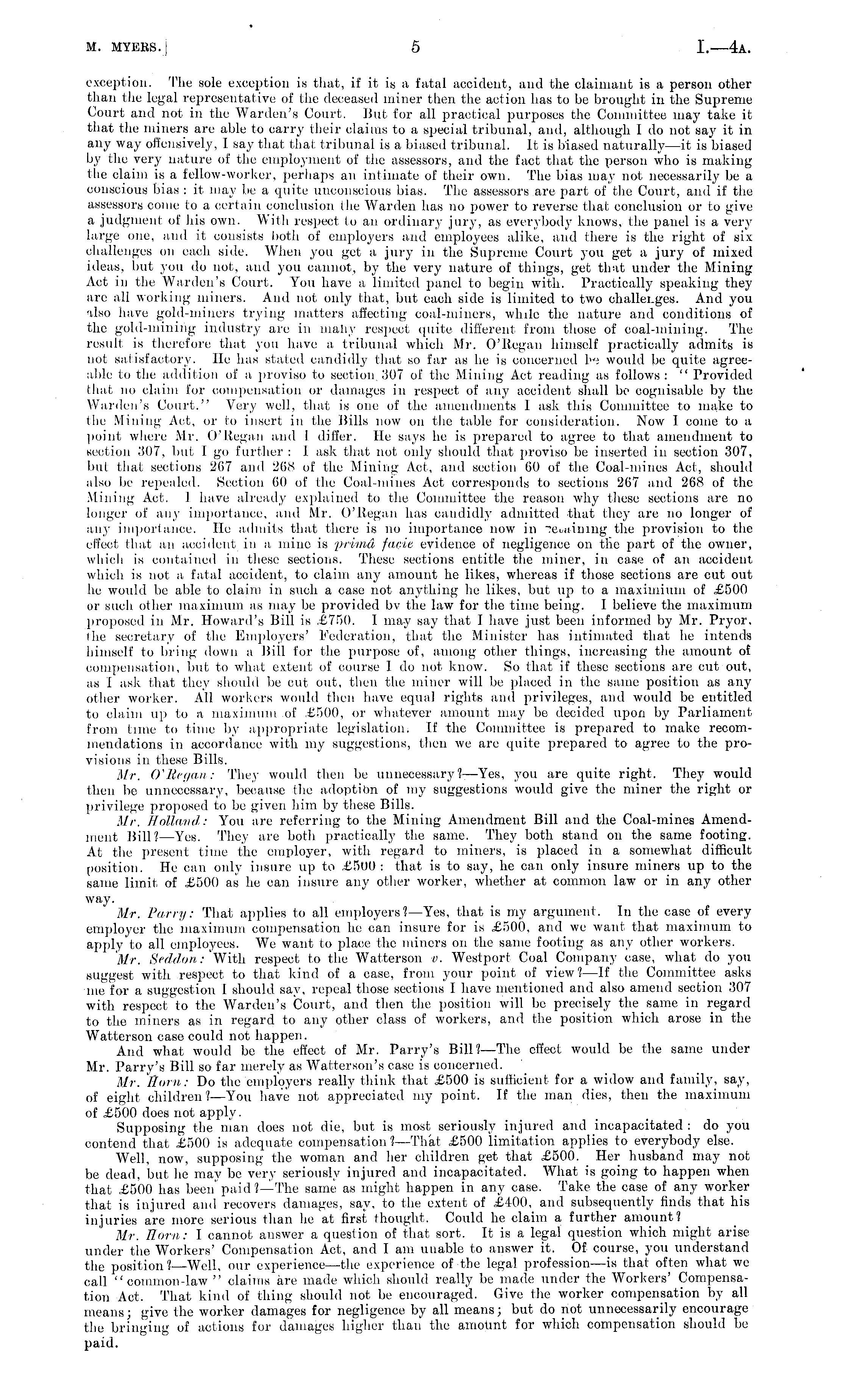 exception. The sole exception is that, if it is a fatal accident, and the claimant is a person other than the legal representative of the deceased miner then the action has to be brought in the Supreme Court and not in the Warden's Court. But for all practical purposes the Committee may take it that the miners are able to carry their claims to a special tribunal, and, although I do not say it in any way offensively, I say that that tribunal is a biased tribunal. It is biased naturally—it is biased by the very nature of the employment of the assessors, and the fact that the person who is making the claim is a fellow-worker, perhaps an intimate of their own. The bias may not necessarily be a conscious bias : it, may bo a quite unconscious bias. The assessors are part of the Court, and if the assessors come to a certain conclusion the Warden has no power to reverse that conclusion or to give a judgment of his own. With respect to an ordinary jury, as everybody knows, the panel is a very large one, and it, consists both of employers and employees alike, and there is the right of six challenges on each side. AVhon you get a, jury in the Supremo Court you get a jury of mixed ideas, but you do not, and you cannot, by the very nature of things, get that under the Mining Act in the Warden's Court. You have a limited panel to begin with. Practically speaking they arc all working miners. And not only that, but each side is limited to two challenges. And you also have gold-miners trying matters affecting coal-mincrs, while the nature and conditions of the gold-mining industry are in many respect quite different from those of coal-mining. The result is therefore that you have a tribunal which Mr. O'Regan himself practically admits is not satisfactory. He has stated candidly that so far as he is concerned he would be quite agreeable to tho addition of a proviso to section 307 of the Mining Act reading as follows : " Provided that no claim for compensation or damages in respect of any accident shall be cognisable by the Warden's Court." Very well, that is one of the amendments 1 ask this Committee to make to the Mining Act, or to insert in the Bills now on the table for consideration. Now I come to a point where Mr. O'Regan and I differ. He says he is prepared to agree to that amendment to section 307, but I go further : 1 ask that not only should that proviso be inserted in section 307, but that sections 267 and 268 of the Mining Act, and section 60 of the Coal-mines Act, should also be repealed. Section 60 of the Coal-mines Act corresponds to sections 267 and 268 of the Mining Act. 1 have already explained to the Committee the reason why these sections arc no longer of any importance, and Mr. O'Regan has candidly admitted that they are no longer of any importance. He admits that there is no importance now in ";e«aining the provision to the effect that an accident in a mine is prima facie evidence of negligence on the part of the owner, which is contained in these sections. These sections entitle the miner, in case of an accident which is not a fatal accident, to claim any amount he likes, whereas if those sections are cut out he would be able to claim in such a case not anything he likes, but up to a maximium of £500 or such other maximum as may be provided bv the law for the time being. 1 believe the maximum proposed in Mr. Howard's Bill is £750. 1 may say that I have just been informed by Mr. Pryor. the secretary of the Employers' Federation, that the Minister has intimated that he intends himself to bring down a Bill for the purpose of, among other things, increasing the amount of compensation, but to what extent, of course 1 do not know. So that if these sections are cut out, as I ask that they should be cut out, then the miner will be placed in the same position as any other worker. All workers would then have equal rights and privileges, and would be entitled to claim up to a maximum of £500, or whatever amount may be decided upon by Parliament from time to time by appropriate legislation. If the Committee is prepared to make recommendations in accordance with my suggestions, then we are quite prepared to agree to the provisions in these Bills. Mr. O'Regan: They would then be unnecessary?-—Yes, you are quite right. They would then be unnecessary, because the adoption of my suggestions would give the miner tho right or privilege proposed to be given him by these Bills. Mr. Holland: You are referring to the Mining Amendment Bill and the Coal-mines Amendment Bill? —Yes. They are both practically the same. They both stand on the same footing. At the present time the employer, with regard to miners, is placed in a somewhat difficult position. He can only insure up to £500: that is to say, he can only insure miners up to the same limit, of £500 as he can insure any other worker, whether at common law or in any other way. Mr. Parry: That applies to all employers?—Yes, that is my argument. In the case of every employer the maximum compensation he can insure for is £500, and we want that maximum to apply to all employees. We want to place the miners on the same footing as any other workers. Mr. Seddon: 'With respect to the Watterson v. Westport Coal Company case, what do you suggest, with respect, to that kind of a case, from your point of view? —If the Committee asks me for a suggestion I should say, repeal those sections I have mentioned and also amend section 307 with respect to the Warden's Court, and then tho position will be precisely the same in regard to the miners as in regard to any other class of workers, and tho position which arose in the Watterson case could not happen. And what would be the effect of Mr. Parry's Bill?—The effect would be the same under Mr. Parry's Bill so far merely as Watterson's case is concerned. Mr. Horn: Do the employers really think that £500 is sufficient for a widow and family, say, of eight children? —You have not appreciated my point. If th