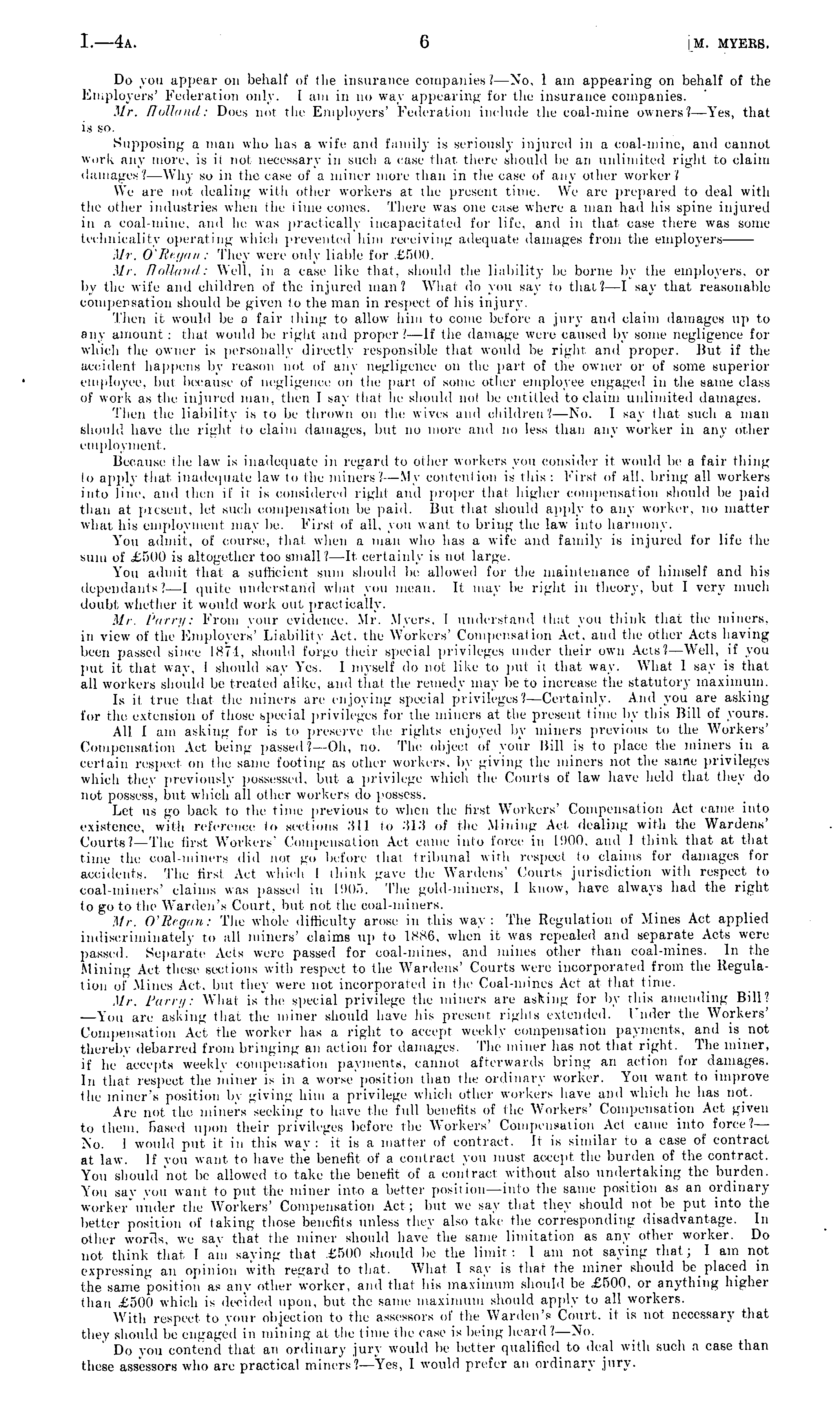 Do you appear on behalf of the insurance companies?—No, 1 am appearing on behalf of the Employers' Federation only. lamin no way appearing for the insurance companies. Mr. Holland: Does not the Employers' Federation include the coal-mine owners?— Yes, that is so. Supposing a man who has a wife and family is seriously injured in a coal-mine, and cannot work any more, is it not necessary in such a case that there should be an unlimited right to claim damages I—Why so in the case of a miner more than in the case of any other worker ? We are not dealing with other workers at the present time. We are prepared to deal with the other industries when the time comes. There was one case where a man had his spine injured in a coal-mine, and he was practically incapacitated for life, and in that case there was some technicality operating which prevented him receiving adequate damages from the employers Mr. o'Regan: They were only liable for £500. Mr. Holland: Well, in a case like that, should the liability be borne by the employers, or by the wife and children of the injured man? What do you say to that?—l say that reasonable compensation should be given to the man in respect of his injury. Then it would be a fair thing to allow him to come before a jury and claim damages up to any amount: that would be right and proper ? —lf the damage were caused by some negligence for which the owner is personally directly responsible that would be right and proper. But if the accident happens by reason not of any negligence on the part of the owner or of some superior employee, but because of negligence on the part of some other employee engaged in the same class of work as the injured man, then I say that he should not be entitled to claim unlimited damages. Then the liability is to be thrown on the wives and children? —No. I say that such a man should have the right to claim damages, but no more and no less than any worker in any other employment. Because the law is inadequate in regard to other workers you consider it would be a fair thing to apply that inadequate law to the miners?—My contention is this : First of all, bring all workers into line, and then if it is considered right and proper that higher compensation should be paid than at present, let such compensation be paid. But that should apply to any worker, no matter what his employment may be. First of all, you want to bring the law into harmony. You admit, of course, that when a man who has a wife and family is injured for life the sum of £500 is altogether too small? —It certainly is not large. You admit that a sufficient sum should be allowed for the maintenance of himself and his dependants?—l quite understand what you mean. It may be right in theory, but I very much doubt whether it would work out practically. Mr. Parry: From your evidence, Mr. Myers, 1 understand that you think that the miners, in view of the Employers' Liability Act, the Workers' Compensation Act, and the other Acts having been passed since 1874, should forgo their special privileges under their own Acts? —Well, if you put it that way, I should say Yes. I myself do not like to put it that way. What 1 say is that all workers should be treated alike, and that the remedy may be to increase the statutory maximum. Is it true that the miners are enjoying special privileges?— Certainly. And you are asking for the extension of those special privileges for the miners at the present time by this Bill of yours. All I am asking for is to preserve the rights enjoyed by miners previous to the Workers' Compensation Act being passed?—Oh, no. The object of your Bill is to place the miners in a certain respect on the same footing as other workers, by giving the miners not the same privileges which they previously possessed, but a privilege which the Courts of law have held that they do not possess, but which all other workers do possess. Let us go back to the time previous to when the first Workers' Compensation Act came into existence, with reference to sections 311 to 313 of the Mining Act dealing with the Wardens' Courts?— The first Workers' Compensation Act came into force in 1900, and I think that at that time the coal-miners did not go before that tribunal with respect to claims for damages for accidents. The first Act which 1 think gave the Wardens' Courts jurisdiction with respect to coal-miners' claims was passed in 1905. The gold-miners, I know, have always had the right to go to the Warden's Court, but not the coal-miners. Mr. O'Regan: The whole difficulty arose in this way: The Regulation of Mines Act applied indiscriminately to all miners' claims up to 1886, when it was repealed and separate Acts were passed. Separate Acts were passed for coal-mines, and mines other than coal-mines. In the Mining Act these sections with respect to the Wardens' Courts were incorporated from the Regulation of Mines Act, but they were not incorporated in the Coal-mines Act at that time. Mr. Parry: What is the special privilege the miners are asking for by this amending Bill? —You are asking that the miner should have his present rights extended. Under the Workers' Compensation Act the worker has a right to accept weekly compensation payments, and not thereby debarred from bringing an action for damages. The miner has not that right. The miner, if he accepts weekly compensation payments, cannot afterwards bring an action for damages. In that respect the miner is in a worse position than the ordinary worker. You want to improve the miner's position by giving him a privilege which other workers have and which he has not. Are not the miners seeking to have the full benefits of the Workers' Compensation Act given to them, Based upon their privileges before the Workers' Compensation Act came into force? No. I would put it in this way : it is a matter of contract. It is similar to a case of contract at law. If you want to have the benefit of a contract you must accept the burde