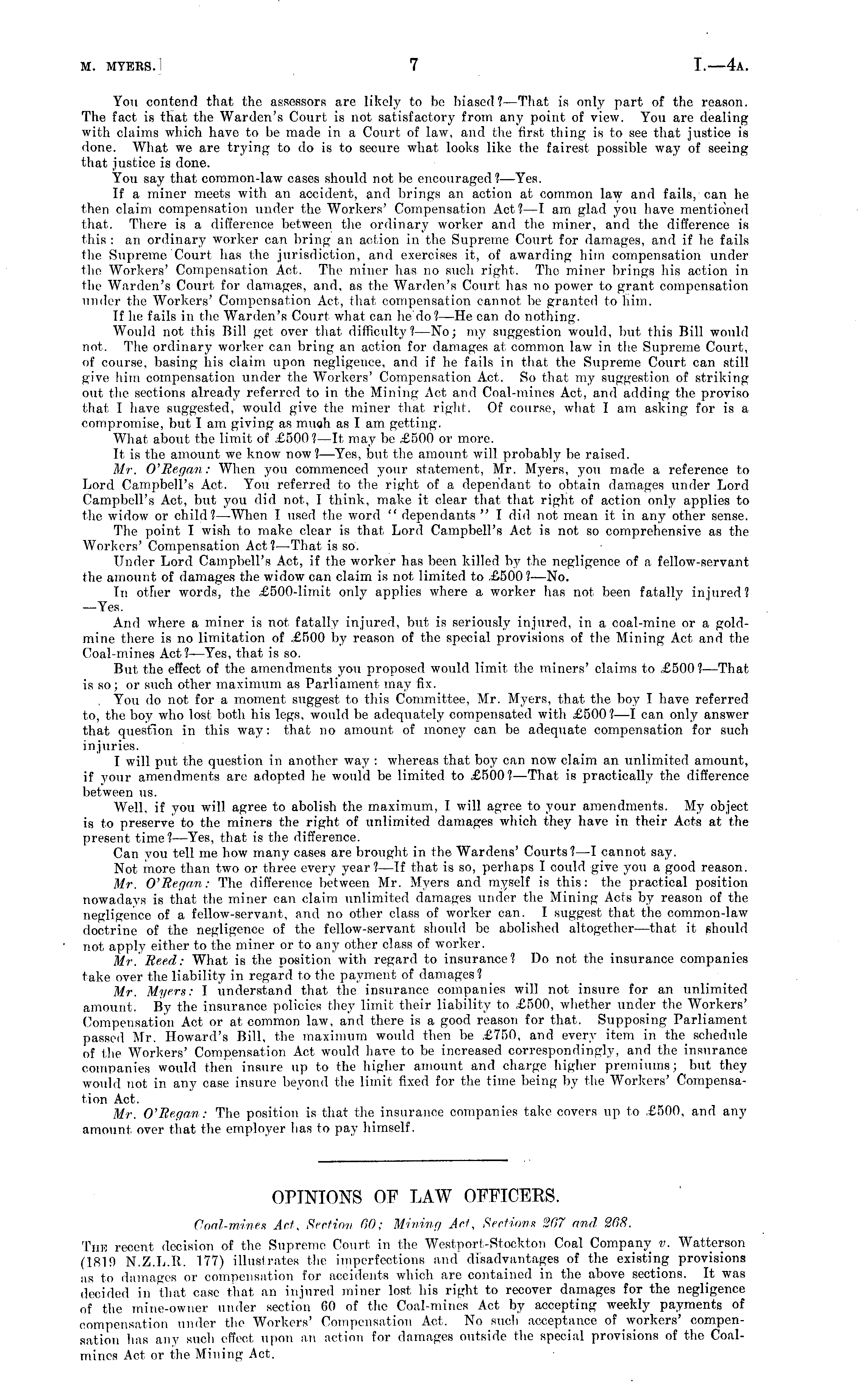 You contend that the assessors are likely to be biased?—That is only part of the reason. The fact is that the Warden's Court is not satisfactory from any point of view. You are dealing with claims which have to be made in a Court of law, and the first thing is to see that justice is done. What we are trying to do is to secure what looks like the fairest possible way of seeing that justice is done. You say that common-law cases should not be encouraged?—Yes. If a miner meets with an accident, and brings an action at common law and fails, can he then claim compensation under the Workers' Compensation Act?—l am glad you have mentioned that. There is a difference between the ordinary worker and the miner, and the difference is this : an ordinary worker can bring an action in the Supreme Court for damages, and if he fails the Supreme Court has the jurisdiction, and exercises it, of awarding him compensation under the Workers' Compensation Act. The miner has no such right. The miner brings his action in the Warden's Court for damages, and, as the Warden's Court, has no power to grant compensation under the Workers' Compensation Act, that compensation cannot be granted to him. If he fails in the Warden's Court what can he do?—He can do nothing. Would not this Bill get over that difficulty? —No; my suggestion would, but this Bill would not. The ordinary worker can bring an action for damages at common law in the Supreme Court, of course, basing his claim upon negligence, and if he fails in that the Supreme Court can still give him compensation under the Workers' Compensation Act. So that my suggestion of striking out the sections already referred to in the Mining Act and Coal-mines Act, and adding the proviso that I have suggested, would give the miner that right. Of course, what I am asking for is a compromise, but I am giving as much as I am getting. What about the limit of £500?—It may be £500 or more. It is tho amount we know now?—Yes, but the amount, will probably be raised. Mr. O'Regan: When you commenced your statement, Mr. Myers, you made a reference to Lord Campbell's Act. You referred to the right of a dependant to obtain damages under Lord Campbell's Act, but j'ou did not, I think, make it clear that that right of action only applies to the widow or child?—When T used the word " dependants " T did not mean it in any other sense. The point I wish to make clear is that Lord Campbell's Act is not so comprehensive as the Workers' Compensation Act ? —That is so'. Under Lord Campbell's Act, if the worker has been killed by the negligence of a fellow-servant the amount of damages the widow can claim is not limited to £500?—No. In other words, the £500-limit only applies where a worker has not been fatally injured? —Yes. And where a miner is not fatally injured, but is seriously injured, in a coal-mine or a goldmine there is no limitation of £500 by reason of the special provisions of tho Mining Act and the Coal-mines Act?—Yes, that is so. But the effect of the amendments you proposed would limit the miners' claims to £500?—That is so; or such other maximum as Parliament may fix. , You do not for a moment, suggest, to this Committee, Mr. Myers, that the boy I have referred to, the boy who lost both his legs, would be adequately compensated with £500?—I can only answer that question in this way: that no amount of money can be adequate compensation for such injuries. I will put the question in another way : whereas that boy can now claim an unlimited amount, if your amendments are adopted he would be limited to £500? —That, is practically the difference between us. Well, if you will agree to abolish the maximum, I will agree to your amendments. My object is to preserve to the miners the right of unlimited damages which they have in their Acts at the present time? —Yes, that is the difference. Can you tell me how many cases are brought in the Wardens' Courts?—l cannot say. Not more than two or three every year? —If that is so, perhaps I could give you a good reason. Mr. O'Regan: The difference between Mr. Myers and myself is this: the practical position nowadays is that the miner can claim unlimited damages under the Mining Acts by reason of the negligence of a fellow-servant, and no other class of worker can. I suggest that the common-law doctrine of the negligence of the fellow-servant should be abolished altogether—that it should not apply either to the miner or to any other class of worker. Mr. Reed: What is the position with regard to insurance? Do not the insurance companies take over the liability in regard to the payment of damages? Mr. Myers: I understand that the insurance companies will not insure for an unlimited amount. By the insurance, policies they limit their liability to £500, whether under the AVorkers' Compensation Act or at common law, and there is a good reason for that. Supposing Parliament passed Mr. Howard's Bill, the maximum would then be £750, and every item in the schedule of the Workers' Compensation Act would have to be increased correspondingly, and the insurance companies would then insure up to the higher amount and charge higher premiums; but they would not in any case insure beyond the limit fixed for the time being by the Workers' Compensation Act. Mr. O'Regan: The position is that the insurance companies take covers up to £500, and any amount over that the employer has to pay himself.