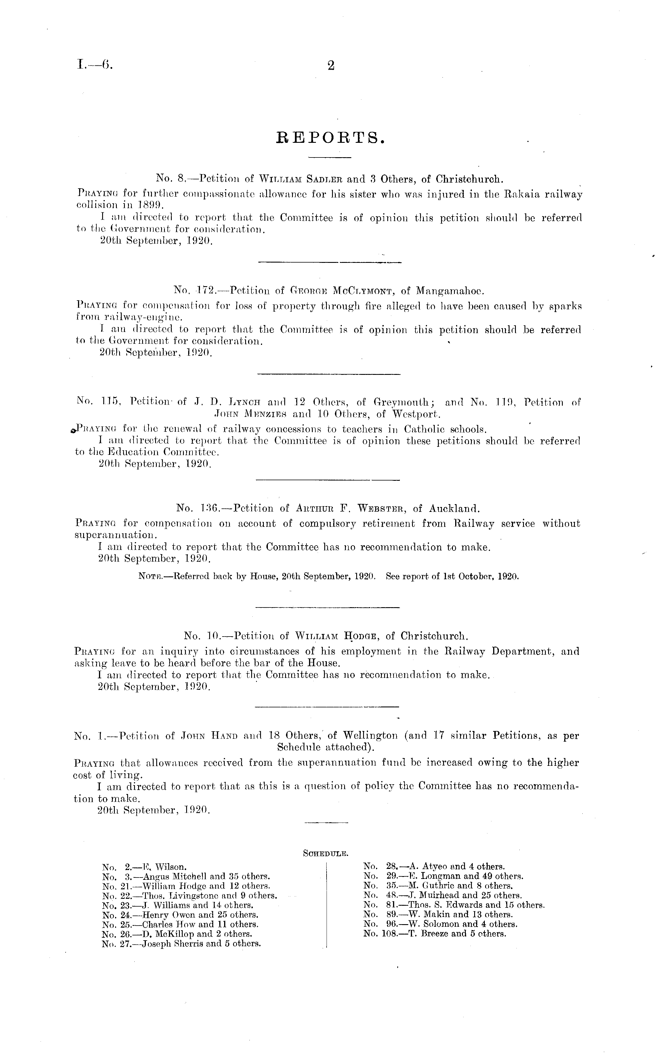 REPORTS. No. B.—Petition of William Sadler and 3 Others, of Christchurch. Praying for further compassionate allowance for his sister who was injured in the Rakaia railway collision in 1899. I am directed to report that the Committee is of opinion this petition should be referred to the Government for consideration, 20th September, 1920.