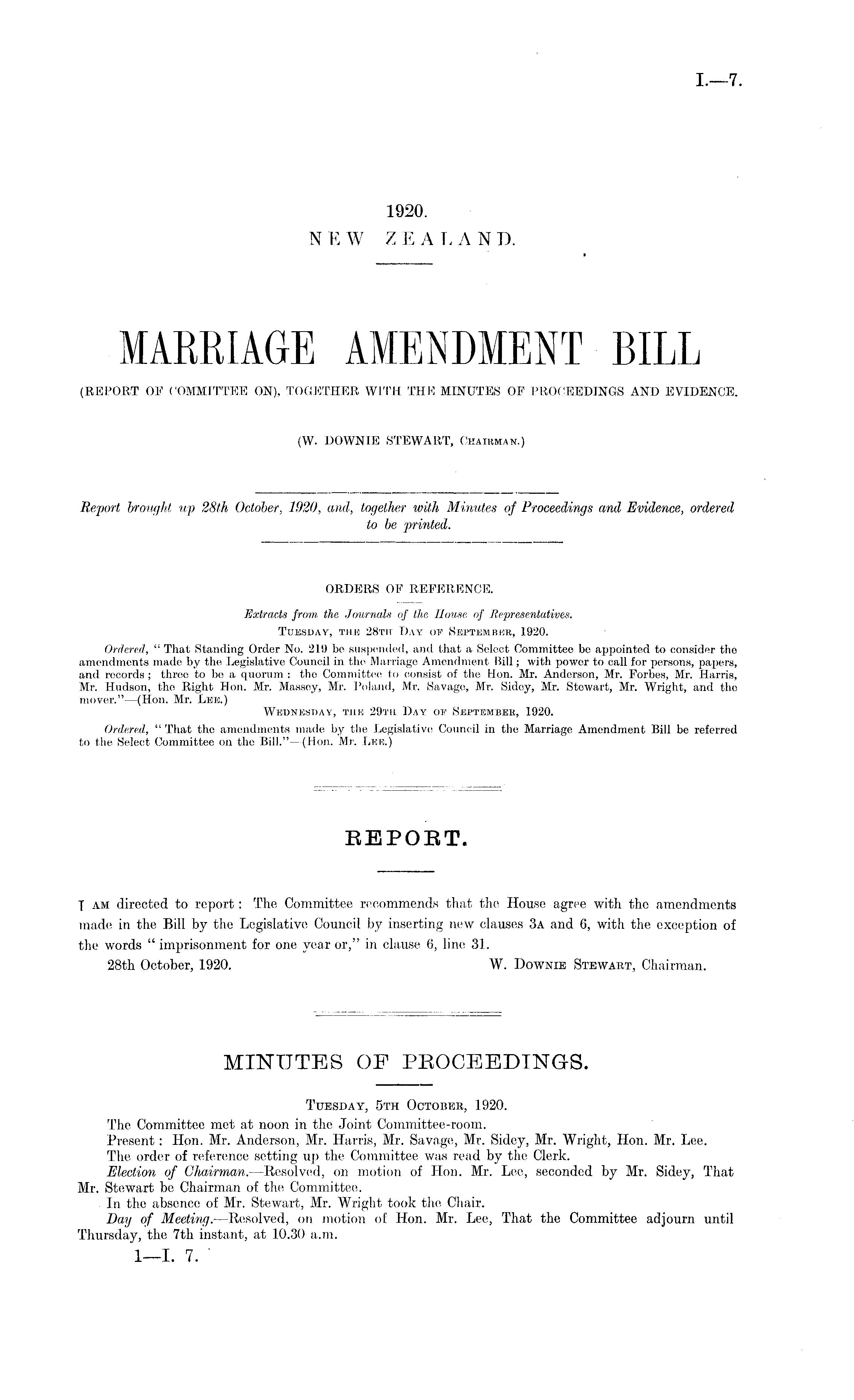 ORDERS OF REFERENCE. Extracts from, the Journals of the House of Representatives. Tuesday, the 28tti Day op September, 1920. Ordered, " That Standing Order No. 219 be suspended, and that a Select Committee be appointed to consider tho amendments made by the Legislative Council in the Marriage Amendment Bill; with power to call for persons, papers, and records ; three to be a quorum : the Committee to consist of the Hon. Mr. Anderson, Mr. Forbes, Mr. Harris, Mr. Hudson, the Right Hon. Mr. Massey, Mr. Poland, Mr. Savage, Mr. Sidcy, Mr. Stewart, Mr. Wright, and the mover." —(Hon. Mr. Lee.) Wednesday, the 29th Day op September, 1920. Ordered, " That the amendments made by the Legislative Council in the Marriage Amendment Bill be referred to the Select Committee on the Bill." —(Hon. Mr. Lee.)