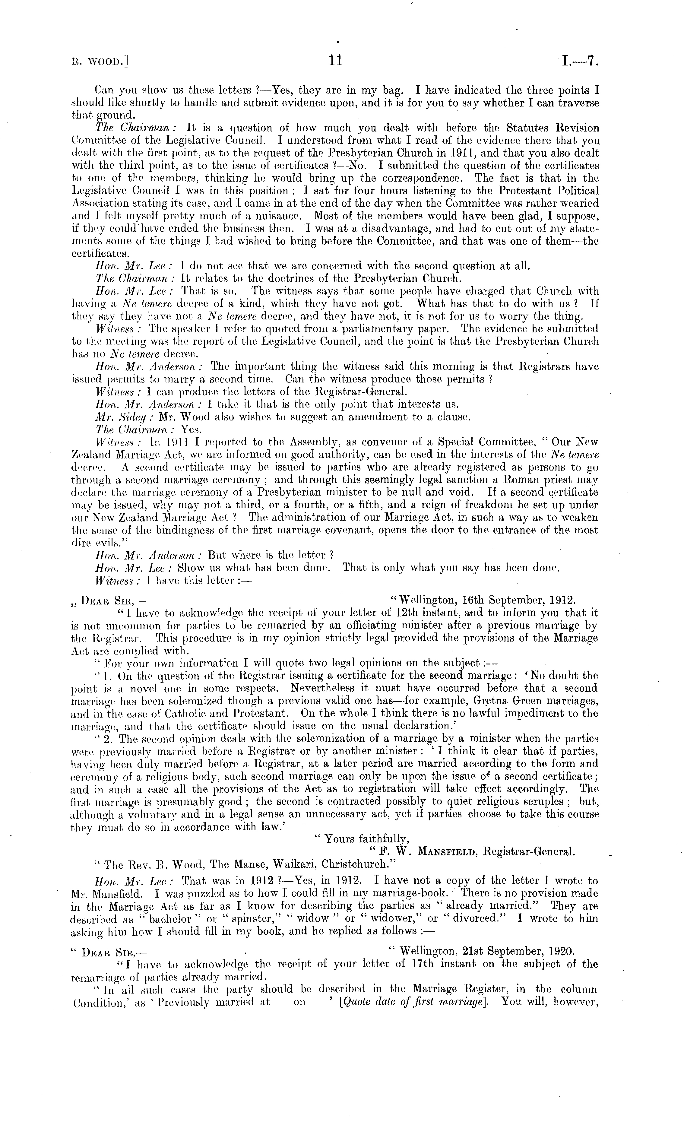 Can you show us these letters ? —Yes, they are in my bag. I have indicated the three points I should like shortly to handle and submit evidence upon, and it is for you to say whether I can traverse that ground. The Chairman : It is a question of how much you dealt with before the Statutes Revision Committee of the Legislative Council. I understood from what I read of the evidence there that you dealt with the first point, as to the request of the Presbyterian Church in 1911, and that you also dealt with the third point, as to the issue of certificates '? —No. I submitted the question of tho certificates to one of the members, thinking he would bring up the correspondence. The fact is that in the Legislative Council 1 was in this position : I sat for four hours listening to the Protestant Political Association stating its case, and I came in at the end of the day when the Committee was rather wearied and I felt myself pretty much of a nuisance. Most of the members would have been glad, I suppose, if they could have ended the business then. I was at a, disadvantage, and had to cut out of my statements some of the things I had wished to bring before the Committee, and that was one of them—the certificates. Hon. Mr. Lee : 1 do not see that we are concerned with the second question at all. The Chairman: It relates to the doctrines of the Presbyterian Church. lion. Mr. Lee : That is so. The witness says that some people, have, charged that Church with having aNe temere decree of a kind, which they have not got. What has that to do with us ? If they say they have, not a Ne temere decree, and they have not, it is not for us to worry the, thing. Witness : The speaker I refer to quoted from a parliamentary paper. The evidence, he submitted to the meeting was the report of the Legislative Council, and the point is that the, Presbyterian Church has no Ne temere decree. Hon. Mr. Anderson: The important thing the witness said this morning is that Registrars have issued, permits to marry a second time. Can the witness produce those, permits ? Witness : I can produce, the letters of the, Registrar-General. Hon. Mr. Anderson : I take it that is the only point that interests us. Mr. Sidey : Mr. Wood also wishes to suggest an amendment to a clause. The Chairman : Yes. Witness : In 1911 I. reported to the Assembly, as convener of a Special Committee, " Our New Zealand Marriage Act, we are informed on good authority, can be, used in the interests of the A T e temere decree. A second certificate may be issued to parties who are already registered as persons to go through a second marriage ceremony ; and through this seemingly legal sanction a Roman priest may declare the marriage ceremony of a Presbyterian minister to be null and void. If a second certificate may be issued, why may not a third, or a fourth, or a fifth, and a reign of freakdom be set up under our New Zoaland Marriage Act ? The administration of our Marriage Act, in such a way as to weaken the sense of the bindingncss of the first marriage covenant, opens the door to the entrance of the most dire evils." Hon. Mr. Anderson : But where, is the, letter ? Hon. Mr. Lee : Show us what has been done. That is only what you say has been done. Witness : 1. have this letter :— „ Dear Sir,— "Wellington, 16th September, 1912. "I have to acknowledge the; receipt of your letter of 12th instant, a-nd to inform you that it is not uncommon for parties to be remarried by an officiating minister after a previous marriage by the Registrar. This procedure is in my opinion strictly legal provided the provisions of the, Marriage, Act are complied with. " For your own information I will quote two legal opinions on the subject:— "1. On the question of the Registrar issuing a certificate, for the second marriage: 'No doubt the, point is a novel one in some: respects. Nevertheless it must have occurred before, that a second marriage has been solemnized though a previous valid one has—for example, Gretna Green marriages, and in the case of Catholic and Protestant. On the whole I think there is no lawful impediment to the marriage, and that the certificate should issue on the usual declaration.' "2. The second opinion deals with the solemnization of a marriage by a minister when the parties were previously married before a Registrar or by another minister : ' I think it clear that if parties, having been duly married before a Registrar, at a later period are married according to the form and ceremony of a religious body, such second marriage can. only be upon the issue of a second certificate; and in such a case all the provisions of the Act as to registration will take effect accordingly. The first marriage is presumably good ; the second is contracted possibly to quiet religious soruples ; but, although a voluntary and in a legal sense an unnecessary act, yet if parties choose to take this course they must do so in accordance with law.' " Yours faithfully, " F. W. Mansfield, Registrar-General. " The Rev. R. Wood, The Manse, Waikari, Christchurch." Hon. Mr. Lee : That was in 1912 ?—Yes, in 1912. I have not a copy of the letter I wrote to Mr. Mansfield, I was puzzled as to how I could fill in my marriage-book.'" There is no provision made in the Marriage Act as far as I know for describing the parties as " already married." They are described as " bachelor " or " spinster," " widow " or " widower," or " divorced." I wrote to him asking him how I should fill in my book, and he replied as follows :— " Dkar Sir,— ■ " Wellington, 21st September, 1920. "I have to acknowledge, the receipt of your letter of 17th instant on the: subject of the remarriage, of parties already married. " In all such cases the party should be described in the Marriage Register, in the column Condition,' as 'Previously married at on ' [Quote dale of first marriage]. You will, however,