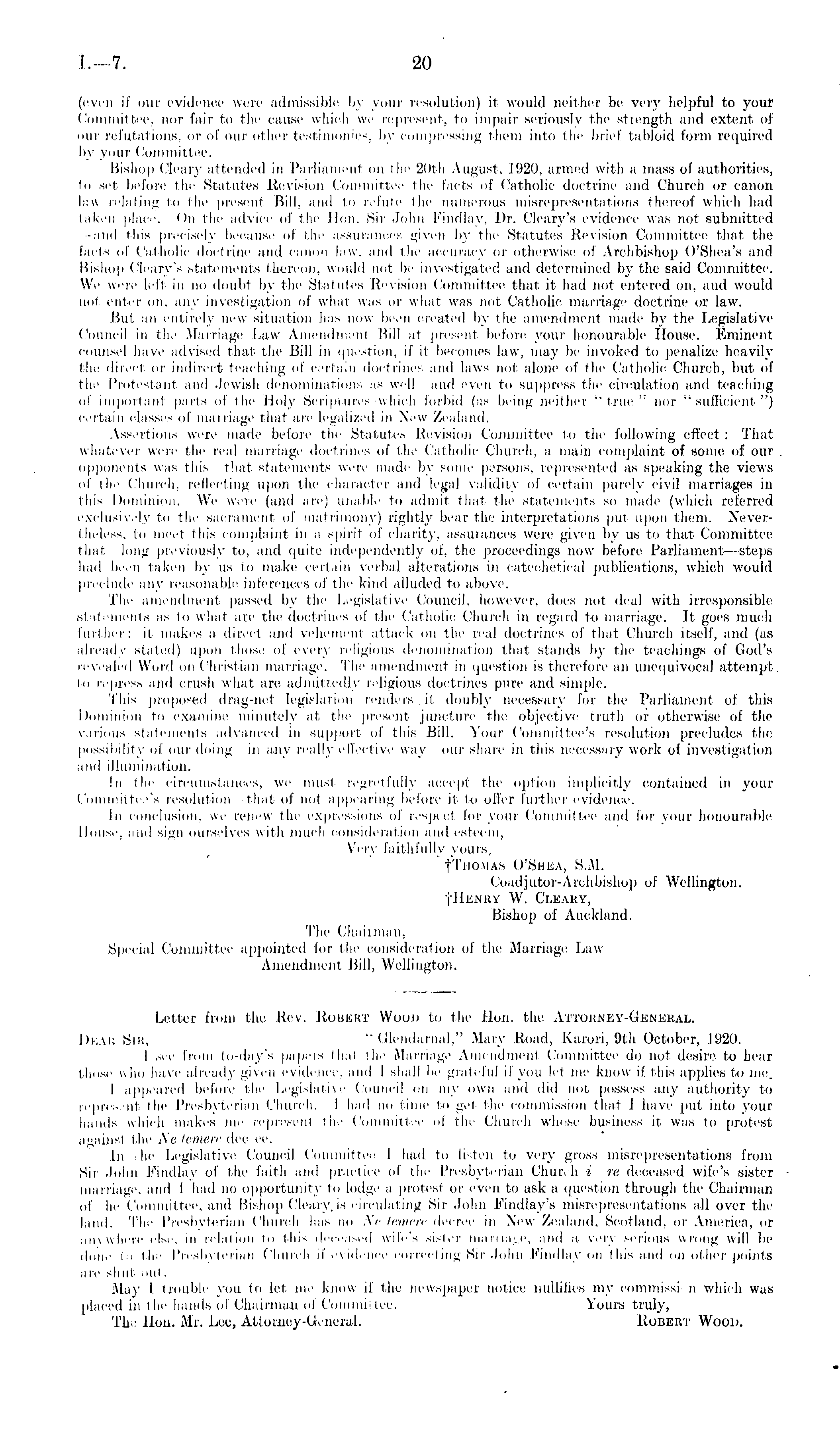 Letter from the Rev. Robert Wood to the Hon. the Attorney-General. Dear Sir,- " Glendarnal," Mary Road, Karori, 9th October, 1920. 1 sec; from to-day's papers that the Marriage Amendment Committee do not desire to hear those who have- already given evidence, and i shall be grateful if you let me know if this applies to nwi. 1 appeared before the Legislative Council on my own and did not possess any authority to represent the Presbyterian Church. ] had no time to get the commission that 1 have put into your hands which makes me represent the Committee of the Church whose business it was to protest against the Ne temere dee.ee. In she Legislative Council Committee J. had to listen to very gross misrepresentations from Sir John Findlay of the faith and practice of the Presbyterian Church i re deceased wife's sister marriage, and I had no opportunity to lodge a protest or even to ask a question through the Chairman of he Committee, and Bishop Cleary. is circulating Sir John Findiay's misrepresentations all over the land. The Presbyterian Church has no Ne temere decree in New Zealand, Scotland, or America, or anywhere else, in relation to this deceased wife's sister marriage, and a very serious wrong will be done to t.lie Presbyterian Church if evidence correcting Sir John Findlay on this and on other points are shut out. May I trouble you to let me know if the newspaper notice nullifies my commissi' n which was placed in the hands of Chairman of Committee. Yours truly, The Hon. Mr. Lee, Attorney-General. Robert Wood.