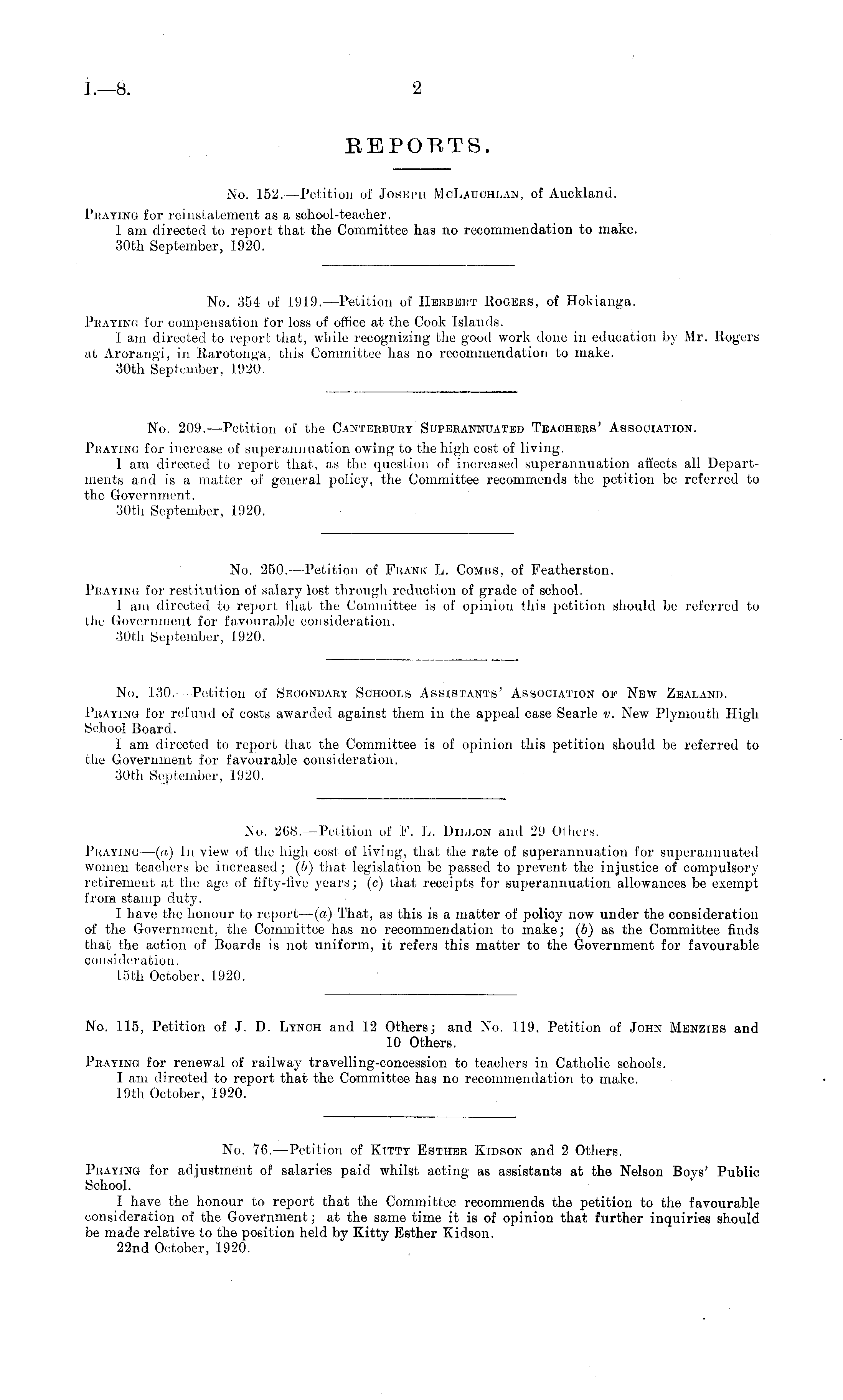 No. 76. —Petition of Kitty Esther Kidson and 2 Others. Praying for adjustment of salaries paid whilst acting as assistants at the Nelson Boys' Public School. I have the honour to report that the Committee recommends the petition to the favourable consideration of the Government; at the same time it is of opinion that further inquiries should be made relative to the position held by Kitty Esther Kidson. 22nd October, 1920.