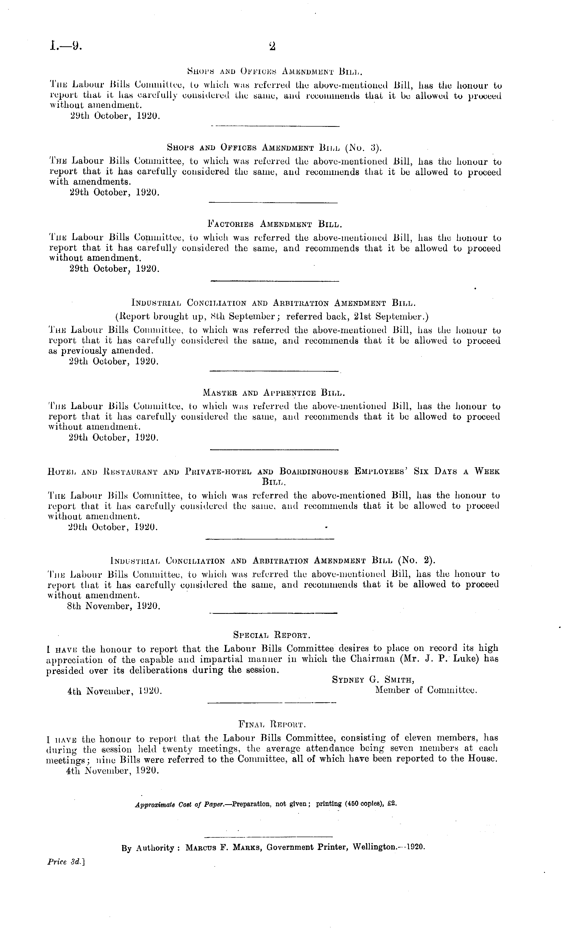Special Report. 1 have the honour to report that the Labour Bills Committee desires to place on record its high appreciation of the capable and impartial manner in which the Chairman (Mr. J. P. Luke) has presided over its deliberations during the session. Sydney G. Smith, 4th November, 1920. Member of Committee. Final Report. 1 HAVE) the honour to report that the Labour Bills Committee, consisting of eleven members, has during the session held twenty meetings, the average attendance being seven members at each meetings; nine Bills were referred to the Committee, all of which have been reported to the House. 4th November, 1920.