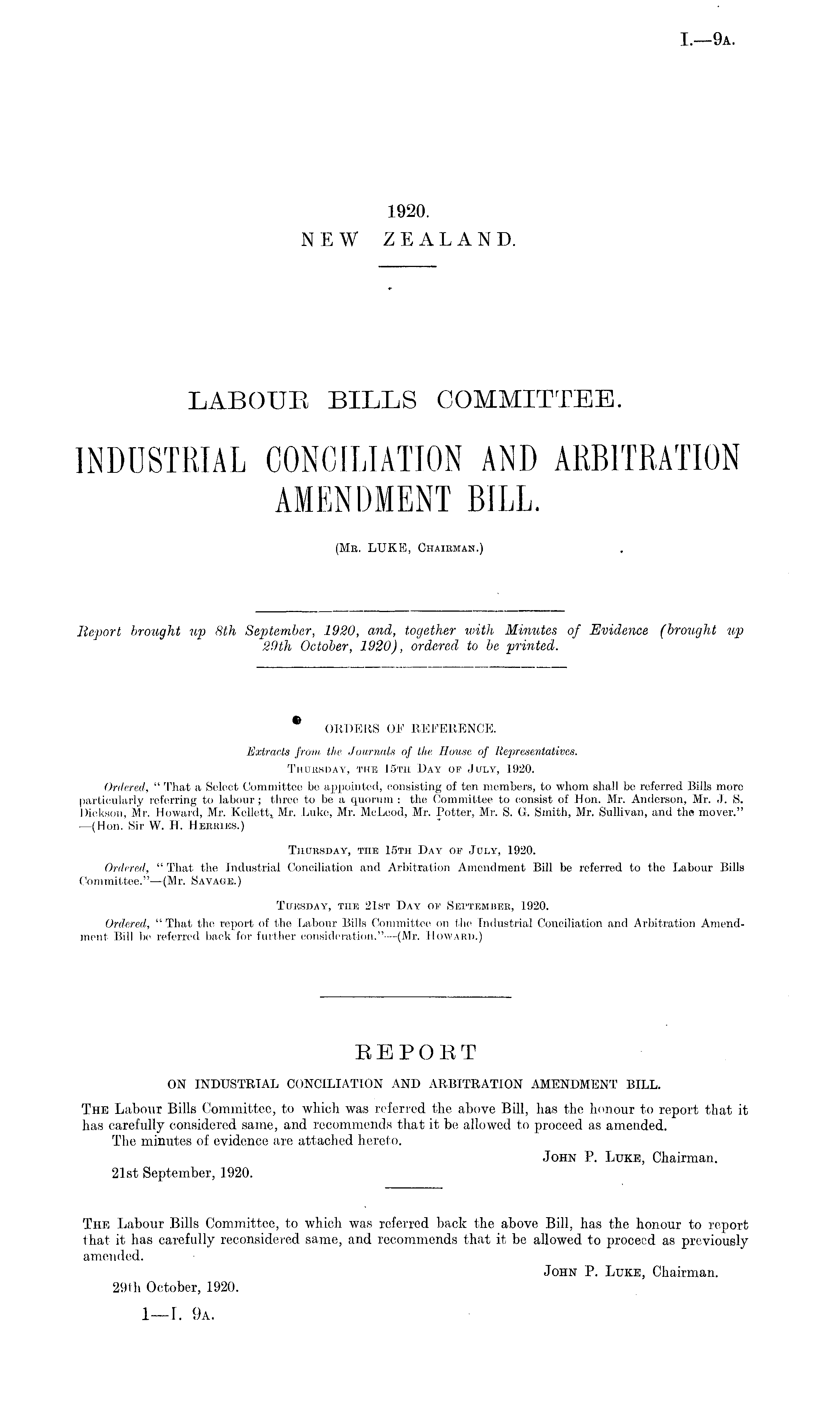* ORDERS OF REFERENCE. Extracts from the Journals of the House of Representatives. Thursday, the 15th Day of July, 1920. Ordered, " That a Select Committee be appointed, consisting of ten members, to whom shall be referred Bills more particularly referring to labour; three to be a quorum : the Committee to consist of Hon. Mr. Anderson, Mr. J. S. Dickson, Mr. Howard, Mr. Kellett l Mr. Luke, Mr. McLeod, Mr. Potter, Mr. S. G. Smith, Mr. Sullivan, and the mover." —(Hon. Sir W. H. Hermes.) Thursday, the 15th Day op July, 1920. Ordered, " That the Industrial Conciliation and Arbitration Amendment Bill be referred to the Labour Bills Committee." —(Mr. Savage.) Tuesday, the 21st Day of September, 1920. Ordered, " That the report of the Labour Bills Committee on the Industrial Conciliation and Arbitration Amendment Bill be referred back for further consideration." —(Mr. Howard.)