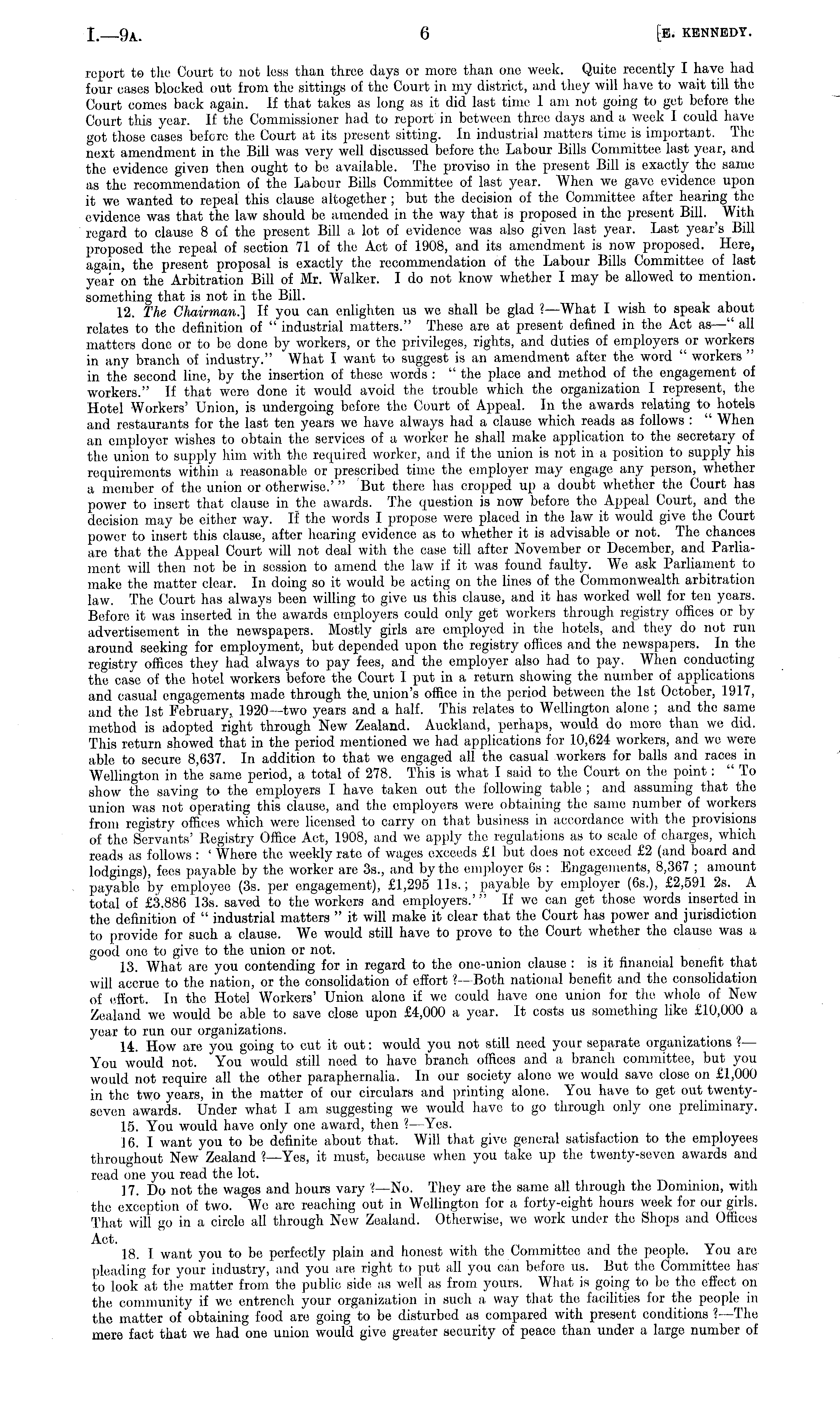 report to the Court to not less than three days or more than one week. Quite; recently I have had four cases blocked out from the sittings of the Court in my district, and they will have to wait till the Court comes back again. If that takes as long as it did last time lam not going to get before the Court this year. If the Commissioner had to report in between three days and a week I could have got those cases before the Court at its present sitting. In industrial matters time is important. The next amendment in the Bill was very well discussed before the Labour Bills Committee last year, and the evidence given then ought to be available. The proviso in the present Bill is exactly the same as the recommendation of the Labour Bills Committee of last year. When we gave evidence! upon it we wanted to repeal this clause altogether ; but the decision of the Committee after hearing the evidence was that the law should be amended in the way that is proposed in the present Bill. With regard to clause Bof the present Bill a lot of evidence was also given last year. Last year's Bill proposed the repeal of section 71 of the Act of 1908, and its amendment is now proposed. Here, again, the present proposal is exactly the recommendation of the Labour Bills Committee of last year on the Arbitration Bill of Mr. Walker. Ido not know whether I may be allowed to mention, something that is not in the Bill. 12. The Chairman.] If you can enlighten us we shall be glad ?—What I wish to speak about relates to the definition of " industrial matters." These are at present defined in the Act as—" all matters done or to be done by workers, or the privileges, rights, and duties of workers in any branch of industry." What I want to suggest is an amendment after the word " workers " in the second line, by the insertion of these words : " the place and method of the engagement of workers." If that were done it would avoid the trouble which the organization I represent, the Hotel Workers' Union, is undergoing before the Court of Appeal. In the awards relating to hotels and restaurants for the last ten years we have always had a clause which reads as follows : " When an employer wishes to obtain the services of a worker he shall make application to the secretary of the union to supply him with the required worker, and if the union is not in a position to supply his requirements within a reasonable or prescribed time the employer may engage any person, whether a member of the union or otherwise.' " But there has cropped up a doubt whether the Court has power to insert that clause in the awards. The question is now before the Appeal Court, and the decision may be either way. If the words I propose were placed in the law it would give the Court power to insert this clause, after hearing evidence as to whether it is advisable or not. The chances are that the Appeal Court will not deal with the case till after November or December, and Parliament will then not be in session to amend the law if it was found faulty. We ask Parliament to make the matter clear. In doing so it would be acting on the lines of the Commonwealth arbitration law. The Court has always been willing to give us this clause, and it has worked well for ten years. Before it was inserted in the awards employers could only get workers through registry offices or by advertisement in the newspapers. Mostly girls are employed in the hotels, and they do not run around seeking for employment, but depended upon the registry offices and the newspapers. In the registry offices they had always to pay fees, and the employer also had to pay. When conducting the case of the hotel workers before the Court I put in a return showing the number of applications and casual engagements made through the. union's office in the period between the Ist October, 1917, and the Ist February, 1920—two years and a half. This relates to Wellington alone ; and the same method is adopted right through New Zealand. Auckland, perhaps, would do more than we did. This return showed that in the period mentioned we had applications for 10,624 workers, and we were able to secure 8,637. In addition to that we engaged all the casual workers for balls and races in Wellington in the same period, a total of 278. This is what I said to the Court on the point: "To show the saving to the employers I have taken out the following table ; and assuming that the union was not operating this clause, and the employers were obtaining the same number of workers from registry offices which were licensed to carry on that business in accordance with the provisions of the Servants' Registry Office Act, 1908, and we apply the regulations as to scale of charges, which reads as follows : ' Where the weekly rate of wages exceeds £1 but does not exceed £2 (arid board and lodgings), fees payable by the worker are 35., and by the employer 6s : Engagements, 8,367 ; amount payable by employee (3s. per engagement), £1,295 lis.; payable by employer (65.), £2,591 2s. A total of £3.886 13s. saved to the workers and employers.' " If wo can get those words inserted m the definition of " industrial matters " it will make it clear that the Court has power and jurisdiction to provide for such a clause. Wo would still have to prove to the Court whether the clause was a good one to give to the union or not. 13. What are you contending for in regard to the one-union clause : is it financial benefit that will accrue to the nation, or the consolidation of effort ?—Both national benefit and the consolidation of effort. In the Hotel Workers' Union alone if we could have one union for the whole of New Zealand we would be able to save close upon £4,000 a year. It costs us something like £10,000 a year to run our organizations. 14. How are you going to cut it out: would you not still need your separate organizations ?— You would not. You would still need to have branch offices and a branch committee, but you would not require all 