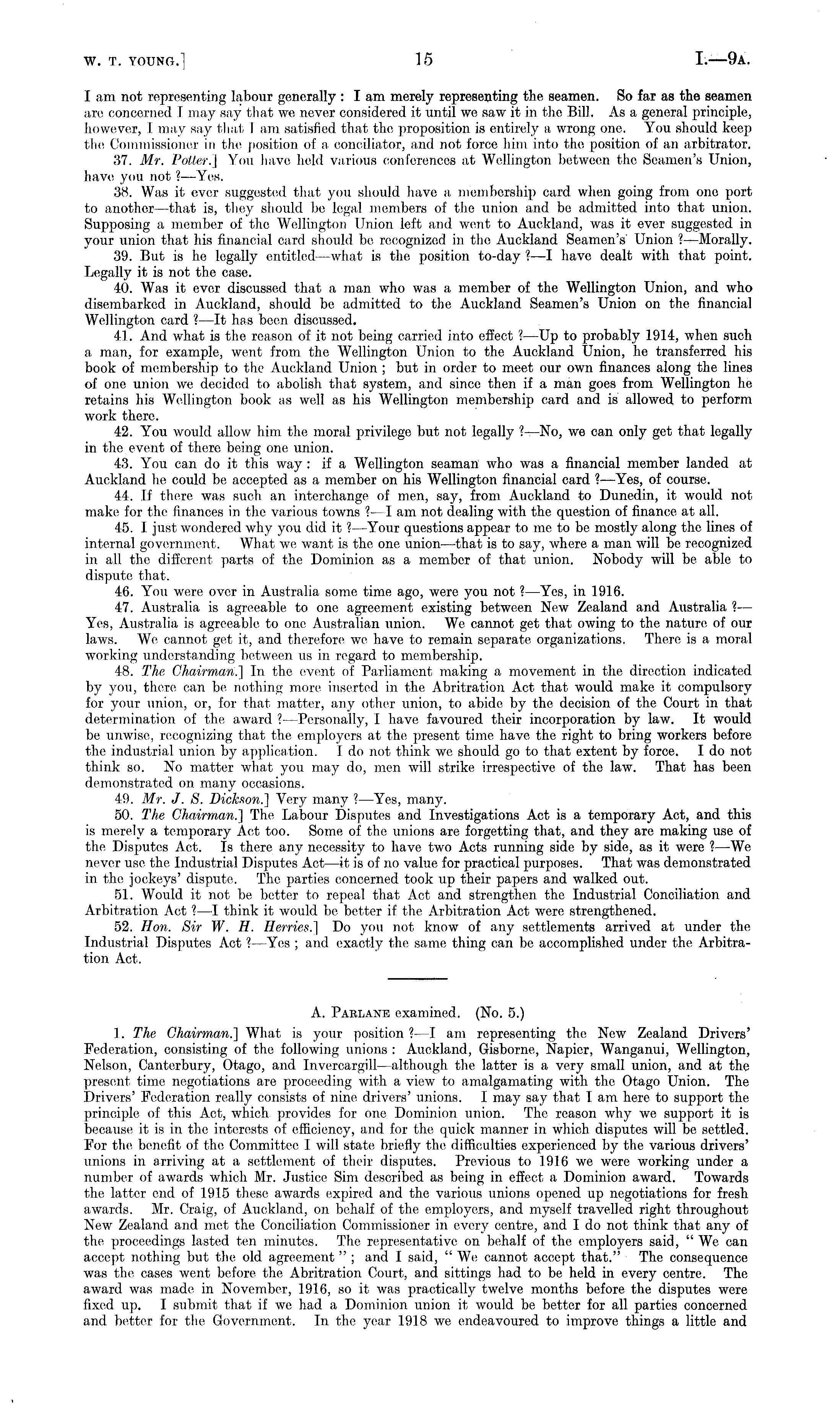lam not representing labour generally : lam merely representing the seamen. So far as the seamen are concerned I may say that we never considered it until wo saw it in the Bill. As a general principle, however, I may say that lam satisfied that the proposition is entirely a wrong one. You should keep the Commissioner in the position of a conciliator, and not force him into the position of an arbitrator. 37. Mr. Potter.] You have held various conferences at Wellington between the Seamen's Union, have you not ? —Yes. 38. Was it ever suggested that you should have a, membership card when going from one port to another—that is, they should be legal members of the union and be admitted into that union. Supposing a member of tho Wellington Union left and went to Auckland, was it ever suggested in your union that his financial card should be recognized in the Auckland Seamen's Union ?—Morally. 39. But is he legally entitled —what is the position to-day ? —I have dealt with that point. Legally it is not the case. 40. Was it ever discussed that a man who was a member of the Wellington Union, and who disembarked in Auckland, should be admitted to the Auckland Seamen's Union on the financial Wellington card ? —lt has been discussed. 41. And what is the reason of it not being carried into effect ? —Up to probably 1914, when such a man, for example, went from the Wellington Union to the Auckland Union, he transferred his book of membership to the Auckland Union ; but in order to meet our own finances along the lines of one union we decided to abolish that system, and since then if a man goes from Wellington he retains his Wellington book as well as his Wellington membership card and is allowed to perform work there. 42. You would allow him the moral privilege but not legally ?—No, we can only get that legally in the event of there being one union. 43. You can do it this way : if a Wellington seaman who was a financial member landed at Auckland he could be accepted as a member on his Wellington financial card ? —Yes, of course. 44. If there was such an interchange of men, say, from Auckland to Dunedin, it would not make for the finances in the various towns ? —I am not dealing with the question of finance at all. 45. I just wondered why you did it ? —Your questions appear to me to be mostly along the lines of internal government. What we want is the one union—that is to say, where a man will be recognized in all the different parts of the Dominion as a member of that union. Nobody will be able to dispute that. 46. You were over in Australia some time ago, were you not ? —Yes, in 1916. 47. Australia is agreeable to one agreement existing between New Zealand and Australia ? — Yes, Australia is agreeable to one Australian union. We cannot get that owing to the nature of our laws. We cannot get it, and therefore we have to remain separate organizations. There is a moral working understanding between us in regard, to membership. 48. The Chairman.] In the event of Parliament making a movement in the direction indicated by you, there can be nothing more inserted in the Abritration Act that would make it compulsory for your union, or, for that matter, any other union, to abide by the decision of the Court in that determination of the award ? —Personally, I have favoured their incorporation by law. It would be unwise, recognizing that the employers at the present time have the right to bring workers before the industrial union by application. Ido not think we should go to that extent by force. Ido not think so. No matter what you may do, men will strike irrespective of the law. That has been demonstrated on many occasions. 49. Mr. J. S. Dickson.] Very many ? —Yes, many. 50. The Chairman.] The Labour Disputes and Investigations Act is a temporary Act, and this is merely a temporary Act too. Some of the unions are forgetting that, and they are making use of the Disputes Act. Is there any necessity to have two Acts running side by side, as it were ?—We never use the Industrial Disputes Act—it is of no value for practical purposes. That was demonstrated in the jockeys' dispute. The. parties concerned took up their papers and walked out. 51. Would it not be better to repeal that Act and strengthen the Industrial Conciliation and Arbitration Act I—l1 —I think it would be better if the Arbitration Act were strengthened. 52. Hon. Sir W. H. Herries.] Do you not know of any settlements arrived at under the Industrial Disputes Act ? —Yes ; and exactly the same thing can be accomplished under the Arbitration Act. A. Paklane examined. (No. 5.) 1. The Chairman.] What is your position ? —I am representing the New Zealand Drivers' Federation, consisting of the following unions : Auckland, Gisborne, Napier, Wanganui, Wellington, Nelson, Canterbury, Otago, and Invercargill —although the latter is a very small union, and at the present time negotiations are proceeding with a view to amalgamating with tho Otago Union. The Drivers' Federation really consists of nine drivers' unions. I may say that lam here to support the principle of this Act, which provides for one Dominion union. The reason why we support it is because it is in the interests of efficiency, and for the quick manner in which disputes will be settled. For the benefit of the Committee I will state briefly the difficulties experienced by the various drivers' unions in arriving at a settlement of their disputes. Previous to 1916 we were working under a number of awards which Mr. Justice Sim described as being in effect a Dominion award. Towards the latter end of 1915 these awards expired and the various unions opened up negotiations for fresh awards. Mr. Craig, of Auckland, on behalf of the employers, and myself travelled right throughout New Zealand and met the Conciliation Commissioner in every centre, and I do not think that any of the proceedings lasted ten minutes. The representative on behalf of the employers said, "