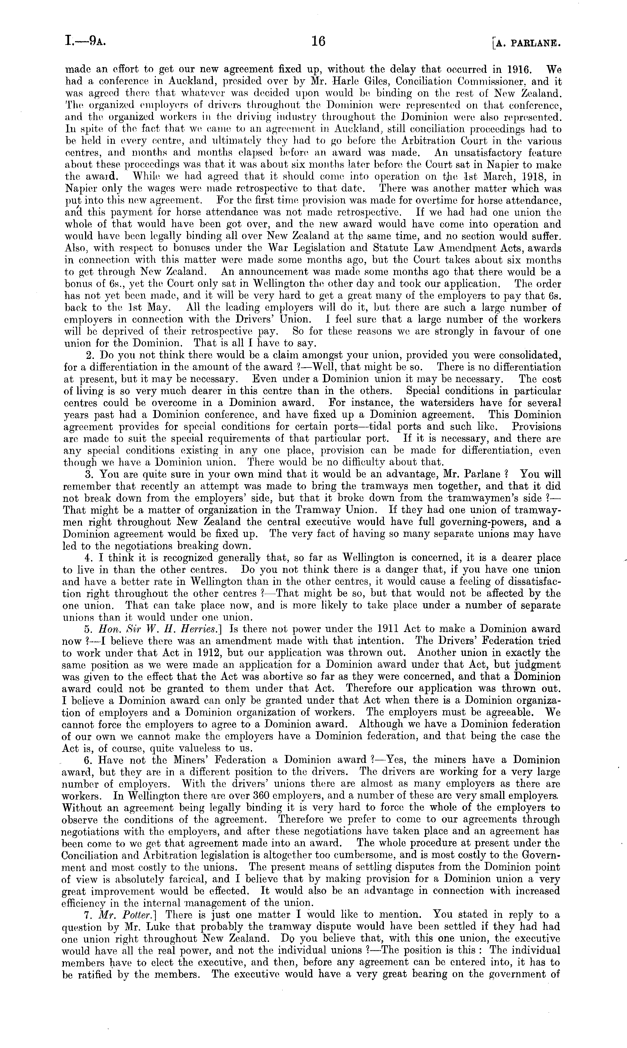 made an effort to get our new agreement fixed up, without the delay that occurred in 1916. We had a conference in Auckland, presided over by Mr. Harle Giles, Conciliation Commissioner, and it was agreed there that whatever was decided upon would be binding on the rest of New Zealand. The organized employers of drivers throughout the Dominion were represented on that conference, and the organized workers in the driving industry throughout the Dominion were also represented. In spite of the fact that we came to an agreement in Auckland, still conciliation proceedings had to be held in every centre, and ultimately they had to go before the Arbitration Court in the various centres, and months and months elapsed before an award was made. An unsatisfactory feature about these proceedings was that it was about six months later before the Court sat in Napier to make the award. While we had agreed that it should come into operation on the Ist March, 1918, in Napier only the wages were made retrospective to that date. There was another matter which was put into this new agreement. For the first time provision was made for overtime for horse attendance, and this payment for horse attendance was not made retrospective. If we had had one union the whole of that would have been got over, and the new award would have come into operation and would have been legally binding all over New Zealand at the same time, and no section would suffer. Also, with respect to bonuses under the War Legislation and Statute Law Amendment Acts, awards in connection, with this matter were made some months ago, but the Court takes about six months to get through New Zealand. An announcement was made some months ago that there would be a bonus of 65., yet the Court only sat in Wellington the other day and took our application. The order has not yet been made, and it will be very hard to get a great many of the employers to pay that 6s. back to the Ist May. All the leading employers will do it, but there are such a large number of employers in connection with the Drivers' Union. I feel sure that a large number of the workers will be deprived of their retrospective pay. So for these reasons we are strongly in favour of one union for the Dominion. That is all I have to say. 2. Do you not think there would be a claim amongst your union, provided you were consolidated, for a differentiation in the amount of the award ?—Well, that might be so. There is no differentiation at present, but it may be necessary. Even under a Dominion union it may be necessary. The cost of living is so very much dearer in this centre than in the others. Special conditions in particular centres could be overcome in a Dominion award. For instance, the watersiders have for several years past had a Dominion conference, and have fixed up a Dominion agreement. This Dominion agreement provides for special conditions for certain ports —tidal ports and such like. Provisions are made to suit the special requirements of that particular port. If it is necessary, and there are any special conditions existing in any one place, provision can be made for differentiation, even though we have a Dominion union. There would be no difficulty about that. 3. You are quite sure in your own mind that it would be an advantage, Mr. Parlane ? You will remember that recently an attempt was made to bring the tramways men together, and that it did not break down from the employers' side, but that it broke down from the tramwaymen's side ? — That might be a matter of organization in the Tramway Union. If they had one union of tramwaymen right throughout New Zealand the central executive would have full governing-powers, and a Dominion agreement would be fixed up. The very fact of having so many separate unions may have led to the negotiations breaking down. 4. I think it is recognized generally that, so far as Wellington is concerned, it is a dearer place to live in than the other centres. Do you not think there is a danger that, if you have one union and have a better rate in Wellington than in the other centres, it would cause a feeling of dissatisfaction right throughout the other centres ? —That might be so, but that would not be affected by the one union. That can take place now, and is more likely to take place under a number of separate unions than it would under one union. 5. Hon. Sir W. 11. Herries.] Is there not power under the 1911 Act to make a Dominion award now ? —I believe there was an amendment made with that intention. The Drivers' Federation tried to work under that Act in 1912, but our application was thrown out. Another union in exactly the same position as we were made an application for a Dominion award under that Act, but judgment was given to the effect that the Act was abortive so far as they were concerned, and that a Dominion award could not be granted to them under that Act. Therefore our application was thrown out. I believe a Dominion award can only be granted under that Act when there is a Dominion organization of employers and a Dominion organization of workers. The employers must be agreeable. We cannot force the employers to agree to a Dominion award. Although we have a Dominion federation of our own we cannot make the employers have a Dominion federation, and that being the case the Act is, of course, quite valueless to us. 6. Have not tho Miners' Federation a Dominion award ?—Yes, the miners have a Dominion award, but they are in a different position to the drivers. The drivers are working for a very large number of employers. With the drivers' unions there are almost as many employers as there are workers. In Wellington there are over 360 employers, and a number of these are very small employers. Without an agreement being legally binding it is very hard to force the whole of the employers to observe the conditions of the agreement. Therefore we prefer to come to our agreements through negotiations with the employers, and after these ne