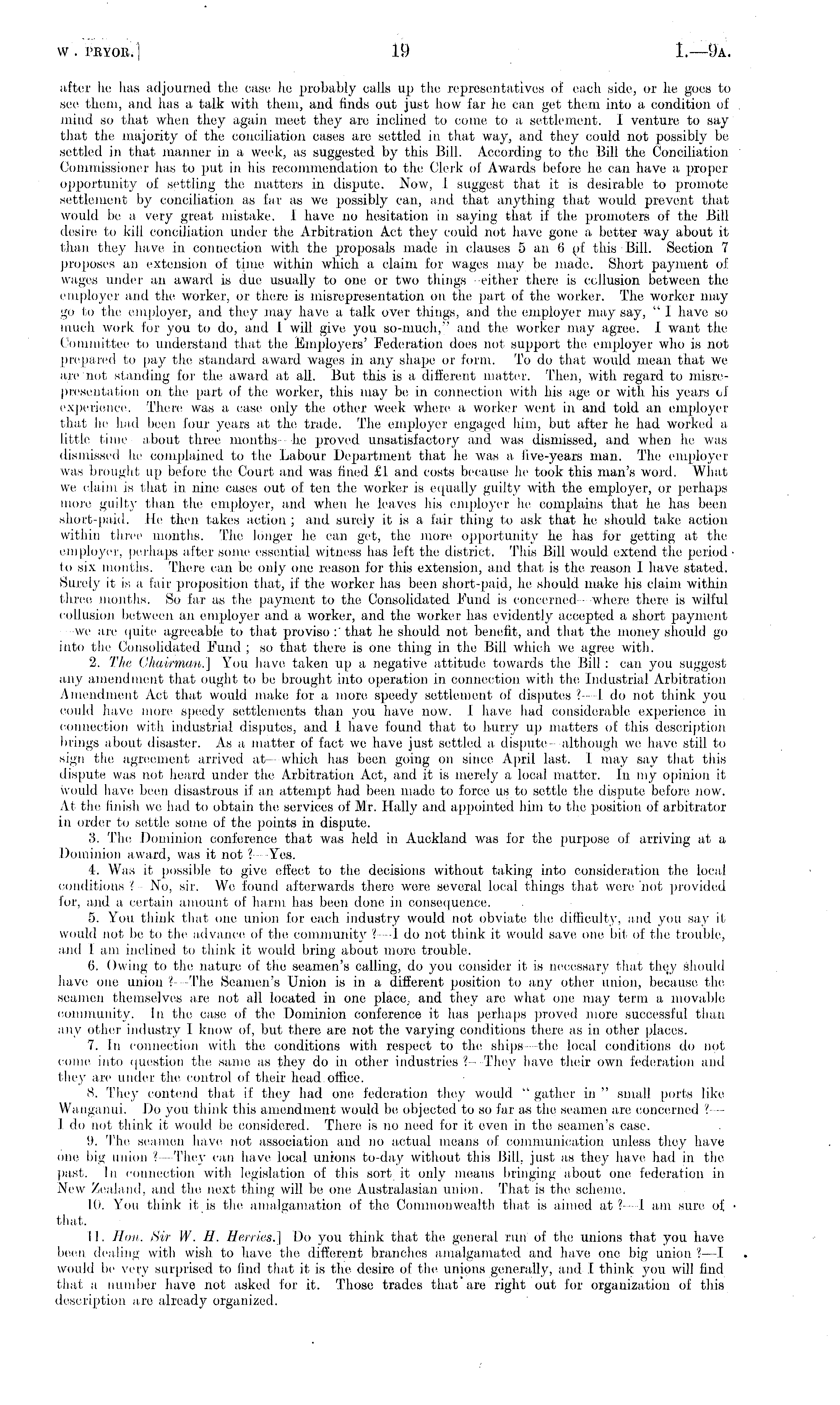 after he has adjourned the ease he, probably calls up the representatives of each side, or he goes to see them, and has a talk with them, and finds out just how far he can get them into a condition of mind so that when they again meet they are inclined to come to a settlement. I venture, to say that the majority of the conciliation cases an; settled in that way, and they could not possibly be settled in that manner in a week, as suggested by this Bill. According to the Bill the Conciliation Commissioner has to put in his recommendation to the Clerk of Awards before he can have a- proper opportunity of settling the matters in dispute. Now. I suggest that, if is desirable to promote settlement by conciliation as far as we possibly can, and that anything that would prevent that would be a very great mistake. I have no hesitation in saying that if the promoters of the Bill desire to kill conciliation under the Arbitration Act they could not have gone a- better way about it than they have in connection with the proposals made in clauses 5 an (i of this Bill. Section 7 proposes an extension of time within which a. claim for wages may be made. Short payment of wages under an award is due usually to one or two things either there is collusion between the employer and the worker, or there is misrepresentation on the part of the worker. The worker may go to the employer, and they may have a. talk over things, and the employer may say, " 1 have so much work for you to do, and I will give you. so-much," and the worker may agree. I want the Committee to understand that the Employers' Federation does not support the employer who is not prepared to pay the standard award wages in any shape or form. To do that would mean that we are not, standing for the award at all. But this is a different matter. Then, with regard to misrepresentation on the part of the worker, this may be in connection with his age or with his years of experience. There was a ease only the other week where a worker went in and told, an employer that lie had been four years at the trade. The employer engaged him, but after he had worked a little lime about three months he proved unsatisfactory and was dismissed, and when he was dismissed he complained to the Labour Department that he was a live-years man. The employer was brought up before the Court and was fined £1 and costs because he took this man's word. What we c}aim is that in nine cases out of ten the worker is equally guilty with the employer, or perhaps more guilt)- than (lie employer, and when lie leaves his employer he complains thai, he, has been short-paid, lie then takes action; and surely it is a fair thing to ask that he should take action within three months. The longer he can get, the more opportunity he has for getting at the employer, perhaps after some essential witness has left the district. This Hill would extend the period to six months. There can be only one reason for this extension, and that is the reason I have stated. Surely it is a fair proposition that, if the worker has been short paid, he should make his claim within three months. So far as tile payment to the Consolidated Fund is concerned where there is wilful collusion between an employer and a worker, and the worker has evidently accepted a short payment we are quite agreeable to that proviso :'that he should not benefit, and that the money should go into the Consolidated Fund ; so that, there is one tiling in the Bill which we agree with. 2. The Chairman.] You have, taken up a negative attitude towards the Bill : can you suggest any amendment that ought to be brought into operation in connection with the, Industrial Arbitration Amendment Act that would make for a more speedy settlement of disputes '. I do not think yon could have more speedy settlements than you have now. 1 have had considerable experience in connection with industrial disputes, and. I have found that to hurry up matters of this description brings about disaster. As a matter of fact we have just settled a. dispute although we have still to sign the agreement arrived at- which has been going on since April last,. 1 may say I hat this dispute was not heard under the Arbitration Act, and it is merely a local matter. In my opinion it would have been disastrous if an attempt had been made to force us to settle the dispute before now. At the finish we had to obtain the services of Mr. Hally and appointed him to the position of arbitrator in order to settle some of the points in dispute. 3. The Dominion conference that was held in Auckland was for the, purpose, of arriving at a, Dominion award, was it not ? Yes. 4. Was it, possible to give effect to the decisions without taking into consideration the local conditions ?—No, sir. We found afterwards there were, several local things thai were not provided lor, and a certain amount of harm has been done in consequence. 5. You think that one union for each industry would not obviate, the difficulty, and you say it, would not be to the advance of the community ?—-I do not think it would save one bit of the trouble, and 1 am inclined to think it would bring about more trouble. 6. Owing to the nature of the seamen's calling, do you consider it is necessary that, they should have one union ? The Seamen's Union is in a, different position to any other union, because the seamen themselves are not all located in one place, and they are what one may term a movable community. In the case of the Dominion conference it has perhaps proved more successful than any other industry 1 know of, but there are not the varying conditions there as in oilier places. 7. In connection with the conditions with respect to the ships the local conditions do not, come into question the same as they do in other industries?- They have their own federation and the) - are under the control of their head office. 8. They contend that if they had one federation they would " gather in " small ports like Wanganui. Do you thi