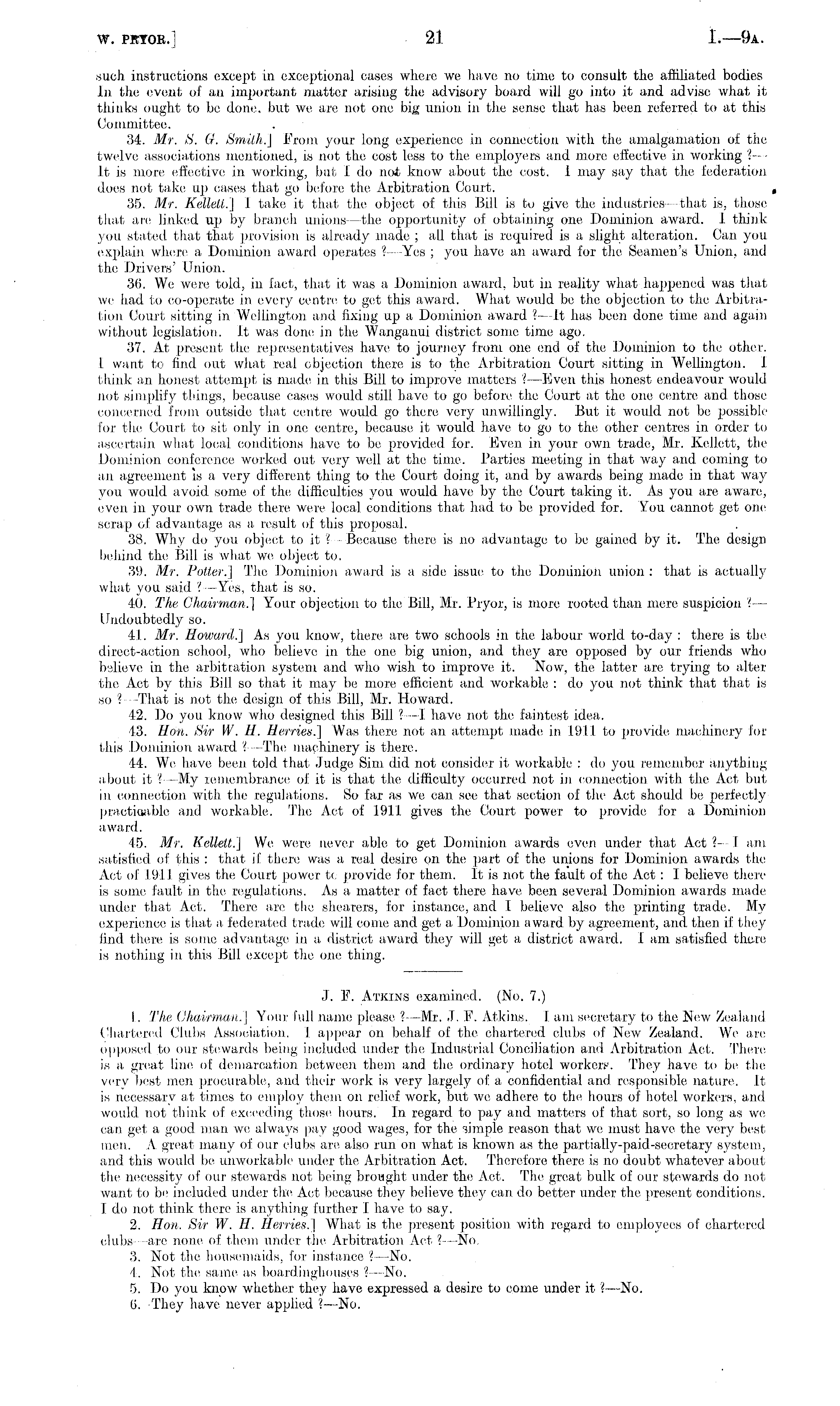 such instructions except in exceptional cases where we, have, no time to consult the affiliated bodies In the event of an important matter arising the advisory board will go into it and advise what it thinks ought to bo done, but we are not one big union in the sense that has been referred to at this Committee. 34. Mr. S. 67. Smith.] From your long experience in connection with the amalgamation of the twelve associations mentioned, is not the cost less to the employers and more effective in working ?- It is more effective in working, but Ido not know about the cost. I may say that the federation does not take up eases that go before the Arbitration Court. , 35. Mr. Keilett.] I take it that the object of this Bill is to give the industries- that is, those that are linked up by branch unions -the opportunity of obtaining one Dominion award. I think you stated that that provision is already made ; all that is required is a slight alteration. Can you explain where a Dominion award operates ? Yes ; you have an award for the Seamen's Union, and the Drivers' Union. 36. We were told, in fact, that it was a Dominion award, but in reality what happened was that we had to co-operate in every centre to get this award. What would bo the objection to the Arbitration Court sitting in Wellington and fixing up a Dominion award ? -It has been done time and again without legislation. It was done in the Wanganui district some time ago. 37. At present the representatives have to journey from one end of the Dominion to the other. 1 want to find out what real objection there is to the Arbitration Court sitting in Wellington. 1 think an honest attempt is made in this Bill to improve matters ? —Even this honest endeavour would not simplify things, because cases would still have to go before the Court at the one centre and those concerned from outside that centre would go there very unwillingly. But it would not be possible for the Court to sit only in one centre, because it would, have to go to the other centres in order to ascertain what local conditions have to be, provided for. Even in your own trade, Mr. Keilett, the Dominion conference worked out very well at the time. Parties meeting in that way and. coming to an agreement is a very different thing to the Court doing it, and by awards being made in that way you would avoid some of the difficulties you would have by the Court taking it. As you are aware, even in your own trade there, were local conditions that had to be provided for. You cannot get one scrap of advantage as a, result of this proposal. 38. Why do you object to it ? Because there is no advantage to be gained by it. The design behind the Bill is what we object to. 39. Mr. Potter.] The Dominion award is a side issue to the Dominion union : that is actually what you said? — Yes, that is so. 40. The Chairman.] Your objection to the Bill, Mr. Pryor, is more rooted than mere suspicion ? — Undoubtedly so. 41. Mr. Howard.] As you know, there are two schools in the labour world to-day : there is the direct-action school, who believe in the one big union, and they are opposed by our friends who believe in the arbitration system and who wish to improve it. Now, the latter are, trying to alter the Act by this Bill so that it may be more efficient and workable, : do you not think that that is so ? That is not the design of this Bill, Mr. Howard. 42. Do you know who designed this Bill ? -I have not the, faintest idea. 13. Hon. Sir W. 11. Herries.] Was there not an attempt made in 1911 to provide machinery for this Dominion award ? -The machinery is there. 44. We have been told that Judge Sim did not consider it workable : do you remember anything about it ? -My remembrance of it is that the difficulty occurred not in connection with the Act but in connection with the regulations. So far as we can see that section of the Act should be perfectly practicable and workable. The Act of 1911 gives the Court power to provide for a, Dominion award. 45. Mr. Keilett.] We were never able to get Dominion awards even under that Act? 1 am satisfied of this : that if there was a real desire on the part of the unions for Dominion awards the Act of 191.1 gives the Court power to provide for them. It is not the fault of the Act : I believe, there is some fault in the regulations. As a matter of fact there have been several Dominion awards made under that Act. There are the, shearers, for instance, and 1 believe also the printing trade. My experience is that a, federated trade will come and get a Dominion award by agreement, and then if they find there is some advantage in a, district award they will get a, district award. lam satisfied there is nothing in this Bill except the one thing. J. F. Atkins examined. (No. 7.) 1. The Chairman.] Your full name please ? Mr. J. F. Atkins. lam secretary to the New Zealand Chartered Clubs Association. I. appear on behalf of the chartered clubs ofNNc r Zealand. We are opposed to our stewards being included under the Industrial Conciliation and Arbitration Act. There is a great line of demarcation between them and the ordinary hotel workers. They have to be the very best men procurable, and their work is very largely of a confidential and responsible nature. It is necessary at times to employ them on relief work, but we adhere to the hours of hotel workers, and would not think of exceeding those hours. In regard to pay and matters of that sort, so long as we, can get a good, man we always pay good wages, for the simple reason that we must have the very best men. A great many of our clubs are also run on what is known as the partially-paid-secretary system, and this would be unworkable under the Arbitration Act. Therefore there is no doubt whatever about the necessity of our stewards not being brought under the Act. The great bulk of our stewards do not, want to be included under the Act because they believe they can do better under the present conditions. I do not think there is anyth