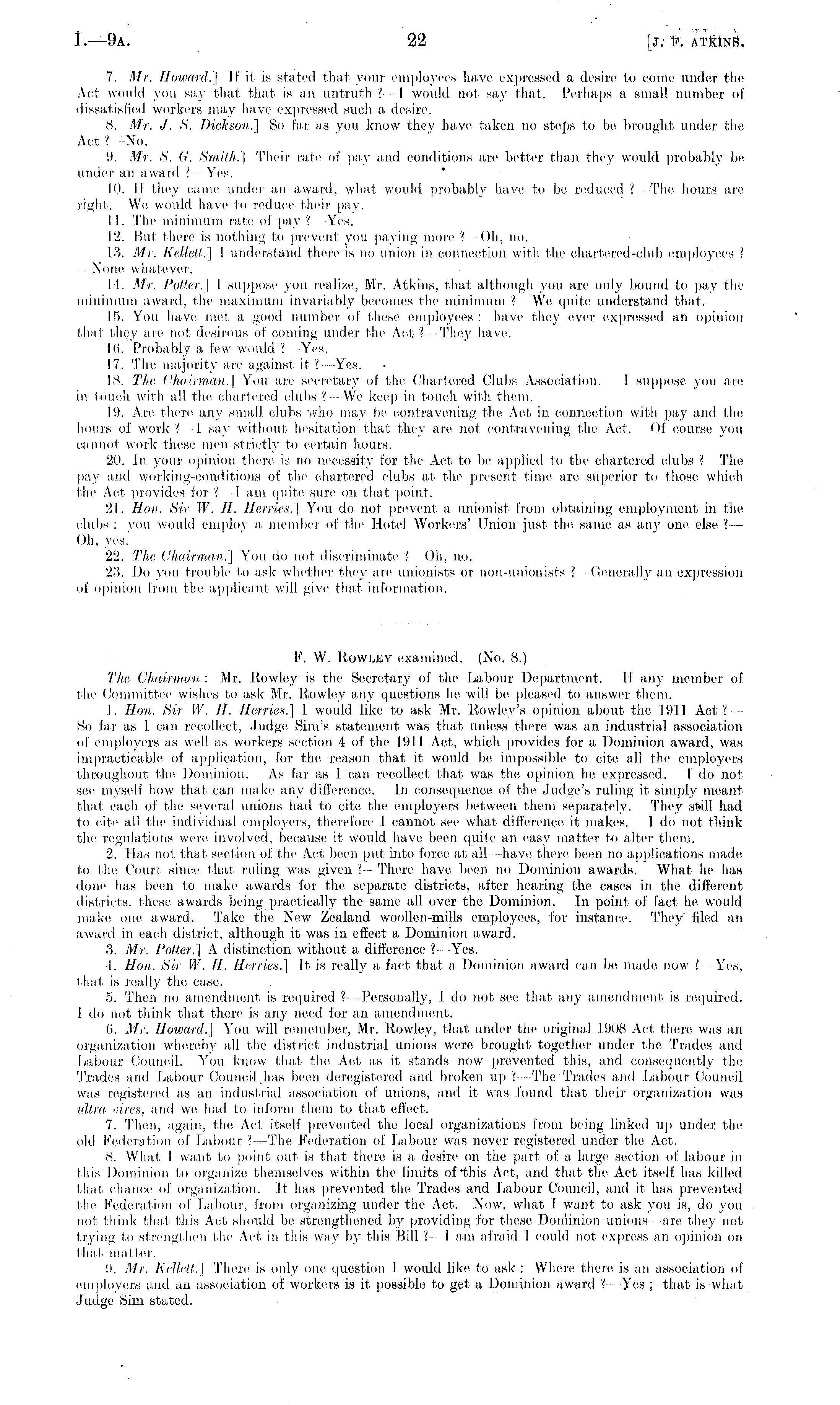 7. Mr. Iloirard.} If it is stated that your employees have expressed a desire to come under the Ad would you say thai that is an untruth '. I would not say that. Perhaps a small number of dissatisfied workers may have expressed such a, desire. 8. Mr. J. S. Dickson. |So far as you know they have taken no steps to be brought under the Act ? -No. 9. Mr. S. 67. Smith.\ Their rate of pay arid conditions are better than they would probably !»' under an award ( Yes. 10. If they came under an award, what would probably have to be reduced t The hours are light. We would have to reduce their pay. 11. The minimum rate of pay ?- Yes. 12. But, there is nothing to prevent you paying more ? Oh, no. 13. Mr. Keilett.] I understand there is no union in connection with the chartered-club employees ? ■ None whatever. 11. Mr. Potter.\ I suppose you realize, Mr. Atkins, that although you are only bound to pay the minimum award, the maximum invariably becomes the minimum '. We quite understand that. 15. You have met a good number of these employees: have they ever expressed an opinion that, they are not desirous of coming under the Act ? They have. 10. Probably a few would ? Yes. 17. The majority are against it ? Yes, 18. The You are secretary of the Chartered Clubs Association. I suppose you are in touch with all the chartered clubs ? We keep ill touch with them. 19. Are there any small clubs who may be contravening the Act in connection with pay and the hours of work? I say without hesitation that they are not contravening the Act. Of course you cannot work these men strictly to certain hours. 20. in your opinion there is no necessity for the Act to be applied to the chartered clubs ? The pay and working-conditions of the chartered clubs at the present time are superior to those which the Act provides for ? lam quite sure on that point. 21. Hon. Sir W. 11. Herries. | You do not prevent a unionist from obtaining employment in the clubs : you would employ a member of the Hotel Workers' Union just the same as any one else ? — Oh. yes.' 22. The Chairman.] You do not discriminate ( Oh. no. 23. Do you trouble to ask whether they are unionists or non-unionists I Generally an expression of opinion from the applicant will give that information. F. W. RoWI.KY examined. (No. 8.) The Chmrmam : Mr. Rowley is the Secretary of the Labour Department. If any member of the Committee wishes to ask Air. Rowley any questions he will be pleased to answer them. 1. Hon. Sir W. H. Herries.] I. would like to ask Mr. Rowley's opinion about the 1911 Act? So far as 1 can recollect, Judge Sim's statement was that unless there was an industrial association of employers as well as workers section 4 of the 1911 Act, which provides for a Dominion award, was impracticable of application;, for the reason that it would be impossible to cite all the employers throughout the. Dominion, As far as I can recollect that was the opinion he expressed. Ido not; see myself how that can make any difference. In consequence of the Judge's ruling it simply meant that each of the several unions had to cite the employers between them separately. They still had to cite all the individual employers, therefore I. cannot see what difference it makes. I do not think Ihe regulations were involved, because it would have been quite an easy matter to alter them. 2. Has not that section of the Act been put into force at all -have there been no applications made to the Court since that ruling was given >. There have been no Dominion awards. What he has done has been to make awards for the separate districts, after hearing the cases in the different districts, these awards being practically the same all over the Dominion. In point of fact, he would make one award. Take the New Zealand woollens-mills employees, for instance. They filed an award in each, district, although it was in effect, a Dominion award. 3. Mr. Potter.] A distinction without a difference ? Yes. 1. Hon. Sir W. 11. Herries.] It is really a fact that a Dominion award can be made now '. Yes, that is really the case. 5. Then no amendment is required ? Personally 1 , Ido not see that any amendment is required. 1 do not think that there is any need for an amendment. 6. Mr. Howard.] You will remember, Mr. Rowley, that under the original 1908 Act there was an organization whereby all the district industrial unions -wen: brought together under the Trades and Labour Council. You know that the Act as it stands now prevented this, and consequently the Trades and Labour Council has been dorogistered and broken up ? The Trades and Labour Council was registered as an industrial association of unions, and it was found that their organization was idtra vires, and we had to inform them to that effect. 7. Then, again, the Act itself prevented the local organizations from being linked up under the old Federation of Labour ? -The Federation of Labour was never registered under the Act,. 8. What I want to point out is that there is a desire on the part of a large section of labour in this Dominion to organize themselves within the limits of "this Act, and that the Act itself has killed that chance of organization, It has prevented the Trades and Labour Council, and it has prevented the Federation of Labour, from organizing under the Act. Now, what I want to ask you is, do you not think that this Act: should be strengthened by providing for these Dominion unions ate they not trying to strengthen the Act in this way by this Bill ? lam afraid I could not express an opinion on that matter. 9. Mr. Keilett.] There is only one question 1 would like to ask : When; there is an association of employers and an association of workers is it possible to get a. Dominion award ? Yes ; that is what Judge Sim stated.