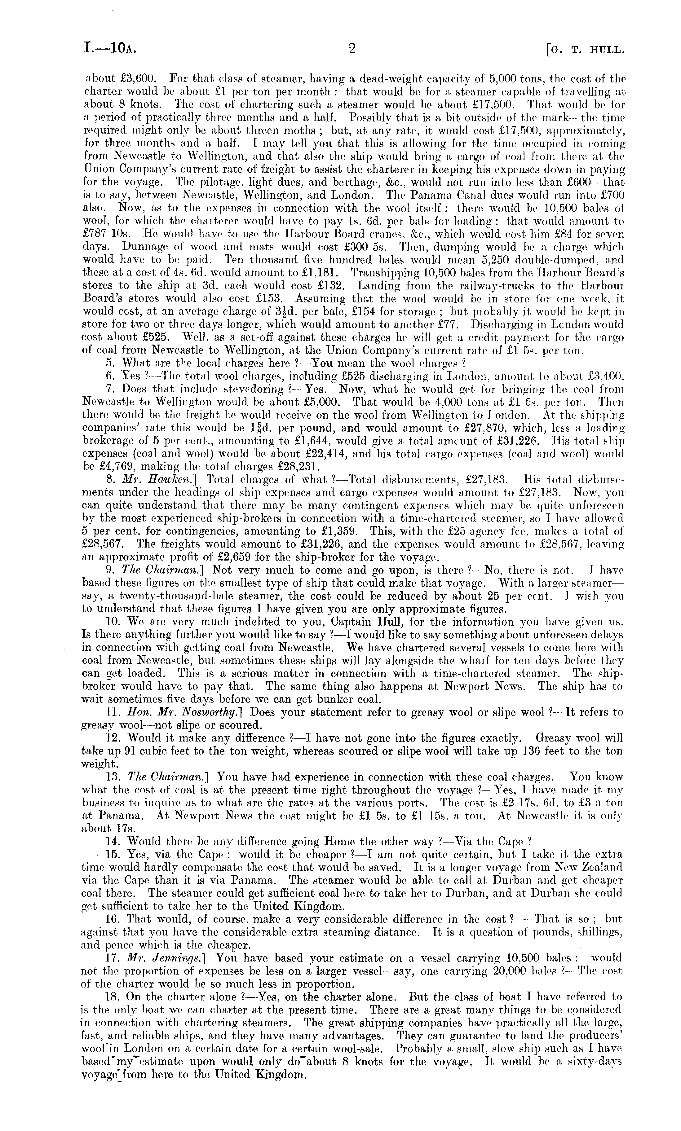 about £3,000. For that class of steamer, having a dead-weight capacity of 5,000 tons, the cost of the charter would Ike about £1 per ton per month : that would bo for a steamer capable of travelling at about 8 knots. The cost of chartering such a steamer would be about £17,500. That would be for a period of practically three months and a half. Possibly that is a, bit outside of the mark the time required might only be about throen moths ; but, at any rate, it would cost £f7,500, approximately, for three months and. a half. I may tell you that this is allowing for the time occupied in coming from Newcastle to Wellington, and that also the, ship would bring a cargo of coal from there at the Union Company's current rate of freight to assist the charterer in keeping his expenses down in paying for the voyage. The pilotage, light dues, and berthage, &c, would not run into less than £600—that is to say, between Newcastle, Wellington, and London. The Panama Canal dues would run into £700 also. Now, as to the expenses in connection with the wool itself : there would bo 10,500 bales of woo], for which the charterer would have to pay Is. 6d. per bale I'm- loading : that would amount to £787 10s. He would have to use the Harbour Board cranes, &■<-., which would cost him £84 for seven days. Dunnage of wood and mats would cost £300 ss. Then, dumping would bo a charge which would have to be paid. Ten thousand five, hundred bales would mean 5,250 double-dumped, and these at a cost of 4s. 6d. would amount to £1,181. Transhipping 10,500 bales from the Harbour Board's stores to the ship at 3d. each would cost £132. Landing from the railway-trucks to the Harbour Board's stores would also cost £153. Assuming that the wool would be in store for one week, it would cost, at an average charge of 3-Jd. per bale, £154 for storage ; but probably it would be kept in store for two or three days longer, which would amount to another £77. Discharging in London would cost about £525, Well, as a set-off against these charges In- will get a credit payment for the cargo of coal from Newcastle to Wellington, at the Union Company's current rate of £1 ss. per lon. 5. What are the local charges here ? —You mean the. wool charges 1 6. Yes ? —The total wool charges, including £525 discharging in London, amount to about £3,400. 7. Does that include stevedoring ?—Yes. Now, what lie would get for bringing the coal from Newcastle to Wellington would be. about £5,000. That would be 4,000 tons at £1 ss. per lon. Then there would, be the freight he would receive on the wool from Wellington to I ondon. At the shipping companies' rate this would be lfd. per pound, and would (.'mount to £27.870, which, less a loading brokerage, of 5 per cent., amounting to £1,644, would give a total amount of £31,226. His total ship expenses (coal and wool) would be about £22,414, and his total cargo expenses (coal and wool) would be £4,769, making the total charges £28,231. 8. Mr. Ilawken.] Total charges of what ?—Total disbursements, £27,183. His total disbursements under the headings of ship expenses and cargo expenses would amount to £27,183. Now, you can quite understand that there may be many contingent expenses which may be quite unforeseen by the most experienced ship-brokers in connection with a time-chartered steamer, so I have allowed 5 per cent, for contingencies, amounting to £1,359. This, with the £25 agency fee, makes a total of £28,567. The freights would amount to £31,226, and the expenses would amount to £28,567, leaving an approximate profit of £2,659 for tin- ship-broker for the voyage. 9. The Chairman.] Not very much to come and go upon, is there ?—No, there is not. I have based theso figures on the smallest type of ship that could make that voyage. With a larger steamer — say, a twenty-thousand-bale steamer, the cost could be reduced by about 25 per cent. I wish you to understand that these figures I have given you are only approximate figures. 10. We are very much indebted to you, Captain Hull, for the information you have given us. Is there anything further you would like to say ? —I would like to say something about unforeseen delays in connection with getting coal from Newcastle. We have chartered several vessels to come here with coal from Newcastle, but sometimes these ships will lay alongside the wharf for ten days before they can get loaded. This is a serious matter in connection with a time-chartered steamer. The shipbroker would have to pay that. The same thing also happens at Newport News. Tho ship has to wait sometimes five days before we can get bunker coal. 11. Hon. Mr. Nosworthy.] Does your statement refer to greasy wool or slipe wool ? —Tt refers to greasy wool —not slipe or scoured. 12. Would it make any difference ?—I have not gone into the figures exactly. Greasy wool will take up 91 cubic feet to the ton weight, whereas scoured or slipe wool will take up 130 feet to the ton weight. 13. The Chairman.] You have had experience in connection with these coal charges. You know what the cost of coal is at the present time right throughout the voyage ?— Yes, I have made it my business to inquire as to what are the rates at the various ports. Tho cost is £2 17s. 6d, to £3 a ton at Panama. At Newport News the cost might be £1 ss. to £1 15s. a ton. At Newcastle it is only about 17s. 14. Would there be any difference going Home tho other way ?—Via the Cape ? ■ 15. Yes, via the Cape : would it be, cheaper ?—I am not quite certain, but T take it the extra time would hardly compensate the cost that would be saved. It is a longer voyage from New Zealand via the Cape, than it is via Panama. The steamer would be able to call at Durban and get cheaper coal there. Tho steamer could get sufficient coal here to take her to Durban, and at Durban she could get sufficient to take her to tho United Kingdom. 16. That would, of course, make a very considerable difference 