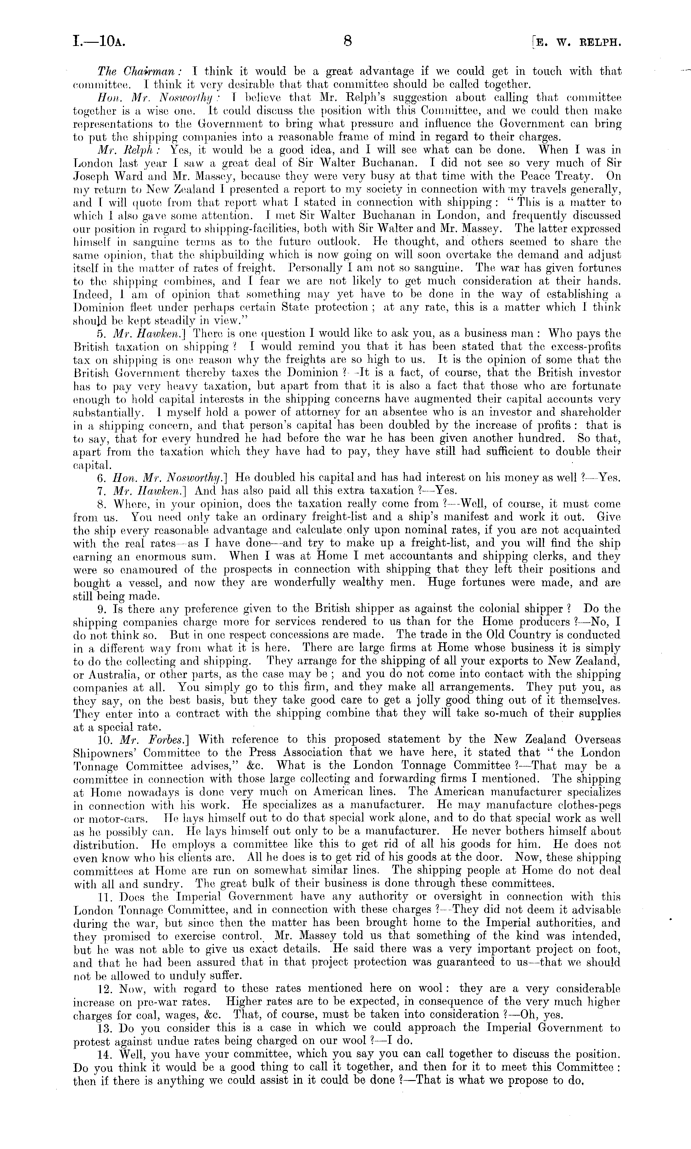 The Chairman : I think it would be a great advantage if we could get in touch with that committee. I think it very desirable that that committee should bo, called together. Hon. Mr. Nosworlhy : I believe that Mr. Relph's suggestion about calling that committee together is a wise, one. It could discuss the position with this Committee, and we, could then make representations to the Government to bring what pressure and influence tho Government can bring to put the, shipping companies into a reasonable frame, of mind in regard to their charges. Mr. Relph : Yes, it would be a good idea, and I will see what can bo done. When 1 was in London last year I saw a groat deal of Sir Walter Buchanan. I did not see, so very much of Sir Joseph Ward and Mr. Massey, because they were very busy at that time with the Peace Treaty. On my return to New Zealand I presented a report to my society in connection with my travels generally, and I will quote from that report what I stated in connection with, shipping : " This is a matter to which I also gave some attention. I met Sir Walter Buchanan in London, and frequently discussed our position in regard to shipping-facilities, both with Sir Walter and Mr. Massey. The latter expressed himself in sanguine terms as to tho future outlook. He thought, and others seemed to share the same opinion, that the shipbuilding which is now going on will soon overtake the demand and adjust itself in tho matter of rates of freight. Personally lam not so sanguine. The war has given fortunes to the shipping combines, and I fear we are not, likely to get much consideration at their hands. Indeed, 1 am of opinion that something may yet have to be done in the way of establishing a Dominion fleet under perhaps certain State protection ; at any rate, this is a, matter which 1 think should be, kept steadily in view." 5. Mr. Hawken.] There is one question I would like, to ask you, as a business man : Who pays the British, taxation on shipping ? I would remind you that it has been stated that the excess-profits tax on shipping is one reason why the freights are so high to us. It is the opinion of some that tho. British Government thereby taxes tho Dominion ?—lt is a fact, of course, that the, British investor has to pay very heavy taxation, but apart from that it is also a fact that those who are fortunate (Enough to hold capital interests in. the shipping concerns have augmented their capital accounts very substantially. I myself hold a power of attorney for an absentee who is an investor and shareholder in a shipping concern, and that person's capital has been doubled by the increase of profits : that is to say, that for every hundred he had before tho war he has been given another hundred. So that, apart from the taxation which they have had to pay, they have still had sufficient to double their capital. 6. Hon. Mr. Nosworthy.] Ho doubled his capital and has had interest on his money as well ?—Yes. 7. Mr. Hawken.] And has also paid all this extra taxation ?—Yes. 8. Where, in your opinion, does the taxation really come from ? —Well, of course, it must come from us. You need only take an ordinary freight-list and a ship's manifest and work it out. Give the ship every reasonable advantage and calculate. only upon nominal rates, if you are not acquainted with the real rates —as I have done —and try to make up a freight-list, and you will find the ship (Earning an enormous sum. When I was at Home I met accountants and shipping clerks, and they were so enamoured of the prospects in connection with shipping that they left their positions and bought a vessel, and now they are wonderfully wealthy men. Huge fortunes were made, and are still being made. 9. Is there, any preference given to the British shipper as against the colonial, shipper ? Do the shipping companies charge more for services rendered to us than for the Home producers ? —No, I do not think so. But in one respect concessions are made. The trade in the Old Country is conducted in a different way from what it is here. There are large firms at Homo whose, business it is simply to do the collecting and shipping. They arrange for the shipping of all your exports to New Zealand, or Australia, or other parts, as the case may be ; and. you do not come into contact with the shipping companies at all. You simply go to this firm, and they make all arrangements. They put you, as they say, on the best basis, but they take good care, to get a jolly good thing out of it themselves. They enter into a contract with the shipping combine that they will take so-much of their supplies at a special rate. 10. Mr. Forbes.] With reference to this proposed statement by the, New Zealand Overseas Shipowners' Committee to the Press Association that wo, have, here, it stated that " the London Tonnage Committee advises," <fee. What is the London Tonnage Committee ?—That may bo, a committee in connection, with those large, collecting and forwarding firms I mentioned. The shipping at Home nowadays is done very much on American lines. The American manufacturer specializes in connection with his work. He specializes as a manufacturer. He may manufacture clothes-pegs or motor-oars. He lays himself out to do that special work alone, and to do that special work as well as he, possibly can. He lays himself out only to be a manufacturer. He never bothers himself about distribution. He employs a committee like this to got rid of all his goods for him. Hie does not oven know who his clienis are. All Ike does is to get rid of his goods at the door. Now, these shipping committees at Home are run on somewhat similar lines. The shipping people, at Home do not deal with all and sundry. The great bulk of their business is done through these, committees. 11. Does the. Imperial Government have any authority or oversight in connection with this London Tonnage Committee, and in connection with these charges ?- They did not deem it advisable during the, war, but s