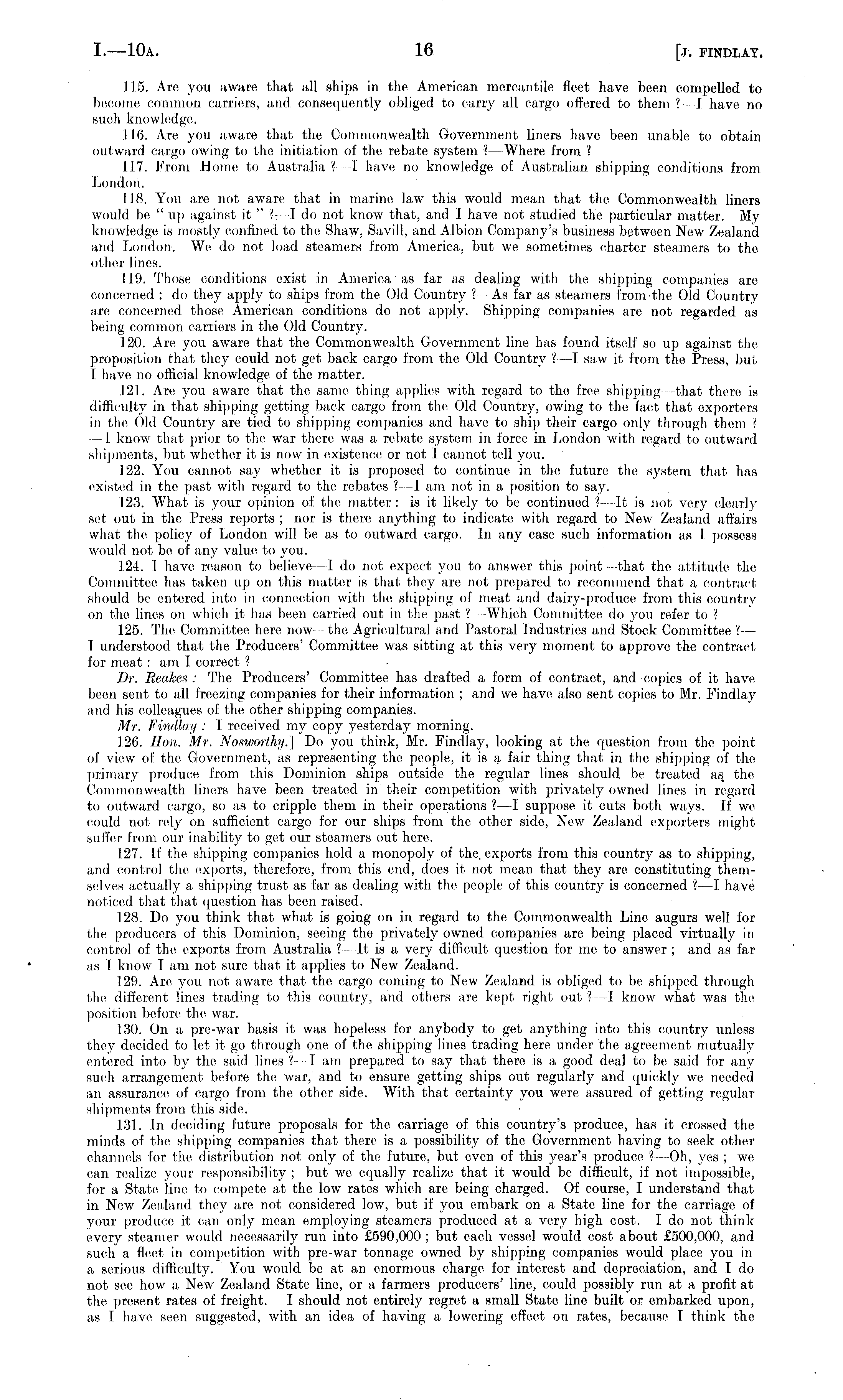 115. Are you aware that all ships in the American mercantile fleet have been compelled to become common carriers, and. consequently obliged to carry all cargo offered to them ?—1 have, no such knowledge,. 116. Are, you aware that the Commonwealth Government liners have been unable to obtain outward cargo owing to the, initiation of the rebate system ? —Where from ? 117. From Home to Australia ? I have no knowledge, of Australian shipping conditions from London. 118. You are not aware that in marine, law this would, mean that the, Commonwealth liners would be "up against it "?--I do not know that, and I have not studied the particular matter. My knowledge is mostly confined to the Shaw, Savill, and Albion Company's business between New Zealand and London. We do not load steamers from America, but we sometimes oharter steamers to the other lines. 119. Those conditions exist in America as far as dealing with the, shipping companies are concerned :do they apply to ships from the Old Country ? As far as steamers from the Old Country are concerned those American conditions do not apply. Shipping companies are not regarded as being common carriers in the Old Country. 120. Are you aware that the Commonwealth Government line has found itself so up against the, proposition that they could not get back cargo from the Old Country ? I saw it, from the Press, but, I have no official knowledge, of the matter. 121. Are you aware that the same thing applies with regard to the free shipping that there is difficulty in that shipping getting back cargo from the Old Country, owing to tho fact that exporters in the Old Country are tied to shipping companies and have to ship their cargo only through them '. —3 know that prior to the war there was a rebate system in force in London with regard to outward shipments, but whether it is now in existence or not 1 cannot tell you. 122. You cannot say whether it is proposed to continue in the future the system that has existed in the past with regard to the rebates ?—I am not in a position to say. 123. What is your opinion of the matter: is it likely to be continued ? It is not very clearly set out in the Press reports ; nor is there anything to indicate with regard to New Zealand affairs what the policy of London will be as to outward cargo. In any ease such information as I possess would not be of any value to you. 124. I have reason to believe —I do not expect you to answer this point—that the attitude, the Committee has taken up on this matter is that they are not prepared to recommend that a contract should be, entered into in connection with the shipping of meat and dairy-produce from this country on the lines on which it has been carried out in the past ? Which Committee do you refer to ? 125. The Committee here now- the. Agricultural and Pastoral Industries and Stock Committee ?— I understood that the Producers' Committee was sitting at this very moment to approve the contract for meat : am I correct ? Dr. Reakes : The Producers' Committee has drafted a form of contract, and copies of it have been sent to all freezing companies for their information ; and we have also sent copies to Mr. Findlay and his colleagues of the other shipping companies. Mr. Findlay : I received my copy yesterday morning. 126. Hon. Mr. Nosworthy.] Do you think, Mr. Findlay, looking at the question from the point of view of the Government, as representing the people, it is a fair thing that in the, shipping of the primary produce from this Dominion ships outside the regular Hikes should be treated as; the Commonwealth liners have been treated in their competition with privately owned lines in regard to outward cargo, so as to cripple them in their operations ? —I suppose it cuts both ways. If we could not rely on sufficient cargo for our ships from the other side, New Zealand exporters might suffer from our inability to get our steamers out here. 127. If the shipping companies hold a monopoly of the, exports from this country as to shipping, and control the exports, therefore, from this end, does it not mean that they are constituting themselves actually a shipping trust as far as dealing with the, people of this country is concerned ? —I have, noticed that that question has been raised. 128. Do you think that what is going on in regard to the Commonwealth Lino augurs well for the producers of this Dominion, seeing the privately owned companies are being placed virtually in control of the exports from Australia, ? It is a very difficult question for me, to answer ; and as far as I know I am not sure that it applies to New Zealand. 129. Are you not aware that the cargo coming to Now Zealand is obliged to be shipped through the different lines trading to this country, and others are kept right out ?—I know what was the position before the war. 130. On a pre-war basis it was hopeless for anybody to get anything into this country unless they decided to let it go through one of the shipping lines trading here under the agreement mutually (Entered into by the, said lines ?—I am prepared to say that there is a good deal to Ike said for any such arrangement before the war, and to ensure getting ships out regularly and quickly we needed an assurance of cargo from the other side. With that certainty you were assured of getting regular shipments from this side. 131. In deciding future, proposals for the carriage of this country's produce, has it crossed the minds of the shipping companies that there is a possibility of the Government having to seek other channels for the distribution not only of the, future, but even of this year's produce ?- Oh, vies ; we can realize your responsibility ; but wo equally realize that it would bo difficult, if not impossible, for a State line, to compete at the low rates which are being charged. Of course, I understand that in New Zealand they are not considered low, but if you embark on a, State line, for tho carriage of your produce it can o