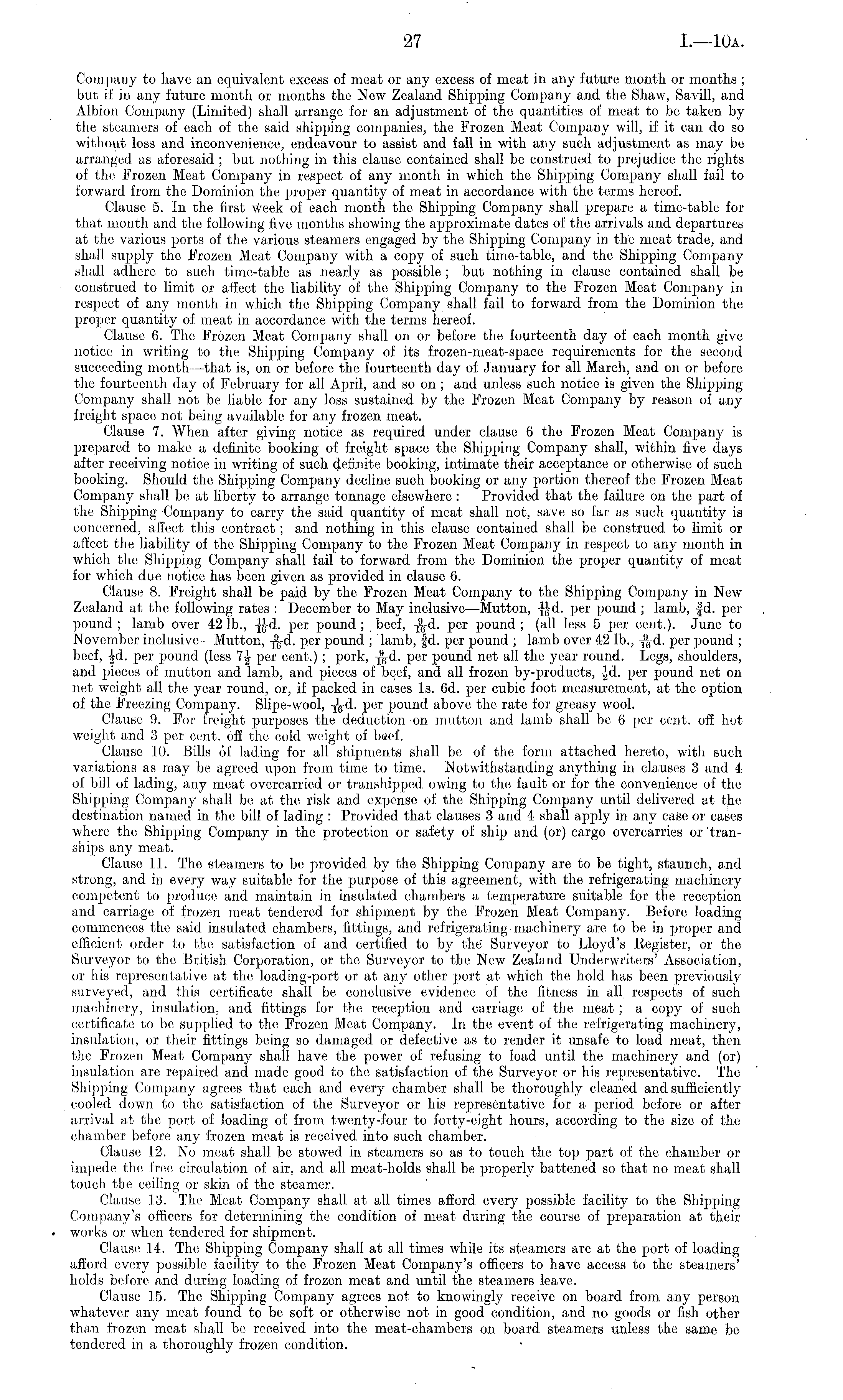 Company to have an equivalent excess of meat or any excess of meat in any future month or months ; but if in any future month or months the New Zealand Shipping Company and the Shaw, Savill, and Albion Company (Limited) shall arrange for an adjustment of the quantities of meat to be taken by the steamers of each of the said shipping companies, the Frozen Meat Company will, if it can do so without loss and inconvenience, endeavour to assist and fall in with any such adjustment as may be arranged as aforesaid ; but nothing in this clause contained shall be construed to prejudice the rights of the Frozen Meat Company in respect of any month in which the Shipping Company shall fail to forward from the Dominion the proper quantity of meat in accordance with the terms hereof. Clause 5. In the first week of each month the Shipping Company shall prepare a time-table for that month and the following five months showing the approximate dates of the arrivals and departures at the various ports of the various steamers engaged by the Shipping Company in the meat trade, and shall supply the Frozen Meat Company with a copy of such time-table, and the Shipping Company shall adhere to such time-table as nearly as possible ; but nothing in clause contained shall be construed to limit or affect the liability of the Shipping Company to the Frozen Meat Company in respect of any month in which the Shipping Company shall fail to forward from the Dominion the proper quantity of meat in accordance with the terms hereof. Clause 6. The Frozen Meat Company shall on or before the fourteenth day of each month give notice in writing to the Shipping Company of its frozen-meat-space requirements for the second succeeding month—that is, on or before the fourteenth day of January for all March, and on or before the fourteenth day of February for all April, and so on ; and unless such notice is given the Shipping Company shall not be liable for any loss sustained by the Frozen Meat Company by reason of any freight space not being available for any frozen meat. Clause 7. When after giving notice as required under clause 6 the Frozen Meat Company is prepared to make a definite booking of freight space the Shipping Company shall, within five days after receiving notice in writing of such definite booking, intimate their acceptance or otherwise of such booking. Should the Shipping Company decline such booking or any portion thereof the Frozen Meat Company shall be at liberty to arrange tonnage elsewhere : Provided that the failure on the part of the Shipping Company to carry the said quantity of meat shall not, save so far as such quantity is concerned, affect this contract; and nothing in this clause contained shall be construed to limit or affect the liability of the Shipping Company to the Frozen Meat Company in respect to any month in which the Shipping Company shall fail to forward from the Dominion the proper quantity of meat for which due notice has been given as provided in clause 6. Clause 8. Freight shall be paid by the Frozen Meat Company to the Shipping Company in New Zealand at the following rates : December to May inclusive—Mutton, -J-J-d. per pound ; lamb, fd. per pound ; lamb over 42 lb., JJd. per pound ; beef, per pound ; (all less 5 per cent.). June to November inclusive—Mutton, per pound ; lamb, fd. per pound ; lamb over 42 lb., -A-d. per pound ; beef, Jd. per pound (less 1\ per cent.) ; pork, -$j-d. per pound net all the year round. Legs, shoulders, and pieces of mutton and lamb, and pieces of beef, and all frozen by-products, -|-d. per pound net on net weight all the year round, or, if packed in cases Is. 6d. per cubic foot measurement, at the option of the Freezing Company. Slipe-wool, per pound above the rate for greasy wool. Clause 9. For freight purposes the deduction on mutton and lamb shall be 6 per cent, off hot weight and 3 per cent, off the cold weight of beef. Clause 10. Bills 6f lading for all shipments shall be of the form attached hereto, with such variations as may be agreed upon from time to time. Notwithstanding anything in clauses 3 and 4 of bill of lading, any meat overcarried or transhipped owing to the fault or for the convenience of the Shipping Company shall be at the risk and expense of the Shipping Company until delivered at the destination named in the bill of lading : Provided that clauses 3 and 4- shall apply in any case or cases where the Shipping Company in the protection or safety of ship and (or) cargo overcarries or tranships any meat. Clause 11. The steamers to be provided by the Shipping Company are to be tight, staunch, and strong, and in every way suitable for the purpose of this agreement, with the refrigerating machinery competent to produoe and maintain in insulated chambers a temperature suitable for the reception and carriage of frozen meat tendered for shipment by the Frozen Meat Company. Before, loading commences the said insulated, chambers, fittings, and refrigerating machinery arc to be in proper and efficient order to the satisfaction of and certified to by the' Surveyor to Lloyd's Register, or the Surveyor to the British Corporation, or the Surveyor to the New Zealand Underwriters' Association, or his representative at the loading-port or at any other port at which the hold has been previously surveyed, and this certificate shall be conclusive evidence of the fitness in all respects of such machinery, insulation, and fittings for the reception and carriage of the meat ; a copy of such certificate to be supplied to the Frozen Meat Company. In the event of the refrigerating machinery, insulation, or their fittings being so damaged or defective as to render it unsafe to load meat, then the Frozen Meat Company shall have the power of refusing to load until the machinery and (or) insulation are repaired and made good to the satisfaction of the Surveyor or his representative. The Shipping Company agrees that each and every chamber shall be thoroughly cleaned 