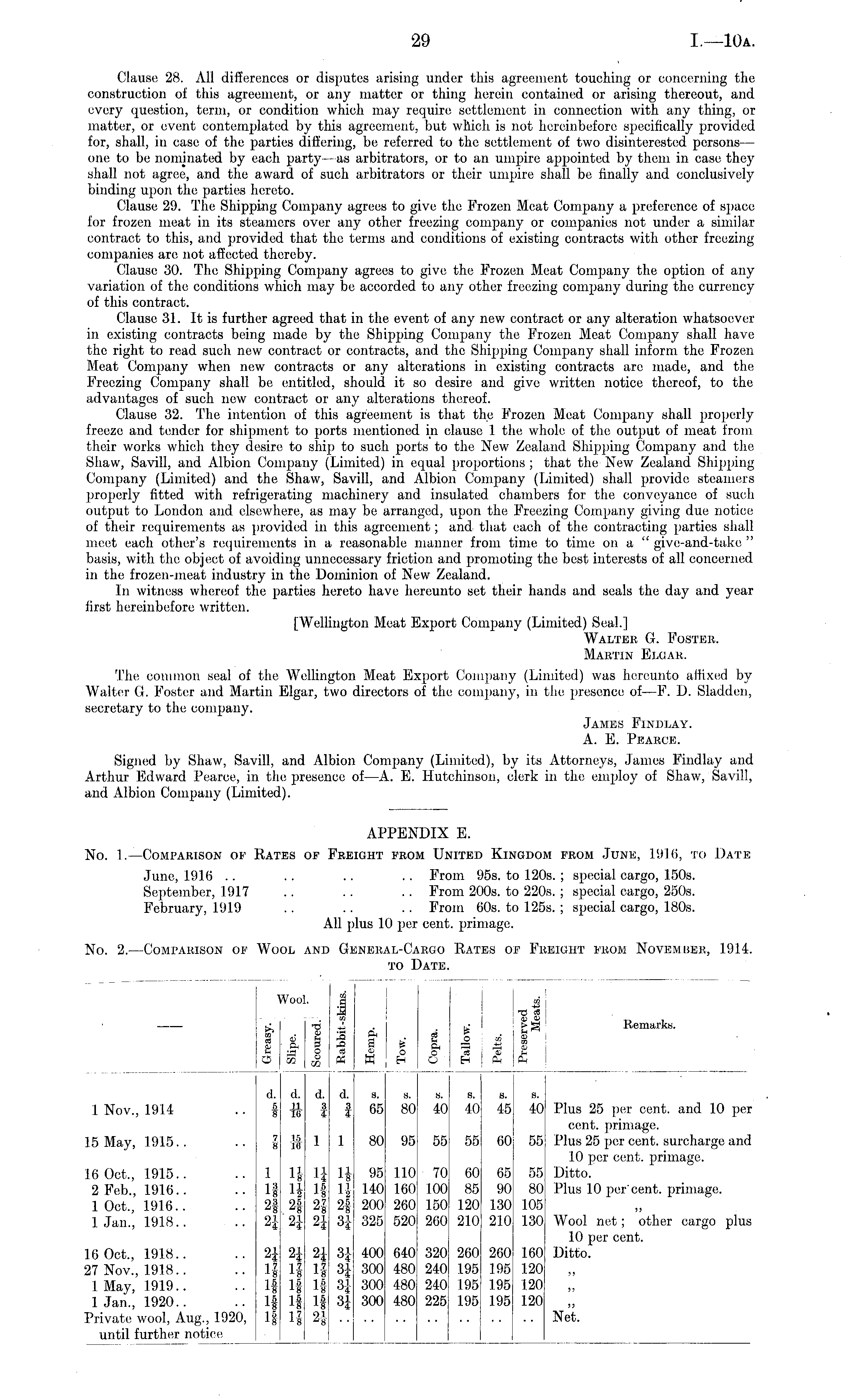 Clause 28. All differences or disputes arising under this agreement touching or concerning the construction of this agreement, or any matter or thing heroin contained or arising thereout, and every question, term, or condition which may require settlement in connection with any thing, or matter, or event contemplated by this agreement, but which is not hereinbefore specifically provided for, shall, in case of the parties differing, be referred to the settlement of two disinterested persons — one to be nominated by each party —as arbitrators, or to an umpire appointed by them in case they shall not agree, and the award of such arbitrators or their umpire shall be finally and conclusively binding upon the parties hereto. Clause 29. The Shipping Company agrees to give the Frozen Meat Company a preference of space for frozen meat in its steamers over any other freezing company or companies not under a similar contract to this, and provided that tho terms and conditions of existing contracts with other freezing companies arc not affected thereby. Clause 30. The Shipping Company agrees to give the Frozen Meat Company the option of any variation of tho conditions which may be accorded to any other freezing company during the currency of this contract. Clause 31. It is further agreed that in the event of any new contract or any alteration whatsoever in existing contracts being made by the Shipping Company the Frozen Meat Company shall have the right to read such new contract or contracts, and the Shipping Company shall inform the Frozen Meat Company when new contracts or any alterations in existing contracts arc made, and the Freezing Company shall be entitled, should it so desire and give written notice thereof, to the advantages of such new contract or any alterations thereof. Clause 32. The intention of this agreement is that the Frozen Meat Company shall properly freeze and tender for shipment to ports mentioned in clause J the whole, of tho output of meat from their works which they desire to ship to such ports to the Now Zealand Shipping Company and the Shaw, Savill, and Albion Company (Limited) in equal proportions ; that the New Zealand Shipping Company (Limited) and the Shaw, Savill, and Albion Company (Limited) shall provide steamers properly fitted with refrigerating machinery and insulated, chambers for the conveyance of such output to London and elsewhere, as may bo arranged, upon the Freezing Company giving due notice of their requirements as provided in this agreement; and that each of the contracting parties shall meet each other's requirements in a reasonable manner from time to time on a " give-and-take " basis, with the object of avoiding unnecessary friction and promoting the best interests of all concerned in the frozen-meat industry in the Dominion of Now Zealand. In witness whereof the parties hereto have hereunto set their hands and seals the day and year first hereinbefore written. [Wellington Moat Export Company (Limited) Seal.] Walter G. Foster. Martin Elgar. The common seal of the Wellington Meat Export Company (Limited) was hereunto affixed by Walter G. Foster and Martin Elgar, two directors of the company, in tho presence of—F. D. Sladden, secretary to tho company. James Findlay. A. E. Pearce. Signed by Shaw, Savill, and Albion Company (Limited), by its Attorneys, James Findlay and Arthur Edward Pearce, in the presence of—A. E. Hutchinson, clerk in tho employ of Shaw, Savill, and Albion Company (Limited). APPENDIX E. No. I.— Comparison of Rates op Freight from United Kingdom from June, 1916, to Date June, 1916 .. . . .. . . From 955. to 120s. ; special cargo, 150s. September, 1917 .. . . . . From 200s. to 2205. ; special cargo, 2505. February, 1919 .. .. .. From 60s. to 1255. ; special cargo, 180s. All plus 10 per cent, primage.