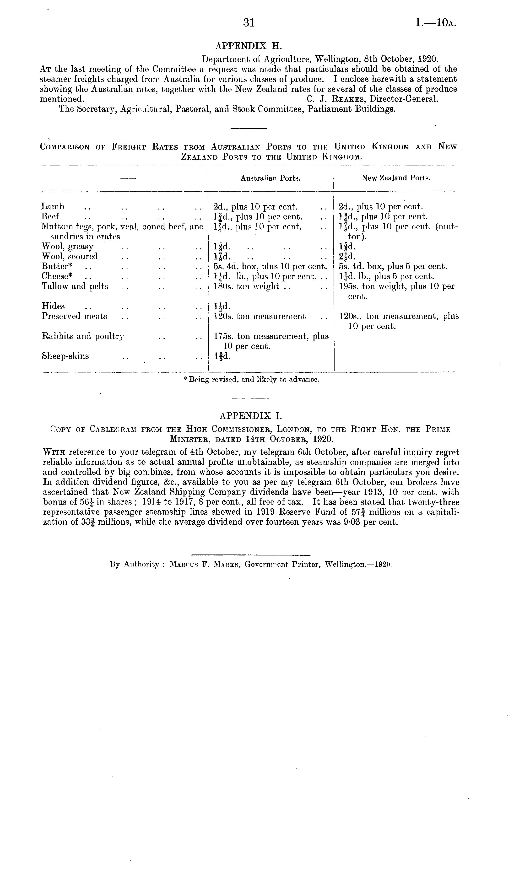 APPENDIX I. Copy op Cablegram from the High Commissioner, London, to the Right Hon. the Prime Minister, dated 14th October, 1920. With reference to your telegram of 4th October, my telegram 6th October, after careful inquiry regret reliable information as to actual annual profits unobtainable, as steamship companies are merged into and controlled by big combines, from whose accounts it is impossible to obtain particulars you desire. In addition dividend figures, &c, available to you as per my telegram. 6th October, our brokers have ascertained that Now Zealand Shipping Company dividends have been —year 1913, 10 per cent, with bonus of 56j in shares ; 1914 to 1917, 8 per cent., all free of tax. It has been stated that twenty-three representative passenger steamship lines showed in 1919 Reserve, Fund of 57|- millions on a capitalization of 33| millions, while the average dividend over fourteen years was 9-03 per cent.