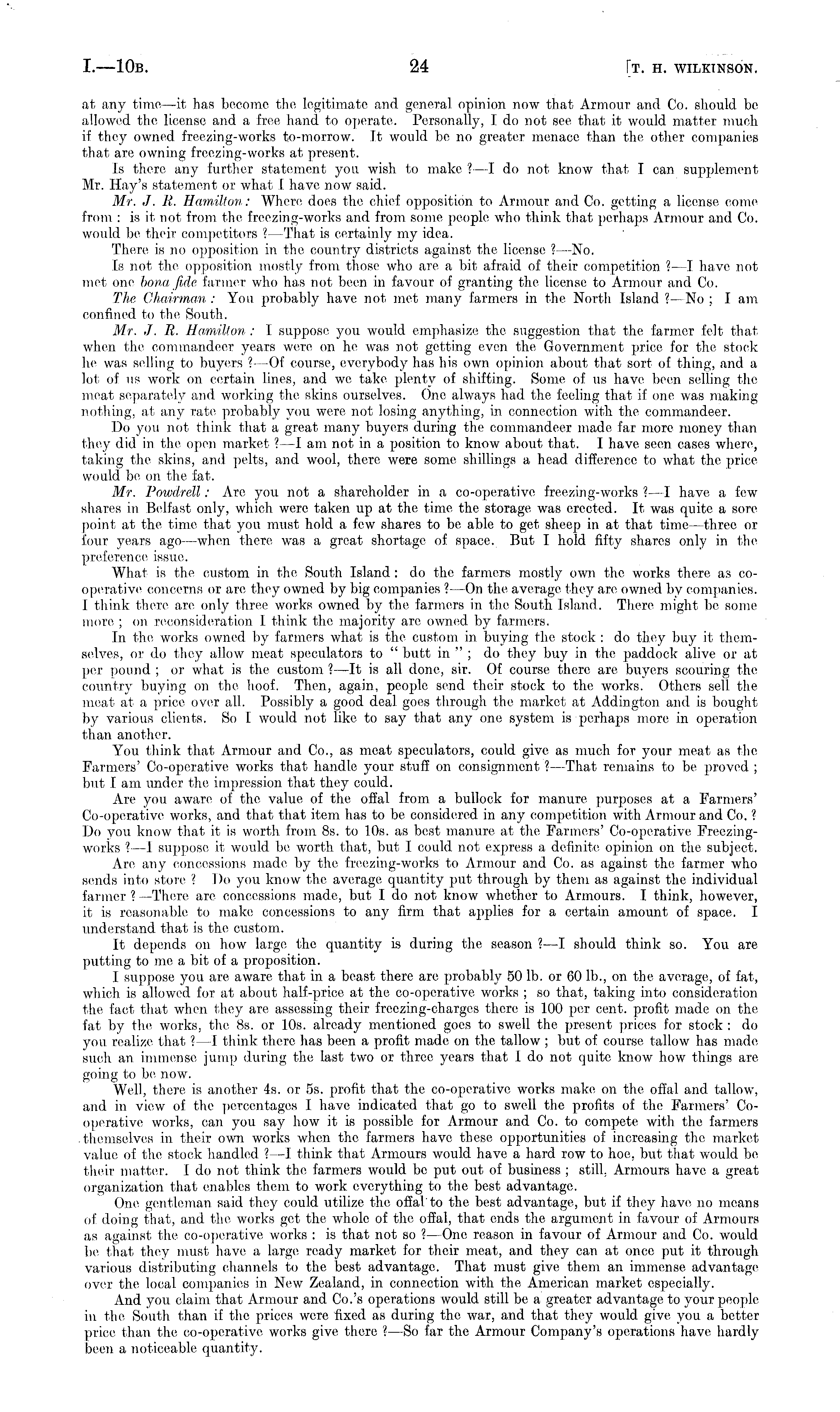 at any time—it has become the legitimate: and general opinion now that Armour and Co. should be allowed the license and a free hand to operate. Personally, I dei not see that it wemld matter much if they owne-d freezing-works to-morrow. It would be no greater menace than the other companies that are owning freezing-works at present. Is there any further statement you wish to make ?—I do not know that I can supplement Mr. Hay's statement or what I have now said. Mr. J. R. Hamilton: Where does the chief opposition to Armour and Co. getting a license come from : is it not from the freezing-works and from semie people whei think that perhaps Armemr and Co. would be their competitors ?—'That is certainly my idea. There is no opposition in tho country districts against the license ?—No. Is not the opposition mostly from those who are a bit afraid of their competition ? —I have not met one bona fide farmer who has not been in favour of granting the; license: to Armour anel Co. The Chairman : You probably have not met many farmers in the North Island ? —No ; I am confined to the South. Mr. J. R. Hamilton : I suppose, you would emphasize the, suggestion that the farmer felt that when the commandeer years were on he was not getting even the Government price, for the stock he was selling to buyers ? —Of course, everybody has his own opinion about that sort of thing, and a lot of us work on certain lines, and we take plenty of shifting. Some of us have be-en selling the" meat separately and working the skins ourselves. One always had the feeling that if one was making nothing, at any rate probably you were not losing anything, in connection with the commandeer. Do you neit think that a great many buyers during the commandeer made far more money than they did in the open market ? —I am not in a position to know about that. I have seen cases where, taking the skins, and pelts, and wool, there: were some: shillings a head difference to what the price wemld be on the fat. Mr. Powdrell: Are you not a shareholder in a co-operative freezing-works ?— I have a few shares in Bedfast only, which were taken up at the time the storage was erected. It was quite a sore point at the time that you must hold a few shares to be, able to get sheep in at that time—three eir four years ago —when there was a groat shortage eif space. But I hold fifty shares only in the preference issue. What is the custom in the South Island : do the' farmers meistly own the works there as cooperative concerns or arc they owned by big companies ? —On the average they are owned by companies. I think there are only three works owned by the farmers in the South Island. There might be some more ; em reconsideration I think the majority are, owned, by farmers. In the works owned by farmers what is the custom in, buying the stock : do they buy it themselves, or do they allow meat speculators to " butt in " ; do they buy in the paddock alive or at per pound ;or what is the custom ? —lt is all done, sir. Of course there are buyers scouring the country buying on the hoof. Then, again, people: send their stoe:k to the works. Others sell the' meat at a price ove;r all. Possibly a good deal goes through the market at Addington and is bought by various clients. So 1 would not like to say that any one system is perhaps more, in operation than another. You think that Armour and Co., as meat speculators, could give as much for your meat as the Farmers' Co-operative works that handle your stuff on consignment ? —That remains to be proved ; but I am under the impression that they could. Are you aware of the value of the offal from a bullock for manure- purpose's at a Farmers' Co-operative works, and that that item has to be considered in any competition with Armour and Co. ? Do you know that it is worth from Bs. to 10s. as best manure at the Farmers' Co-operative Freezingworks ?—I suppose: it would be worth that, but I could, not express a definite- opinion em the subject. Are any concessions made by the, freezing-works' to Armour and Co. as against the farmer who se-nds into store ? Do you know the average quantity put through by them as against the individual farmer? —There arc concessions made, but Ido not know whether to Armours. I think, however, it is reasonable: to make: concessions to any firm that applies fen; a certain amount of space. I understand, that is the: custom. It elopends on how large the quantity is during the season ?—I shoulel think so. You are putting to me a bit of a proposition. I suppose you are aware that in a beast there are: probably 50 lb. or 60 lb., em the: average, of fat, which is allowed for at about half-price at tho co-operative works ; so that, taking into consideration the fact that when they are assessing their freezing-charges there is 100 per cent, profit made on the fat by the, works, the Bs. or 10s. already mentioned goes to swell the present prices for stock : do you realize, that ? —I think there has been a profit made on the tallow ; but of course tallow has made such an immense jump during the last two or three years that I do not ejuito know how things are: going to be now. Well, there is another 4s. or ss. profit that the co-operative works make on the offal and tallow, and in view of the percentages I have indicated that go to swell the profits of the Farmers' Ce>operative works, can you say how it is possible for Armour and Co. to compete with the farmers .themselves in their own works when the farmers have these opportunities of increasing the market value of the: stock handled ? —1 think that Armours would have a hard row to hoe, but that would be: their matter, Ido not think the farmers would be put out of business ; still. Armours have a great organization that enables them to work everything to the best advantage. One gentleman said they could utilize the offal to the best advantage, but if they have no means of doing that, and the works got the whole of the offa