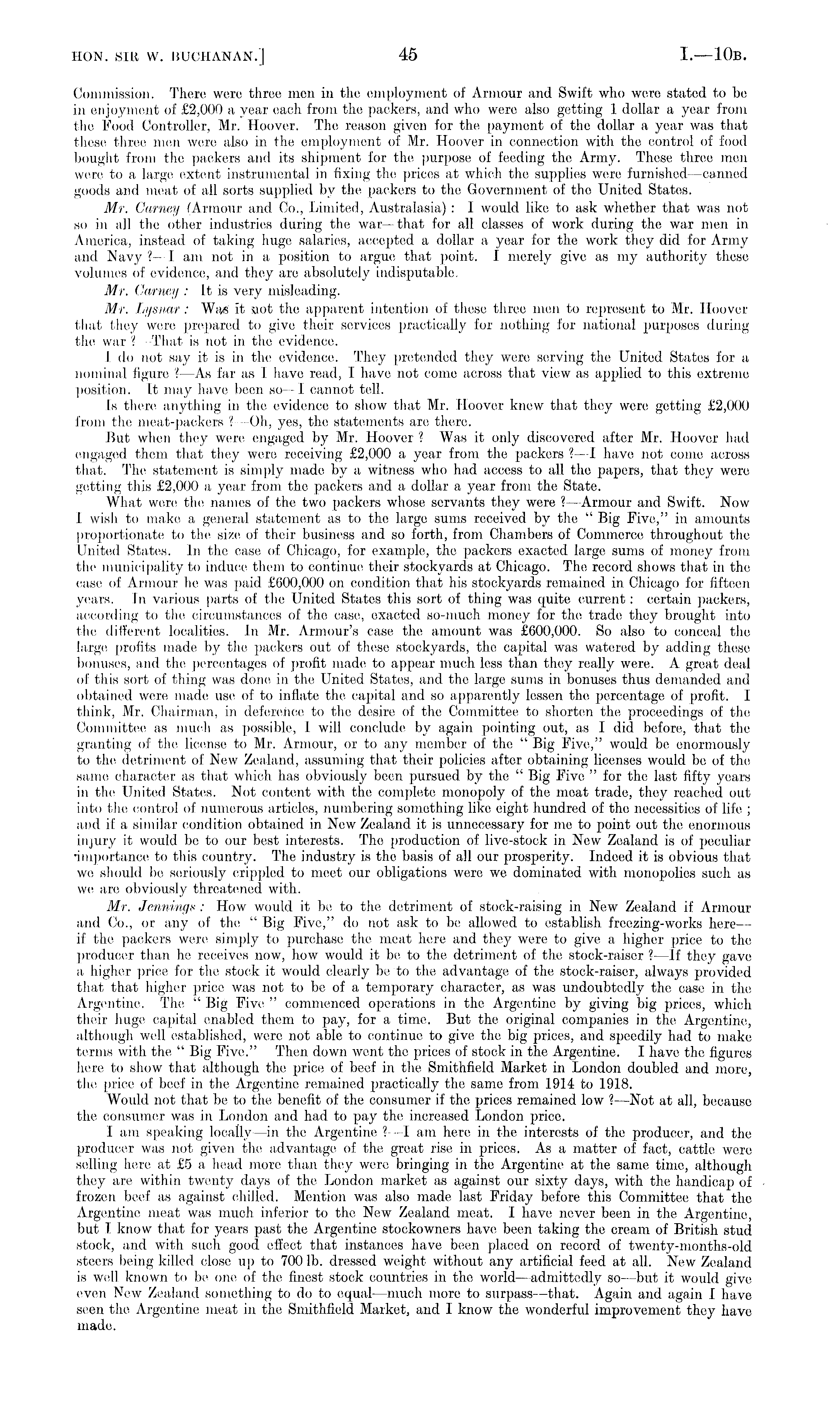 Commission. There were three men in the employment of Armour and Swift who wore stated to be: in enjoyment of £2,000 a year each from the packers, and who were: also getting 1 dollar a year from the, Feioel Controller, Mr. Hoover. The reason given for the payment of the dollar a, year was that these three men we're; also in the: employment of Mr. Hoeiver in connection with the control of food bought from the packers and its shipment for the purpose of feeding the Army. These three: men were to a largo extent instrumental in fixing the prices at which the supplies were furnished —canned geieids and meat of all sorts supplied by the packers tei the; Ge>vernment of tho United States. Mr. Carney CArmour and Co., Limited, Australasia) : I woulel like to ask whether that was not so in all the other industries during the war —that for all classes of work during the war men in America, instead of taking huge salaries, accepted a dollar a year for the work they diel for Army and Navy ?—I am not in a position to argue: that point. I merely give as my authority these volumes of evidence, and they are absolutely indisputable: Mr. Carney : It is very misleading. Mr. Lysnar : Was it sot the apparent intention of these; three men to represent to Mr. Hoover that they were prepared te> give; their services practically for nothing for national purposes during the war ? That is not in the: evidence. I do not say it is in the evidence;. They pretended they were: serving the Uniteel. States for a nominal figure ?—As far as I have read, I have not e'ome across that view as applied to this extreme position. It may have been so —I cannot tell. Is there anything in the evidence to show that Mr. Hoover knew that they were: getting £2,000 from the meat-packers ? Oh, yes, the statements are: there-, But when they were engaged by Mr. Hoover ? Was it only discovered after Mr. Hoover hail engaged them that they were receiving £2,000 a year from the packers ? —I have not e:ome; across that. The statement is simply made by a witness who had access to all the papers, that they were getting this £2,000 a, year from the packers and a dollar a year from the State. What wore the names of the two packers whose servants they were ? —Armour anel Swift. Now I. wish to make a general statement as to the large sums received by tho " Big Five," in amounts proportionate, to the size of their business and so forth, from Chambers of Commerce throughout the United States. In the case: of Chicago, for example, the packers exacted large sums of money from the municipality to induce them to continue their stockyards at Chicago. The record shows that in the case of Armour he was paid £600,000 on condition that his stockyards remained in Chicago for fifteen years. In various parts of the United States this sort of thing was epiite current: e:ertain packers, according tei the circumstances of the; case, exacted so-much money for the trade: they brought into the: different localities. In Mr. Armour's case the amount was £600,000. So also to conceal the large profits made by the packers out of these stockyards, tho capital was watered by adding these bemuses, and the percentages of profit made to appear much less than they really were. A great deal of this sort of thing was done in the United States, and the largo sums in bonuses thus demanded and obtained were made use of to inflate the capital and so apparently lessen the percentage of profit. I think, Mr. Chairman, in deference to the desire of the Committee: to shorten the: proceedings of the: Committee: as much as possible, I will conclude; by again pointing out, as I did before, that the' granting of the; license to Mr. Armour, or to any member of the " Big Five," would be: enormously to the detriment of New Zealand, assuming that their policies after obtaining licenses woulel be: of the; same character as that which has obviously been pursued by the " Big Five; " for the last fifty years in the: United States. Not content with the complete monopeily of the moat trade, they reached out into the control of numerous articles, numbering something like eight hundred of tho necessities of life ; anel if a similar condition obtained in New Zealand it is unnecessary for me to point out the- enormous injury it would bo to our best interests. The: production of live-stock in N;w Zealand is of peculiar importance to this country. The industry is the basis of all our prosperity. Indeed it is obvious that we should be, seriously crippled to meet our obligations were we dominated with monopolies such as we are eibviously threatened with. Mr. Jennings: How would it be to the detriment of stock-raising in New Zealand if Armour and Co., or any of the "Big Five," dei not ask to be; allowed to establish, freezing-works here--if the packers were simply to purchase the meat here and they were to give a higher price to the: producer than he receives now, how would it bo to the detriment of the, stock-raiser ? -if the:y gave a higher price, for the stock it wemld clearly be to the advantage of the stock-raiser, always provided that that higher price was not to be: of a temporary character, as was undoubtedly the case in the; Argentine. The " Big Five' " commenced operations in the Argentine by giving big prices, which their huge capital enabled them to pay, for a time. But the original companies in the Argentine, although well established, were not able to continue to give- the big prices, and speedily had tei make: terms with the " Big Five-." Then down went the prices of stock in the Argentine. I have the figures here to show that although tho price of beef in the Smithficld Market in London dembled and more-, the price of beef in the Argemtinc remained iiractically the same from 1914 to 1918. Would not that be to the benefit of the consumer if the prices remained low ? —Not at all, be'eause the consumer was in London and had to pay the increased London price. I am speaking locally—i