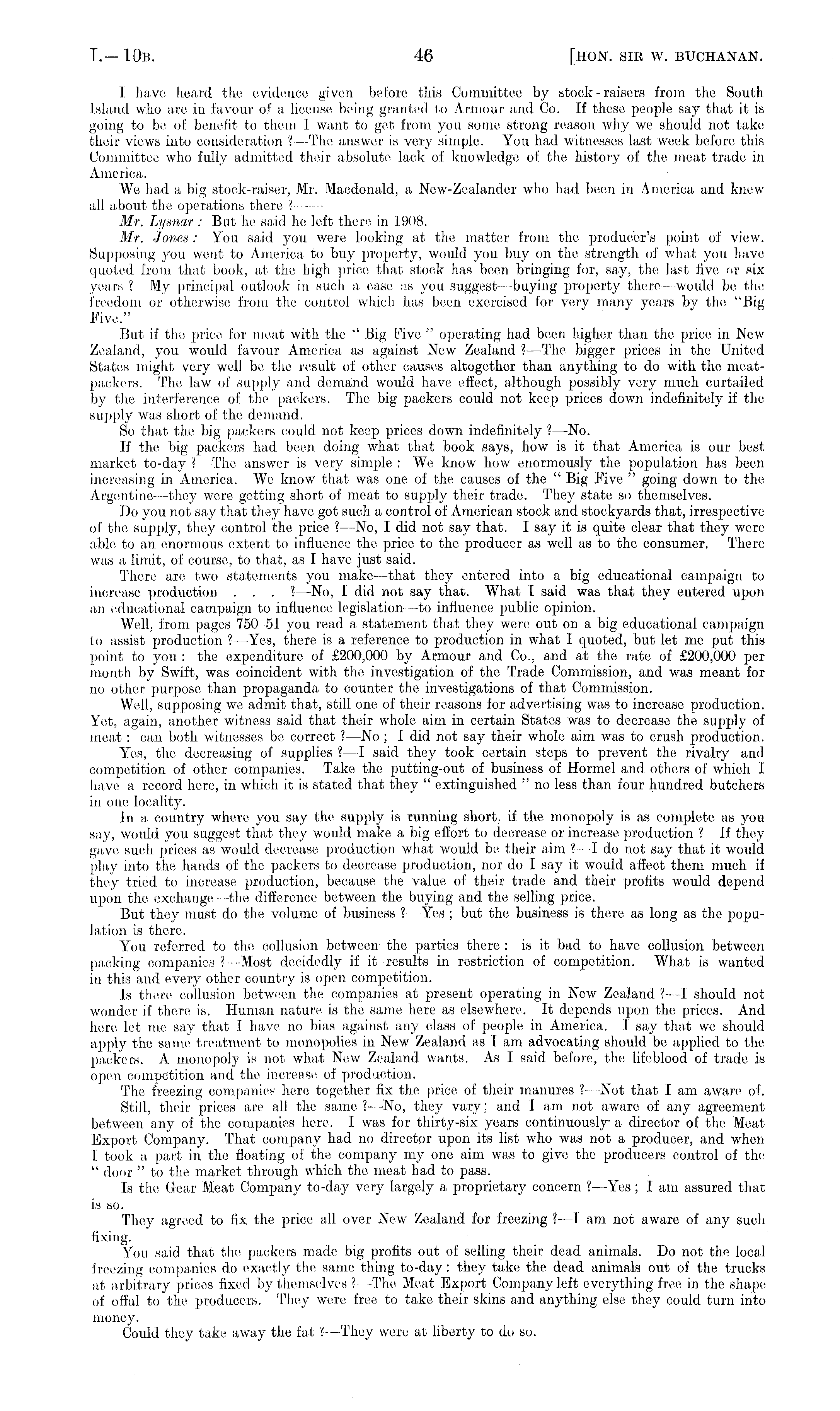 I. have; heard the: evidence; given be-fore this Committee by stock - raisers from the South Island who are in favour of a license being granted to Armemr and Co. If these people say that it is going to be of benefit to them I want to get from you some strong reason why wo should not take their views into consideration ?—The answer is very simple. You had witnesses last week before this Committee who fully admitted their absolute lack of knowledge of the history of the meat trade in America, We had a big stock-raiser, Mr. Macdemald, a New-Zealander who had been in America and knew all about the operations there ? — Mr. Lysnar : But he said he left there in 1908. Mr. Jones: You said you were looking at the matter from the: producer's point of view. Supposing you went tei America, to buy property, wemld yem buy on the: strength of what, you have quoted from that book, at the high price that stock has boon bringing for, say, the last five or six years ?—My principal outlook in suoh a case' as you suggest -buying property there —would be; the freedom or otherwise from the: control which has been exercised for very many years by the' "Big Five." But if the price for meat, with the " Big Five " operating had been higher than the price in New Zealand, you would favour America as against New Zealand ? —The bigger prices in tho Unite:d State's might very well be: the result of eithe:r causes altogether than anything to do with the: meatpackers. The law of supply and demand would have effect, id though possibly very much curtailed by the interference of the packers. The big packers could not keep prices down indefinitely if the supply was short of the demand. So that the big packers could not keep prices down indefinitely ?—-No. If the big packers had bee;n doing what that book says, how is it that America is our best market to-day ?- The answer is very simple : We: know how enormously the population has been increasing in America. We know that was one of the causes of the " Big Five " going down to the: Argentine- -they were getting short of meat to supply their trade. They state so themselves. Do you not say that they have got such a control of American stock and stockyards that, irrespective of tho supply, they control the price ? —No, I did not say that. I say it is quite clear that they were able to an enormous extent to influence the price to the producer as well as to the consumer. There was a limit, of course, to that, as I have just said. There are two statements you make —that they entered into a big educational campaign to increase: production . . . ? —No, 1 did not say that. What I. said was that they entered upon an educational campaign to influence legislation -to influence- public, opinion. Wedl, from pages 750 51 you read a statement that they were out on a big educational campaign to assist production ?—Yes, there is a reference to production in what I epioted, but lot mo put this point to you : the expenditure of £200,000 by Armour and Co., and at the rate of £200,000 per month by Swift, was coincident with the investigation of the Trade Commission, and was meant for no other purpose, than propaganda to counter the investigations of that Commission. Well, supposing wo admit that, still one of their reasons for advertising was to increase: production. Yet, again, another witness said that their whole aim in certain States was to decrease the supply of meat : can both witnesses be correct ? —No ; I elid not say their whole aim was to crush production. Yes, the decreasing of supplies ?—I said they took certain steps to prevent the rivalry and competition of other companies. Take the putting-out of business of Hormel and others of which I have- a record here, in which it is stated that they " extinguished " no less than four hundred butchers in one locality. In a country where you say the supply is running short, if the monopoly is as complete as you say, woulel you suggest that they would make a big effort to decrease or increase production ? If they gave such prices as would decrease production what would be their aim ? —I do not say that it woulel play into the hands of the packers to decrease production, nor do I say it would affect them much if they tried to increase production, because the value of their trade and their profits would depend upem the exchange —the difference between the buying and the selling price. But they must do the volume of business ? —Yes ; but the business is the:re as long as the population is there. You referred te: the collusion between the parties there; : is it bad to have collusion between packing companies ?--Most decidedly if it results in restriction of competition. What is wanted in this and every other country is open competition. Is there collusion between the companies at present operating in New Zealand ?-■ I should not wonder if there is. Human nature is the same here as elsewhere. It depends upon the prices, And here let me say that I have no bias against any class of people in America. I say that we should apply the same: treatment to monopolies in New Zealand as I am advocating should be; applied to the paokers. A monopoly is not what Now Zealand wants. As I said before, the lifeblood of trade is open competition and the increase of production. The freezing companies hero together fix the price of their manures ?—Not that lam aware of. Still, their prices are all the same ?—No, they vary; and I am not aware of any agreement between any of the oompanies he-re. I was for thirty-six years continuously a director of the Meat Export Company. That company had no director upon its list who was not a producer, and when I took a part in the floating of the company my one aim was to give the: producers control of the " door " tei the market through which the, meat had to pass. Is the- Gear Moat Company to-day very largely a proprietary concern ?--Yes ; I am assured that is so. They agreed to fix the price all