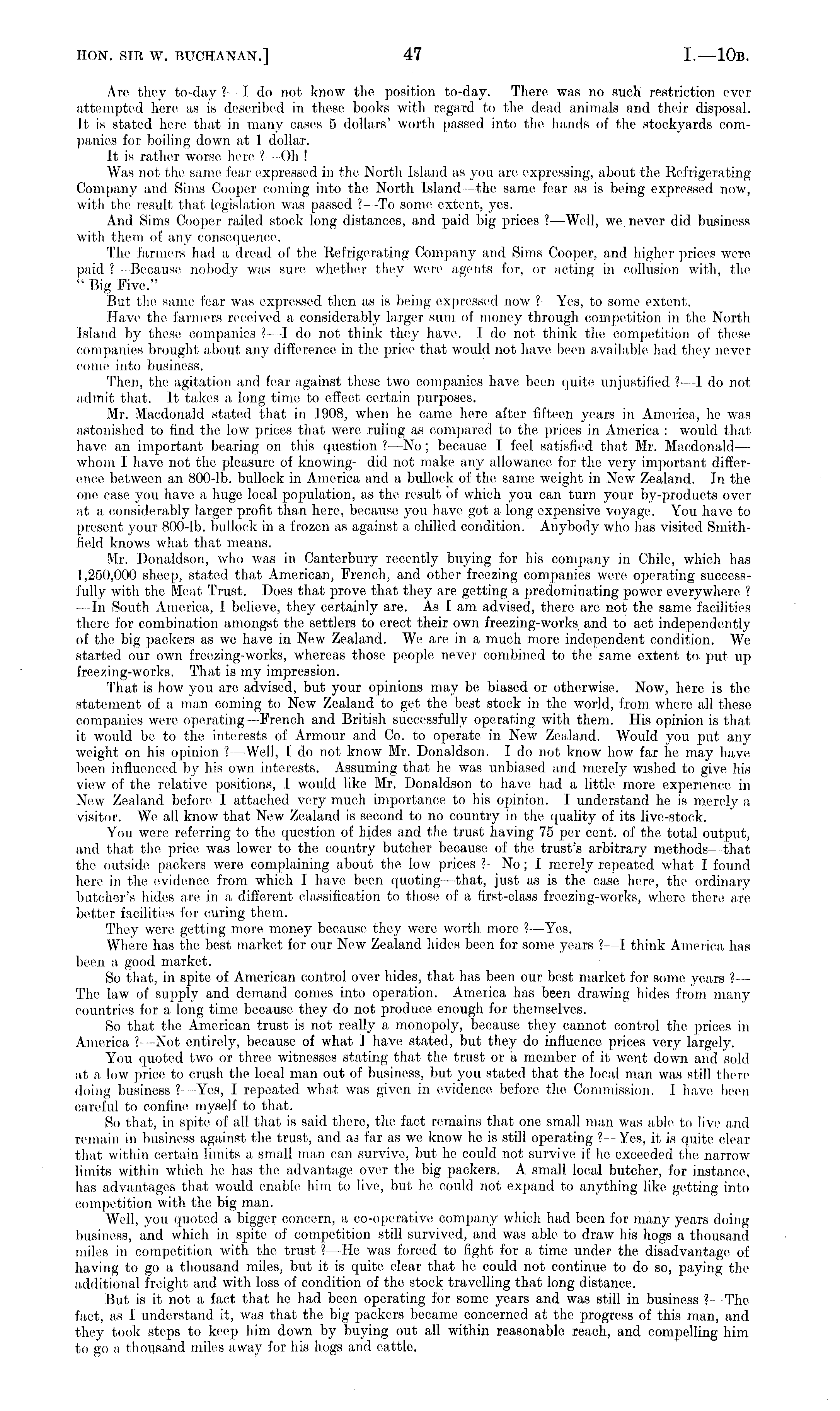 Are they to-day ? —I do not know the position to-day. There was no such restriction ever attempted here as is described in these books with regard tei the dead animals and their disposal. It is stated here that in many cases 5 dollars' worth passeel into the' hands of the stockyards companies lor boiling down at I dollar. It is rather worse here ? Oh ! Was not the same fear expressed in the North Island as you arc expressing, about the Refrigerating Company and Sims Cooper coming into the North Island —the same, fear as is being expressed now, with the: result that legislation was passed ?—To some extent, yes. And Sims Cooper railed stock long distances, and paid big prices ? —Well, wo. never did business with them of any consequence. The farmers had a dread of the Refrigerating Company and Sims Cooper, and higher prices were paid ?-—Because, nobody was sure whether they were agents for, or acting in collusion with, the " Big Five." Hut (lie. same- fear was expressed then as is being expressed now ?- -Yes, to seimo extent. Have the farmers received a consielerably larger sum of money through competition in the North Island by these ceimpanies ?—I do not think they have. \ elo not think the- competition of these companies brought about any difference, in the price that woulel not have: been available had they never come into business. Then, the agitation and fear against these two companies have been quite unjustified ?- I do not admit that. It takes a long time to effect certain purposes, Mr. Macdonald stated that in 1908, when he came he;ro after fifteen ye;ars in Amerioa, he was astonished to find the low prices that were; ruling as compared to the, prices in America : would that have an important bearing em this question ?—No; because I feel satisfied that Mr. Maeidonald— whom I have not the pleasure: of knowing did not make- any allowance for the very important difference between an 800-lb. bullock in America and a bullock of the same weight in Now Zealand. In the one case yem have a huge local population, as the result of which you can turn your by-products over at a consielerably larger profit than here, because you have got a long expensive voyage. Yem have to present your 800-lb. bullock in a frozen as against a chilled condition. Anybody who has visited Smithfield knows what that means. Mr. Donaldson, who was in Canterbury recently buying for his company in Chile, which has 1,250,000 sheep, stated that American, French, anel other free-zing companies wore operating successfully with the Meat Trust. Does that prove that they are getting a, predominating power everywhere- ? —In South America, I believe, they certainly are. As I. am advised, there arc not the same facilities there for combination amongst the settlers to erect their own freezing-works and to act independently of the big packers as we have in New Zealand. are in a much more independent condition. We started our own freezing-works, whereas those people- never combined to the: same extent to put up freezing-works. That is my impression. That is how you are advised, but your opinions may be biase-d or otherwise. Now, here is the statement of a man coming to New Zealand to get the best stock in the world, from, where all these companies were operating —French and British successfully operating with them. His opinion is that it woulel bo to the interests of Armour and Co. to operate in New Zealand. Would you put any weight on his opinion ?—Well, Ido not know Mr. Donaldson. Ido not know how far he may have: been influenced by his own interests. Assuming that he was unbiased and merely wished to give; his view of the: relative positions, I would like Mr. Donaldson to have- had a little more experience in New Zealand before I attached very much importance to his opinion. I understand he is merely a, visitor. We all know that New Zealand is second to no country in the ejuality of its live-stock. You were referring tei tho question of hides and tho trust having 75 per cent, of the total output, and that the price was lower to the country butcher because of the trust's arbitrary methods- that the; outside packers were complaining about the low prices ? No; I merely repeated what I found here, in the evidence from which 1 have- been quoting—that, just as is the case here-, the ordinary butcher's hides are in a different classification to those of a, first-class freezing-works, where there arebetter facilities for curing them. They were getting more money because thoy were worth more ? —Yes. Where has the best market for our New Zealand hides been for some years ?-—I think America, has been a good market. So that, in spite of American control over hides, that has been our best market for some years ? — The law of supply and demand comes into operation. America has been drawing hides from many countries for a long time because they do not produce: enough for themselves. So that the American trust is not really a monopoly, because they cannot control the, prices in America ?—Not entirely, because of what I have: stated, but they do influence prices very largely. You quoted two or three witnesses stating that the trust or a member of it went down and sold at a low prie;e to crush the local man out of business, but you stated that the local man was still there doing business ?—Yes, I repeated what, was given in evidence before' the Commission. I have been oareful to confine myself to that, So that, in spite of all that is said there, the fact remains that one small man was able to live anel re-main in business against the trust, and as far as we. know he is still operating ?—Yes, it is quite clear that within certain limits a small man can survive, but he could not survive if he: exceeded the narrow limits within which he has the advantage over the big packers. A small local, butcher, for instance, has advantages that would enable- him to live, but he could not expand to anything like getting into 