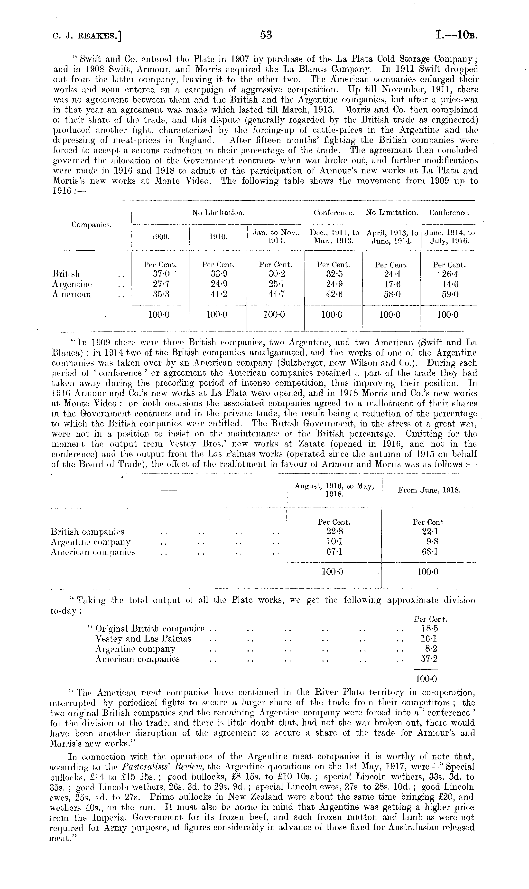 "In 1909 there, were; three British companies, two Argentine, and two American (Swift and La Blanca) ; in 1914: two of the British companies amalgamated, and the works of one of the Argentine companies was taken over by an American company (Sulzberger, now Wilson and Co.). Luring each period of 'conference' or agreement the American companies retained a part of the trade: they had taken away during the preceding period of intense competition, thus improving their position. In 1916 Armour anel Co.'s new works at La Plata were; opened, and in 1918 Morris and Co.'s now works at Monte Video : em both occasions the associated companies agreed to a reallotment of their shares in the Government contracts and in the, private trade, the result being a reduction of the percentage to which the British companies were entitled. The British Government, in the, stress of a great war, were not in a, position to insist; on the; maintenance of the- British percentage. Omitting for the moment the output from Ve-stey Bros.' new works at Zarate (opened in 1916, and not in the conference) arid the output from the; Las Palmas works (operated since the autumn of 1915 on behalf of the Board of Trade), the- e-ffe:e;t of the re-allotment in favour of Armour and Morris was as follows :-