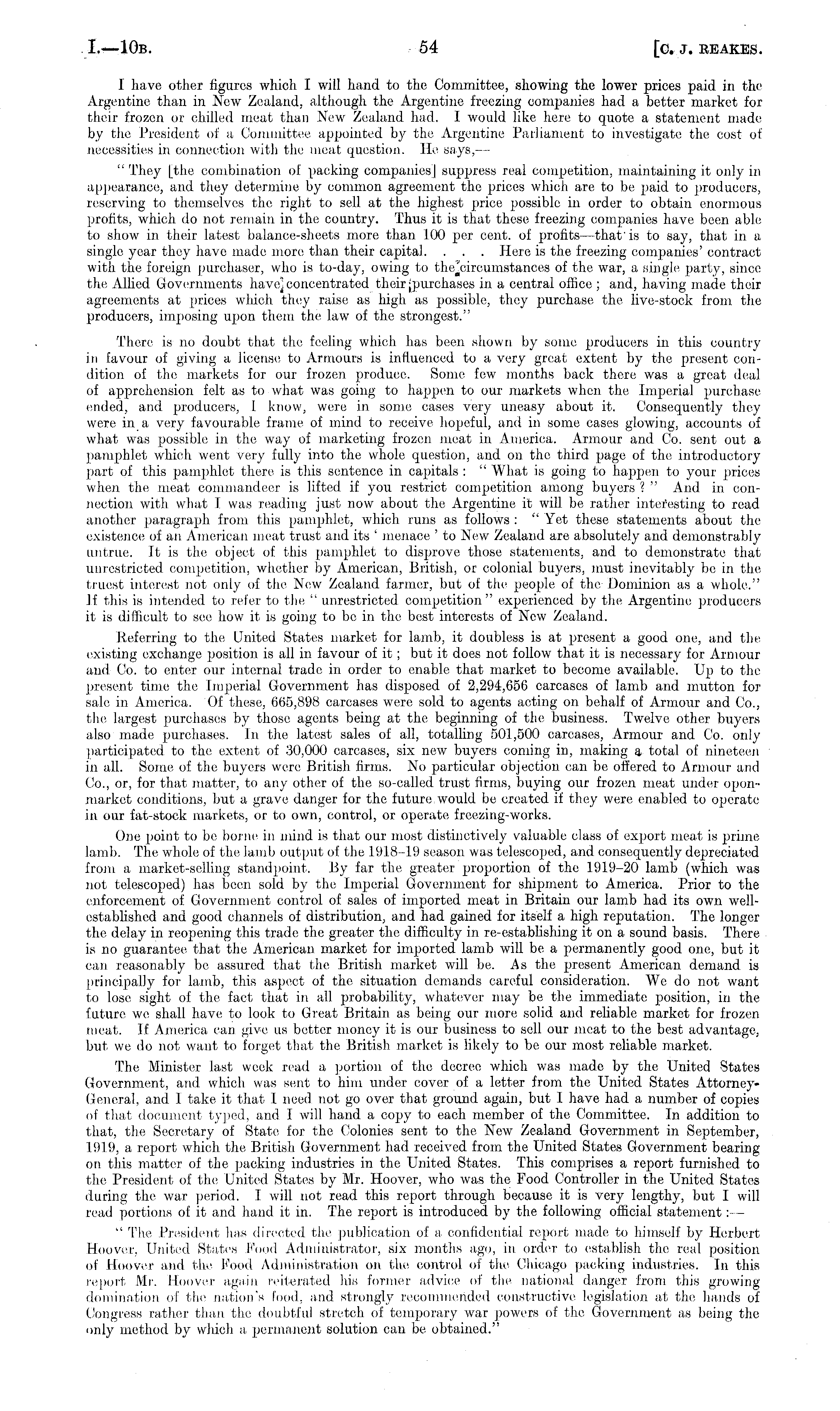 I have other figures which I will hand to the Committee, showing the lower prices paid in the Argentine than in New Zealand, although the Argentine freezing companies had a better market for their frozen or chilled meat than New Zealand had. I would like hero to quote a statement made by the President of a Committee appointed by the Argentine Parliament to investigate the' cost of necessities in connection with the meat question. He says, — " They [the combination of packing companies] suppress real competition, maintaining it only in appearance, and they determine by common agreement the price:s which are to be jiaid to producers, reserving to themselves the right to sell at the highest price possible in order to obtain enormous profits, which do not remain in the country. Thus it is that these freezing companies have been able to show in their latest balance-sheets more than 100 per cent, of profits —that'is to say, that in a single year they have made more' than their capital. . . . Hero is the freezing companies' contract with the, foreign purchaser, who is to-day, owing to the'eircumstances of the war, a single party, since the Allied Governments have] concentrated their-purchases in a central office ; and, having made their agreements at prices which they raise, as high as possible, they purchase, tho live-stock from, the producers, imposing upon them the law of the strongest." There is no doubt that the feeling which has been shown by some producers in this country in favour of giving a license to Armours is influenced to a very great extent by the present conelition of the markets for our frozen produce. Some few months back there was a great deal of apprehension felt as to what was going to happen to our markets when the Imperial purchase: emded, anel producers, I know, we;re in some cases very uneasy about it. Consequently they were in a very favourable frame of mind to receive hopeful, anil in some cases glowing, accounts of what was possible in the way of marketing frozen meat in America. Armour and Co. sent out a pamphlet which went very fully into the whole question, and on the: third page of the: introductory part of this pamphlet there; is this sentence in capitals : " What is going to happen to your prices when the meat commandeer is lifted if you restrict competition among buyers ? " And in connection with what I was reading just now about the Argentine it will be rather interesting to read another paragraph from this pamphlet, which runs as follows : " Yet these statements about the existence of an American meat trust and its ' menace ' to Ne-vv Zealand are, absolutely and demonstrably untrue. It is the object of this pamphlet to disprove those statements, and to demonstrate that unrestricted competition, whether by American, British, or colonial buyers, must inevitably bo in the truest interest not only of the New Zealand farmer, but of the people of the-Dominion as a whole." If this is intended to refer to the " unrestricted competition" experienced by tho Argentine: producers it is difficult to see how it is going to be in the best interests of New Zealand. Referring to the United State:s market for lamb, it doubless is at present a good one, anel the existing exchange position is all in favour of it; but it does not follow that it is necessary for Armour and Co. to enter our internal trade in order to enable that market to become available. Up to the present time the. Imperial Government has disposed of 2,294,656 carcases of lamb and mutton for sale in America. Of those, 665,898 carcases were sold to agents acting on behalf of Armour and Co., the largest purchases by those- agents being at the beginning of the: business. Twelve othe;r buyers also made purchases. In the: latest sales of all, totalling 501,500 carcases, Armour and Co. only participated to the extemt of 30,000 carcases, six new buyers coming in, making a total of nineteen in all. Some of the buyers were British firms. No particular objection can bo offered to Armour and (Jo., or, for that matter, to any other of the so-called trust firms, buying our frozen meat under oponmarket conditions, but a grave danger for the future would be created if they were enabled to operate in our fat-stock markets, or to own, control, or operate freezing-works. One point to be borne in mind is that our most distinctively valuable class of export meat is prime lamb. The whole of the lamb output of the 1918-19 season was tele:scoped, and consequently depreciated from a market-selling standpoint. By far the greater proportion of the 1919-20 lamb (which was not telescoped) has been sold by the Imperial Government for shipment to America. Prior to the, enforcement of Government control of sales of imported meat in Britain our lamb had its own wellestablished and good channels of distribution, and had gained for itself a high reputation. The longer the delay in reopening this trade the greater the difficulty in re-establishing it on a sound basis. There is no guarantee, that the American market for imported lamb will be a permanently good one:, but it can reasonably be assured that the British market will be. As the present American demand is principally for lamb, this aspect e:f the; situation demands careful consideration. We do not want to lose sight of the fact that in all probability, whatever may be the immediate position, in tinfuture we shall have to look to Great Britain as being our more solid and reliable market for frozen meat. If America can give us better money it is our business to sell our meat to the best advantage, but we do not want to forget that the British market is likely to be our most reliable market. The Minister last week read a portion of the decree which was made by the United State's Government, and which was sent to him under cover of a letter from the United States AttorneyGeneral, and I take it that I need not go over that grounel again, but I have had a number of copies of that document t