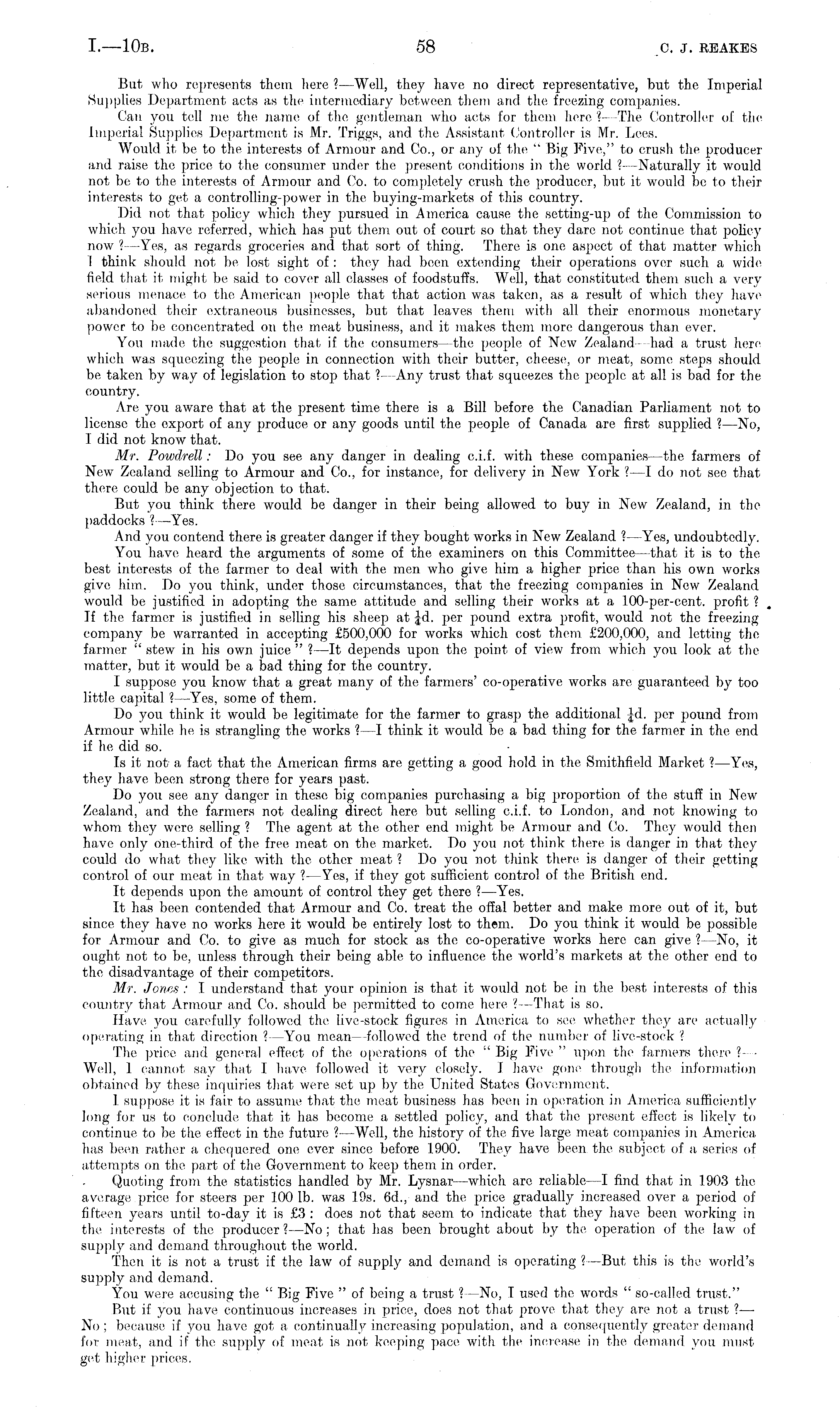 But who represents them here ? —Well, they have no direct representative, but the: Imperial Supplies Department acts as the intermexliary between them anil the freezing companies. Can you te;ll me: the: mime' of the: gentleman who acts for them here ?- The Controller of the Imperial Supplies Department is Mr. Triggs, and the Assistant Controller is Mr. Lees. Would it be to the interests of Armour and Co., or any of the " Big Five," to crush the producer and raise the price to the consumer under the present conditions in the world ?- -Naturally it would not be to the interests of Armour anil Co. to completely crush the producer, but it would be to their interests to get a contreilling-powe-r in the buying-markets of this country. Did not that policy which they pursued in America cause the setting-up of the Commission to which you have referred, which has put them out of court so that they dare not continue that policy now ?—Yes, as regards groceries and that sort of thing. There is erne aspect of that matter which 1 think should not be lost sight of : they had been extending their operations over such a widefield that it might be said to cover all. classes of foodstuffs. Weil, that constituted them such a very serious menace to the American people that that action was take-n, as a result of which they haveabandoned their extraneous businesses, but that leaves them with all their enormous monetary power to be concentrated on the: meat business, and it makes them more dangerous than t:ver. You made the suggestion that if the consumers —the people of New Zealand had a trust here which was squeezing the people in connection with their butter, cheese, or meat, some' steps should be taken by way of legislation to stop that ? —Any trust that squeezes the people at all is bad for the e:ountry. Are you aware that at the present time there, is a Bill before the Canadian Parliament not to license tho export of any produce or any goods until the people of Canada are first supplied ? —No, I did not know that. Mr. Powdrell: Do you see any danger in elealing c.i.f. with these companies- the farmers of New Zealand selling to Armour and Co., for instance, for delivery in New York ?—I dei not see that the:re could be any objection to that. But you think there would bo danger in their being allowe:d to buy in New Zealand, in the padelocks ? —Yes. And you contend there is greater danger if they bought works in New Zealand ? —Yes, undoubtedly. You have heard the arguments of some of the examiners on this Committee—that it is to the best interests of the farmer to deal with the men who give him a higher price than his own works give him. Do you think, under those circumstances, that the freezing companies in New Zealanel would be justified in adopting the same attitude anel selling their works at a 100-per-cent. profit ? If the farmer is justified in selling his sheep at Jd. per pound extra profit, would not the freezing company be warranted in accepting £500,000 for works which cost them £200,000, and letting the farmer " stew in his own juice " ? —lt depends upon the point of view from whie:h you look at the matter, but it would be a bad thing for the country. I suppose you know that a great many of the farmers' co-ope-rative works are guaranteed by too little: capital ? —Yes, some of them. Do you think it would be legitimate: for the farmer to grasp the additional }d. per pound from Armour while he is strangling the works ?—I think it would be a bad thing for the farmer in the end if he did so. Is it not a fact that the American firms are getting a good hold in the Smithfield Market ?—Yes, they have been strong there for years past. Do you see any danger in these big companies purchasing a big proportion of the stuff in New Zealand, and the farmers not dealing direct here but selling c.i.f. to London, and not knowing to whom they were selling ? Tho agent at the other end might be- Armour and Co. They would then have, only One-third of the free meat on the marked. Do you not think there is danger in that they could do what they like with the other meat ? Do you not think there is danger of their getting control of our meat in that way ? —Yes, if they got sufficient control of the, British end. It elepends upon the amount of control they get there ?—Yes. It has been contended, that Armour and Co. treat the offal bettor and make more out of it, but since, they have no works here it would be entirely lost to them. Do you think it would be possible: for Armour and Co. to give as much, for stock as the co-operative works here can give ? —No, it ought not to be, unless through their being able to influence the world's markets at the other one! tei tho disadvantage of their competitors. Mr. Jones : I understand that your opinion is that it would not, be- in the best interests eif this country that Armour and Co. should be, permitted to come here ?—That is so. Have you carefully followed the; live-stock figures in America to see whether they are- actually operating in that direction ? —You mean —followed the trend of the number of live-stock ? The price and general effect of the operations of the "Big Five' " upon the' farmers there '. Well, 1 cannot say that I have followed it very closely. I have- gone through the information obtained by these inquiries that were set up by the United State's Government. I suppose it is fair to assume that the meat business has been in operation in America sufficiently long for us to conclude that it has become a settled policy, and that the present effect is likely to continue to be the effect in the- future ? Well, the history of the five large- meat companies in America has been rather a chequered one: ever since; before 1900. They have been the subject of a, series eif attempts on the part of the: Government to keep them in order. Quoting from the statistics handled by Mr. Lysnar—which are reliable —I find that in 1903 the average pri