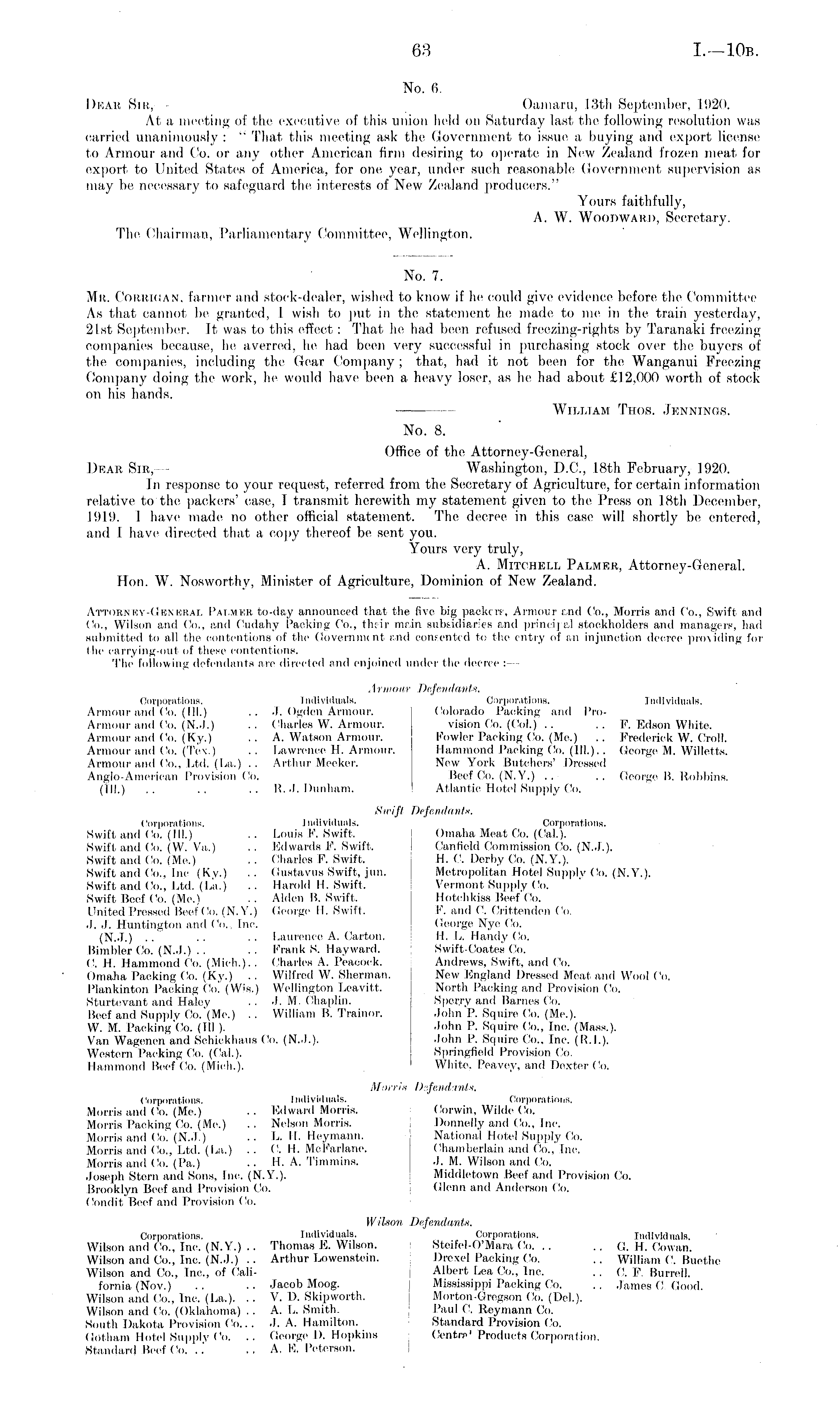 No. 6. Dear Sir, ■ Oamaru, 13th September, 1920. At a meeting of the executive of this union held on Saturday last the following resolution was carried unanimously: " That this meeting ask the Government to issue a. buying and export license to Armour and Co. or any either American firm desiring to operate in New Zealand frozen meat for export to United States of America, for one. year, under sue-h reasonable' Government supervision as may be necessary to safeguard the interests of New Zealand producers." Yours faithfully, A. W. Woodward, Secretary. The Chairman, Parliamentary Committee, Wellington. No. 7. Mr. Corrioan, farmer and stock-dealer, wished to know if he could give evidence be-fore the Commit lee As that cannot be granted, 1 wish to put in the- statement he made to me in the train yesterday. 21st September, It was to this effect: That he had been refused freezing-rights by Taranaki freezing companies because, he averred, he had been very successful in purchasing stock eiver the buyers of the companies, including the' Gear Company; that, had it not been for the; Wanganui Freezing Company doing the work, he would have- been a heavy loser, as he had about £12,000 worth of stock on. his hanels. William Thos. Jennings. No. 8. Office of the Attorney-General, Dear Sir,— Washington, D.C., 18th February, 1920. In response to your reepiest, referreei from the Secretary of Agriculture, for certain information relative to the: packers' case, I transmit herewith my statement given tei the Press on 18th December, It) 19. I have- made: no other official statement. The decree: in this case will shortly be entered, anel I have directed that a copy thereof lie- sent you. Yours very truly, A. Mitchell Palmer, Attorney-General, Hon. W. Nosworthy, Minister eif Agriculture, Dominion of Ne-w Zealand. Attornky-(lies Krai. Palmer to-day announced that the live l big pacta re, Armour end Co., Morris anil Co., Swift anil Co., Wilson anil Co., and Cudahy Paokirjg Co., their main subsidiaries and principal stockholders anil manager,", hail submitted to all the contentions of the Government anel consented to the entry of an injunction decree providing for I lie carrying-out of these contentions. The following defendants are directed and enjoined under the decree : . \miotir Defendants. Corporations. Individuals. Corporations. Individuals. Armour and Co. (111.) .. J. Ogden Armour, Colorado Packing and ProArmour and Co. (N.J.) .. Charles W. Armour. vision Co. (Col.) .. .. P. Edson White. Armour and Co. (Ky.) .. A. Watson Armour. Fowler Packing Co. (Me.) .. Frederick W. Croll. Armour and Co. (Tex.) . . Lawrence 11. Armour. Hammond Paoking Co. (III.). . George M. Wilh-lls. Armour and Co., Ltd. (La.) .. Arthur Meeker. Now York Butchers' Dressed Anglo-American Provision Co. licet Co. (N.Y.) .. .. George B. Robbins. (Til.) .. .. .. R.J.Dunham. Atlantic Hotel Supply Co. Swift Defendants. Corporations. I ndividuals. Corporations, Swift and Co. (III.) . . Louis P. Swift. Omaha Meat Co. (Cat). Swift and Co. (W. Va.) .. Edwards P. Swift. Canfleld Commission Co. (N..1.). Swift anel Co. (Me.) . . Charles P. Swift. 11. C. Derby Co. (N.Y.). Swift and Co., hie (Ky.) •• Gustavus Swift, jun, Metropolitan Hotel Supply Co. (N.Y.). Swift and Co., Ltd. (La.) . . Harold 11. Swift. Vermont Supply Co. Swift Beef Co. (Me.) .. Alden B. Swift. Hotchkiss Beef Co. United Pressed Beef Co. (N.Y.) George 11. Swift. P. and C. Crittenden Co. .). J. Huntington and Co., Inc. George Nye Co. (N.J.) .. .. .. Laurence A. Carton. 11. L. Handy Co. Bimbler Co. (N.J.) .. ■■ Pranks. Hayward. Swift-Coates Co. C. H. Hammond Co. (Mich.). . Charles A. Peacock. Andrews, Swift, anil Co. Omaha Packing Co. (Ky.) .. Wilfred VV. Sherman. Now England Dressed Meal and Wool Co. Plarikinton Packing Co. (Wis.) Wellington Lcavitf. North Paoking and Provision Co. Sturtcvant and Haley .. .I. M. Chaplin. Sperr-y and Barnes Co. Beef and Supply Co. (Me.) .. William It Trainer. John P. Squire Co. (Me.). W. M. Packing Co. (11l ). John I. Squire Co., Inc. (.Mass.). Van Wagonen and Schii khans Co. (N.J.). John P. Squire Co., Inc. (1t.1.). Western Paoking Co. (Cat). Springfield Provision Co. Hammond Beef Co. (Mich.). White. Pe-avey. and Dexter Co. Morris Defendants. Corporations. individuals. Corporations. Morris anil Co. (Me.) . . Edward Morris. Corwin, Wilde Co. Morris Packing Co. (Me.) .. Nelson Morris. Donnelly and Co., I in-. Morris and Co. (N.J.) •• L. 11. Heymann. National Hotel Supply Co. Morris and Co., Ltd. (La.) .. C. il. McFarlane. Chamberlain and Go., Inc. Morris and Co. (Pa.) .. H. A. Timmina. .1. M. Wilson and Co. Joseph Stern and Sons, Inc. (N.Y.). Middletown Beef and Provision Co. Brooklyn Beef and Provision Co. Glenn and Anderson Co. Condit Beef anel Provision Co. Wilson Defendants. Corporations. Individuals, Corporations. individuals. Wilson and Co., Ine-. (N.Y.) .. Thomas E. Wilson. Steifel-O'Mara Co. . . . . G. H. Cowan. Wilson and Co., Inc. (N.J.) .. Arthur Lowenstcin. Drexel Packing Co. .. William C. Buethe Wilson and Co., Inc., of Call- Albert Lea Co., Inc. .. C. |i\ Burrell. forma (Nov.) .. .. Jacob Moog. Mississippi Packing Co. .. James C Good. Wilson and Co., Inc. (La.). .. V. D. Skipworth. Morton-Gregson Co. (Del.). Wilson anil Co. (Oklahoma) . . A. L. Smith. Paul C. Heymann Co. South Dakota Provision Co.. . J. A. Hamilton. Standard Provision Co. Gotham Hotel Supply Co. .. George I >. Hopkins Centcp' Products Corporation. Standard Beef Co. ..' , , A. E, Peterson.