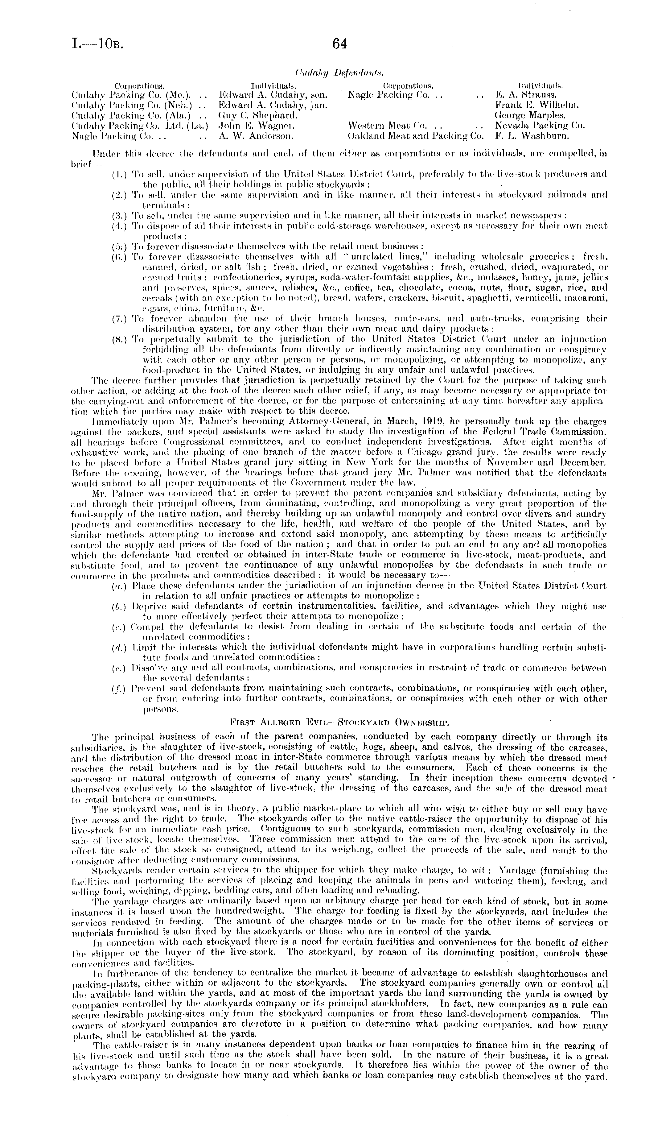 Cudahy Defendants. Corporations. Individuals. Corporations, individuals. Cudahy racking Co. (Me.), .. Edward A. Cudahy, sen. Nagle Packing Co. .. .. E. A. Strauss. Cudahy Packing Co. (Neb.) .. Edward A. Cudahy, jun.' Frank E. Wilhelm. Cudahy Packing Co. (Ala.) .. (illy ('. Shepherd. George MarpleS. Cudahy Packing Co. Ltd. (La.) John P.Wagner. Western Meat Co. .. .. Nevada Packing Co. Nagle Packing Co. .. ..A. W.Anderson, Oakland Meat, and Packing Co. F. L. Washburn. Under this decree the defendants and each of them either as corporations or as individuals, arc compelled,in brief (I.) To sell, under supervision of the United States District Court, preferably to the live-stock producers anil the- public, all their holdings in public stockyards : (2.) To sell, under the same supervision and in like manner, all their interests in stockyard railroads anel terminals : (.'!.) To sell, under the same supervision and in like manner, all their interests in market newspapers : (4.) 'I'o dispose of all their interests in public cold-storage warehouses, except as necessary for their own meat products : (5.) To forever disassociate themselves with the retail meat business: (6.) To forever disassociate themselves with all "unrelated lines," including wholesale groceries: fresh, canned, dried, or salt lish ; fresh, dried, or canned vegetables; fresh, crushed, dried, evaporated, or c'lned fruits; confectioneries, syrups, soda-water-fountain supplies, &c, molasses, homy, jams, jellies and preserves, spies, sauces, relishes, &c, rolfcc, tea, chocolate, cocoa, nuts, flour, sugar, rice, and cereals (with an exception to be uotsd), bread, waters, crackers, biscuit, spaghetti, vermicelli, macaroni, cigars, china, furniture, etc. (7.) To forever abandon the use of their branch houses, route-cars, and auto.trucks, comprising their distribution system, for any other than their own meat and dairy products : (,X.) To perpetually submit to (lie jurisdiction of the United States District Court under an injunction forbidding all the defendants from directly or Indirectly maintaining any combination or conspiracy with each other or any other person or persons, or monopolizing, or attempting to monopolize, any food-product in the t'niteil Slates, or indulging in any unfair and unlawful practices. The decree further provides that jurisdiction is perpetually retained by the Court for the l purpose of taking such other action, or adding at the foot of the decree such other relief, if any, as may become necessary or appropriate for the carrying-OUt arid enforcement of the decree, or for the' purpose of entertaining at any lime hereafter any application which the parties may make with respect to this decree. Immediately upon .Mr. Palmer's becoming Attorney-General, in March, 1919, he personally took up the charges against the packers, and special assistants were asked to study the investigation of the Federal 'trade Commission, all hearings before Congressional committees, and to conduct independent investigations. After eight months of exhaustive work, and the placing of one branch of the matter before a Chicago grand jury, the results were ready to be placed before a t'niteil States grand jury silting in New York for the months of November and December. Before the opening, however, of the healings before that grand jury Mr. Palmer was notified that the defendants would submit to all proper requirements of the Government under the law. Mr. Palmer was convinced that in order to prevent the parent companies and subsidiary defendants, acting by and through their principal officers, from dominating, controlling, and monopolizing a, very great proportion of the food-supply of the native nation, anil thereby building up an unlawful monopoly and control over divers and sundry products and commodities necessary to the life, health, and welfare of the people of the United States, and by similar methods attempting to increase and extend said monopoly, anil attempting by these means to artificially control the supply and prices of the food of the nation; and that, in order to put an end to any and all monopolies which the defendants had created or obtained in inter-Slate trade or commerce in live-stock, meat-products, and substitute food, anil to prevent the continuance of any unlawful monopolies by the defendants in such trade or commerce in the products and commodities described ; it would be necessary to (a.) Place these defendants under the jurisdiction of an injunction decree in the t'niteil States District Court in relation to all unfair practices or attempts to monopolize : (/i.) Deprive said defendants of certain instrumentalities, facilities, and advantages which they might use to more effectively perfect their attempts to monopolize; (r.) Compel the defendants to desist from dealing in certain of the substitute foods and certain of the unrelated commodities : (it.) Limit the interests which the individual defendants might have in corporations handling certain substitute foods anel unrelated commodities: (c.) Dissolve any anel all contracts, combinations, and conspiracies in restraint of trade or commerce between the- several defendants : (/'.) Prevent said defendants from maintaining such contracts, combinations, or conspiracies with each other. or from entering into further contracts, combinations, or conspiracies with each other or with other persons. First Alleged Evil —Stockyard Ownership. The principal business of each of the parent companies, conducted by e-aeh company directly or through its subsidiaries, is the slaughter of live-stock, consisting of cattle, hogs, sheep, and calves, the' dressing of the carcases, and the distribution of the dressed meat in inter-State commerce through various means by which the dressed meat reaches the retail butchers and is by the retail butchers sold to the consumers. Each of these concerns is the successor or natural outgrowth of concerns of many years' standing. In their incepti