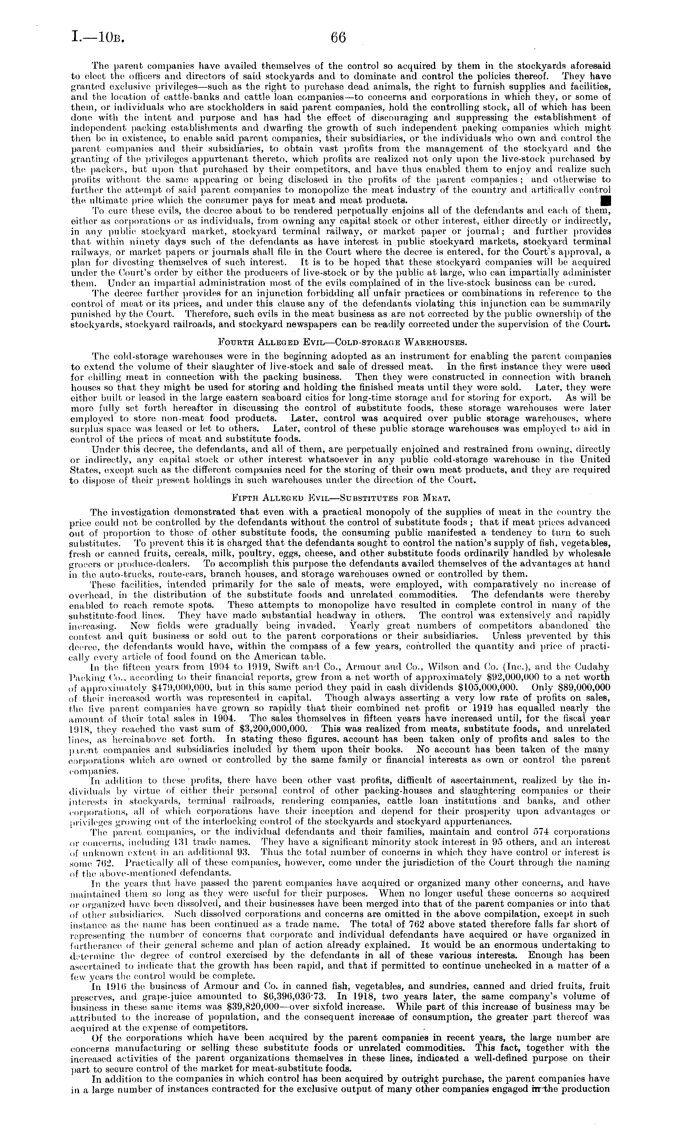 The parent companies have: availed themselves of the control so acquired by them in the stockyards aforesaid to elect thei officers anel directors of said stockyards and to dominate and control tho policies thereof. They have granted exclusive privileges—-such as the right to purchase deael animals, the right to furnish supplies and facilities, and the location of cattle-banks and cattle loan companies—to concerns and corporations in which they, or some of them, or individuals who are stockholders in said parent companies, holel the controlling stock, all of which has been done witli the: intent and purpose and has had the effect of discouraging and suppressing the establishment of independent packing establishments anil dwarfing the growth of such indepenelent packing companies which might then bo in existence, to enable said parent companies, their subsidiaries, or the individuals who own and control the parent companies and their subsidiaries, to obtain vast profits from the management of the stockyard anel the granting of the privileges appurtenant thereto, which profits are realized not only upon the live-stock purchased by the packers, but upon that purchased by their competitors, and have thus enabled them to enjoy and realize such profits without the same appearing or being disclosed in the profits of the parent companies ; and otherwise to further the attempt of said parent companies to monopolize the meat industry eif the country and artifioally control the ultimate price which the consumer pays for meat and meat products. To cure these evils, the decree about to be rendered perpetually enjoins all of the elefendants anel each of them, either as corporations or as individuals, from owning any capital stock or either interest, either directly or indirectly, in any public stockyard market, stockyard terminal railway, or market paper or journal ; and further provides that within ninety days such of the defendants as have interest in public stockyard markets, stockyarel terminal railways, or market papers or journals shall file in the Court where the elecree is entered, for the Court's approval, a plan for divesting themselves of such interest. It is to be helped that these: stockyarel companies will be acquired uneler the Court's order by either the producers of live-stock or by the public at large, who can impartially aeiininister them. Under an impartial administration most of the evils complained of in the live-stock business can be cured. The decree further provides for an injunction forbidding all unfair practices or combinations in reference to the control of meat or its prices, anel under this clause any of the defendants violating this injunction can be: summarily punished by the: Court. Therefore, such evils in the meat business as are not corrected by the public ownership of the stockyards, stockyarel railroaels, anel stockyarel newspapers can be readily corrected under the supervision of the Court. Fourth Alleged Evil —Cold-storaoe Warehouses. The colel-storage warehouses were in the beginning adopted as an instrument for enabling the parent companies to extend the, volume of their slaughter of live-stock and sale: of dressed meat. In the first instance they were useel for chilling meat in connection with the, packing business. Then they were constructed in connection with branch houses so that they might be usee! for storing and holding the finished meats until they were sold. Later, they were either built or loasoel in the large eastern seaboard cities for long-time storage and for storing for export. As will be more fully set forth hereafter in discussing the control of substitute foods, these storage warehouses were later employed to store non-meat fooel products. Later, control was acquired over public storage warehouses, where surplus space was leased or let to others. Later, control of these public storage warehouses was employed to aid in control of the prices of moat and substitute foods. Under this elecree, the defendants, and all of them, are perpetually enjoined anel restrained from owning, directly or indirectly, any capital stock or other interest whatsoever in any public cold-storage warehouse in the United States, except such as the different companies neeel for the storing of their own meat products, anil they are required to dispose of their present holdings in such warehouses uneler the direction of the Court. Fifth Alleged Evil—Substitutes for Meat. The investigation demonstrated that even with a practical monopoly of the supplies of meat in the country the price could not be controlled by the elefendants without the control of substitute foods ; that if meat prices advanceel out of proportion to those of other substitute fooels, the consuming public manifested a tendency tei turn to such substitutes. To prevent this it is charged that the elefendants sought to control the nation's supply of fish, vegetables, fresh or canned fruits, cereals, milk, poultry, eggs, cheese, and other substitute foods ordinarily handled by wholesale grocers or produce-dealers. To accomplish this purpose ttie elefendants availeel themselves of the advantages at hanel in the auto-trucks, route-cars, branch houses, and storage warehouses owned or controlled by them. These facilities, inteneled primarily for the sab of meats, were employed, with comparatively no increase of overhead, in the distribution of the substitute fooels and unrelatoel ceimmodities. The defendants were thereby enabled to reach remote spots. These attempts to monopolize have resulted in complete control in many of the substitute-food linos. They have mado substantial headway in others. The control was extensively and rapidly increasing. Now fields were gradually being invaeied. Yearly great numbers of competitors abandoned the oontest anil quit business or sold out to the parent corporations or their subsidiaries. Unless prevented by this decree, the elefendants would have, within the compass of