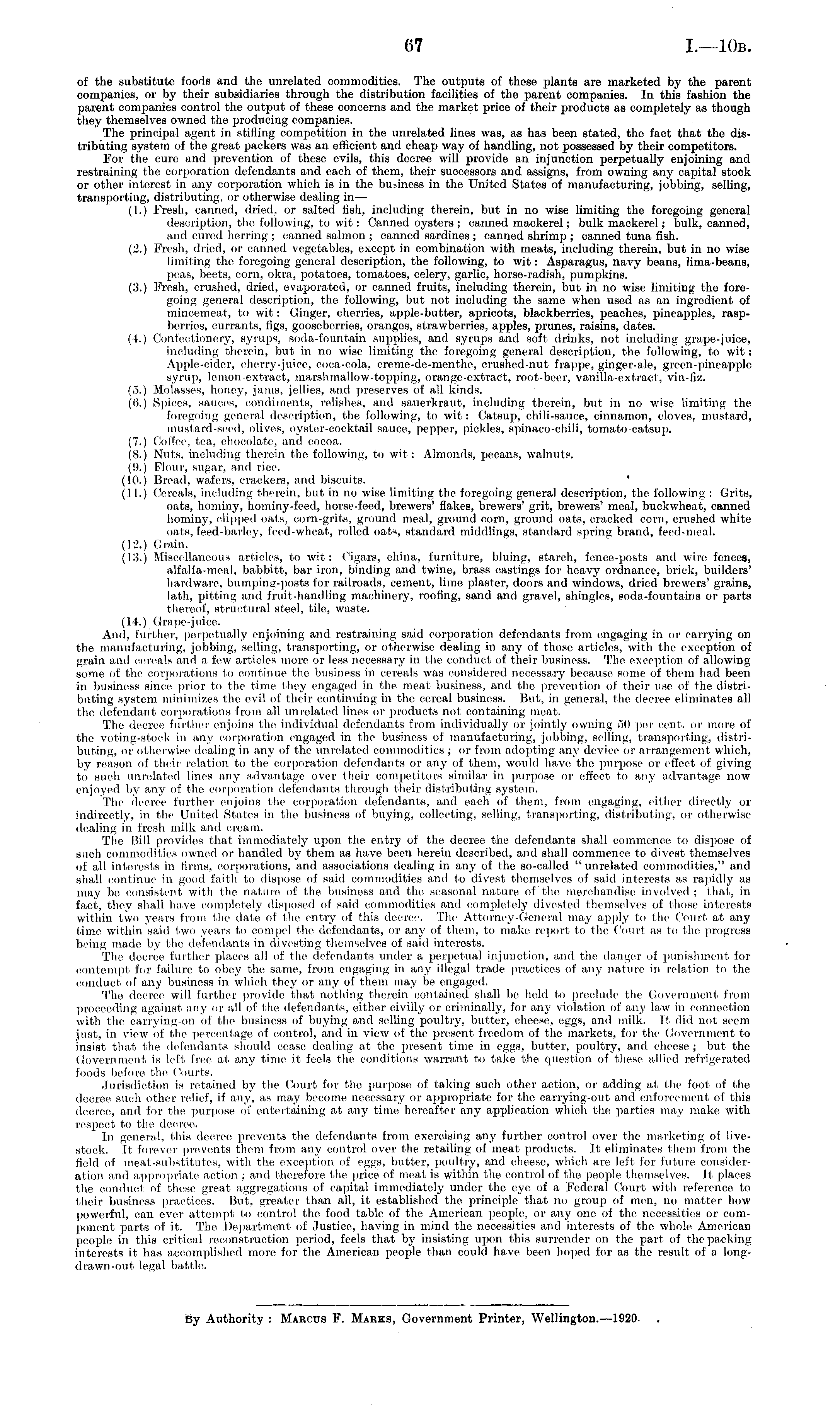 of the substitute foods and the unrelated commodities. The outputs of these plants are marketed by the parent companies, or by their subsidiaries through the distribution facilities of the parent companies. In this fashion the parent companies control the output of these concerns anil the market price of their products as completely as though they themselves owned the producing companies. The principal agent in stifling competition in the unrelated lines was, as has been stated, the fact that the distributing system of the great packers was an efficient and cheap way of handling, not possessed by their competitors. For the cure and prevention of these evils, this decree will provide an injunction perpetually enjoining and restraining the corporation defendants and each of them, their successors and assigns, from owning any capital stock or other interest in any corporation which is in the business in the United States of manufacturing, jobbing, selling, transporting, distributing, or otherwise dealing in— (1.) Fresh, canned, dried, or salted fish, including therein, but in no wise limiting the foregoing general description, tho following, to wit: Canned oysters ; canned mackerel; bulk mackerel; bulk, canned, and cured herring ; canned salmon ; canned sarelines ; canned shrimp ; canned tuna fish. (2.) Fresh, dried, or canned vegetables, except in combination with meats, including therein, but in no wise limiting the foregoing general description, the following, to wit: Asparagus, navy beans, lima-beans, peas, beets, corn, okra, potatoes, tomatoes, celery, garlic, horse-radish, pumpkins. (3.) Fresh, crushed, dried, evaporated, or canned fruits, including therein, but in no wise limiting the foregoing general description, the following, but not including tho same when used as an ingredient of mincemeat, to wit: Ginger, cherries, apple-butter, apricots, blackberries, peaches, pineapples, raspberries, currants, figs, gooseberries, oranges, strawberries, apples, prunes, raisins, dates. (4.) Confectionery, syrups, soda-fountain supplies, and syrups and soft drinks, not including grape-juice, including therein, but in no wise limiting the foregoing general description, the following, to wit: Apple-cider, cherry-juice, coca-cola, creme-de-menthc, crushed-nut frappe, ginger-ale, green-pineapple syrup, lemon-extract, marshmallow-topping, orange-extraeit, root-beer, vanilla-extract, vin-fiz. (5.) Molasses, honey, jams, jellies, and preserves of all kinds. (6.) Spices, sauces, condiments, relishes, anel sauerkraut, inchuling therein, but in no wise limiting the foregoing general description, the following, to wit: Catsup, chili-sauce, cinnamon, cloves, mustard, mustard-seed, olives, oyster-cocktail sauce, pepper, pickles, spinaco-chili, tomato-catsup. (7.) Coffee-, tea, chocolate, and cocoa. (8.) Nuts, including therein the following, to wit: Almonds, pecans, walnuts. (9.) Flour, sugar, and rice. (10.) Bread, wafers, crackers, and biscuits. (11.) Cereals, including therein, but in no wise limiting the foregoing general description, the following : Grits, oats, hominy, hominy-feed, horse-feed, brewers' flakes, brewers' grit, brewers' meal, buckwheat, canned hominy, clipped oats, corn-grits, ground meal, ground corn, ground oats, cracked corn, crushed white: oats, feed-barley, feed-wheat, rolled oats, standard middlings, standard spring brand, feed-meal. (12.) Grain. (13.) Miscellaneous articles, to wit: Cigars, china, furniture, bluing, standi, fence-posts and wire fences, alfalfa-meal, babbitt, bar irein, binding and twine, brass castings for heavy ordnance, brick, builders' hardware, bnmping-posts for railroads, cement, lime plaster, doors and windows, elrieel brewers' grains, lath, pitting and fruit-handling machinery, roofing, sand and gravel, shingles, soda-fountains or parts thereof, structural steel, tile, waste. (14.) Grape-juice. And, further, perpetually enjoining anel restraining said corporation defendants from engaging in or carrying on the manufacturing, jobbing, selling, transporting, or otherwise elealing in any of those articles, with the exception of grain and cereals and a few articles more or less necessary in the conduct of their business. The exception of allowing some of the corporations to continue the business in cereals was considered necessary because some of them had been in business since prior to the time they engaged in the meat business, and the prevention of their use of the distributing system minimizes the evil of their continuing in the cereal business. But, in general, the elecree eliminates all the defendant corporations from all unrelateel lines or products not containing meat. The decree further enjeiins the individual defendants from individually or jointly owning 50 per cent, or more of the voting-stock in any corporation e-ngaged in the business of manufacturing, jobbing, selling, transporting, distributing, or otherwise dealing in any of the unrelated commodities ; or from adopting any device or arrangement which, by reason of their relation to the corporation defendants or any of them, would have the purpose or effect of giving to such unrelated lines any advantage over their competitors similar in purpose or effect to any advantage now enjoyed by any of the corporation defendants through their distributing system. The elecree further enjeiins the corporation defendants, and each of them, from engaging, cither directly or indirectly, in the United States in the business of buying, collecting, selling, transporting, distributing, or otherwise dealing in fresh milk and cream. The Bill provides that immediately upon the entry of the decree the defendants shall commence to elispose of such commodities eiwned or handled by them as have been herein describee!, and shall commence to divest themselves of all interests in firms, corporations, and associations elealing in any of the so-called "unrelated commodities," and shall continue in good faith to dispose of s