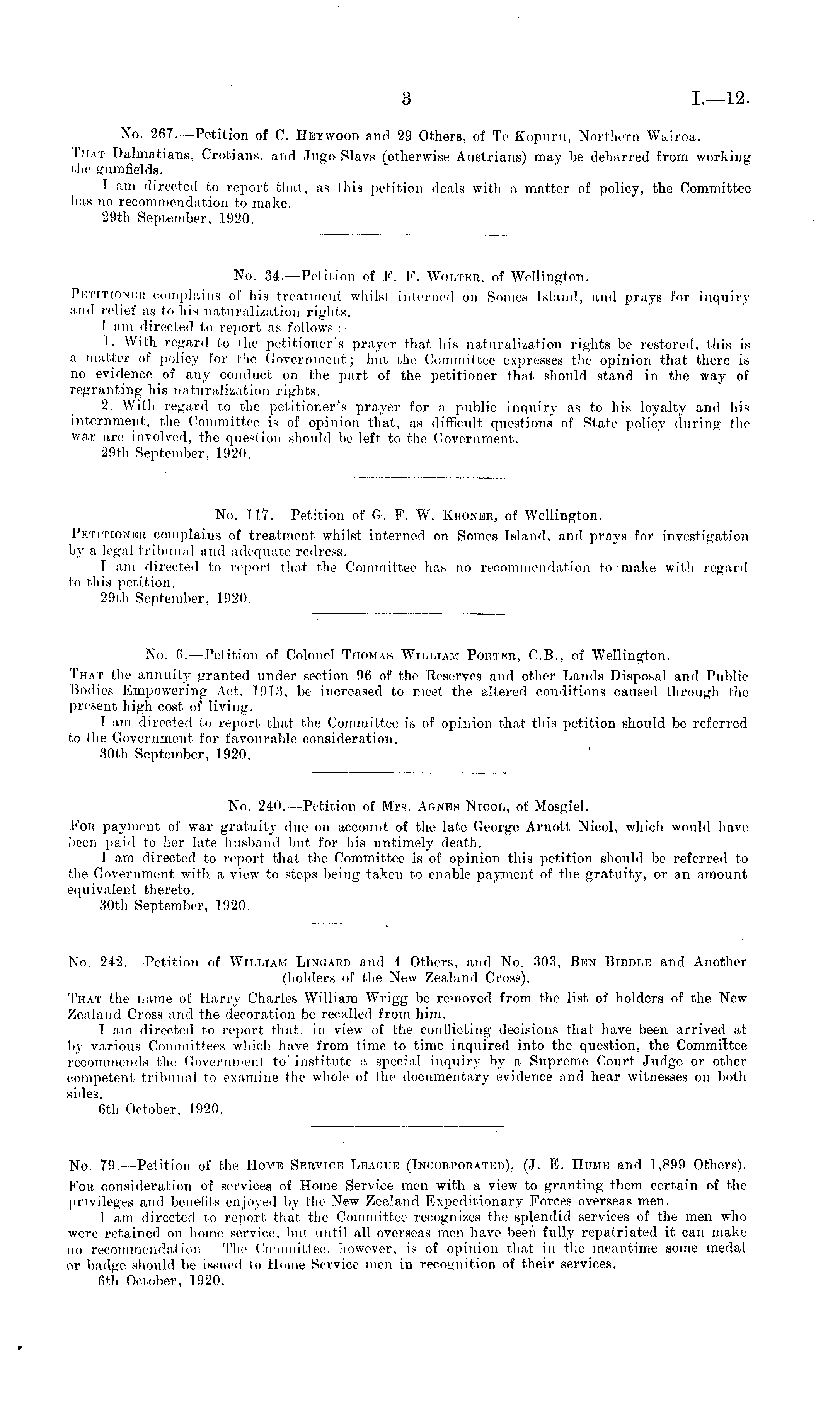 No. 267.—Petition of C. Heywood and 29 Others, of Te Kopuru, Northern Wairoa. I hat Dalmatians, Crotians, and Jugo-Slavs (otherwise Austrians) may be debarred from working the gumfields. I am directed to report that, as this petition deals with a matter of policy, the Committee has no recommendation to make. 29th September, 1920.