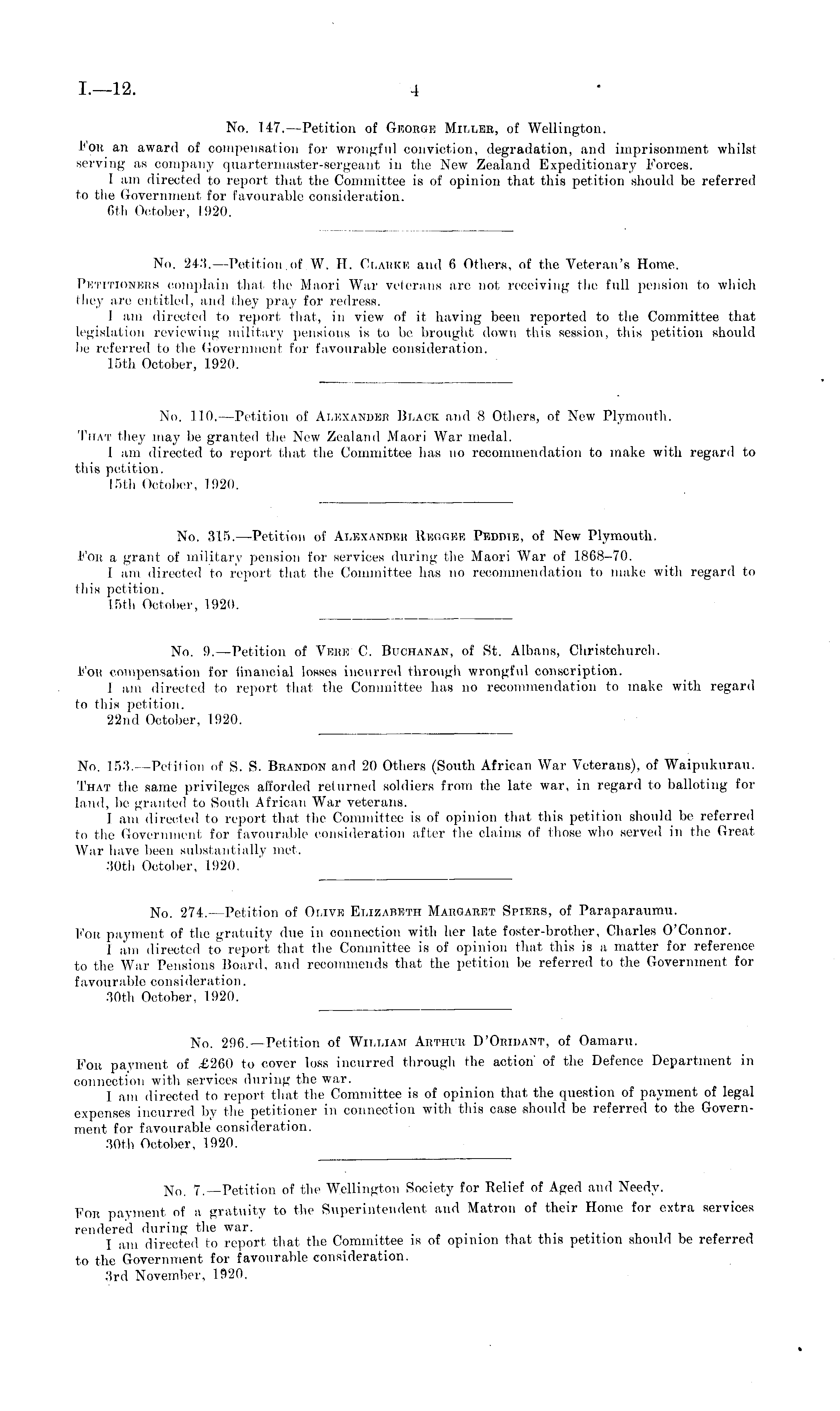 No. 243.—Petition of W. H. Clarke and (! Others, of the Veteran's Home. Petitionees complain that, the Maori War veterans are not receiving the full pension to which I hey are entitled, and they pray for redress. I am directed to report that, in view of it having been reported to the Committee that legislation reviewing military pensions is to be brought down this session, this petition should be referred to the Government, for favourable consideration. 15th October, 192(1.