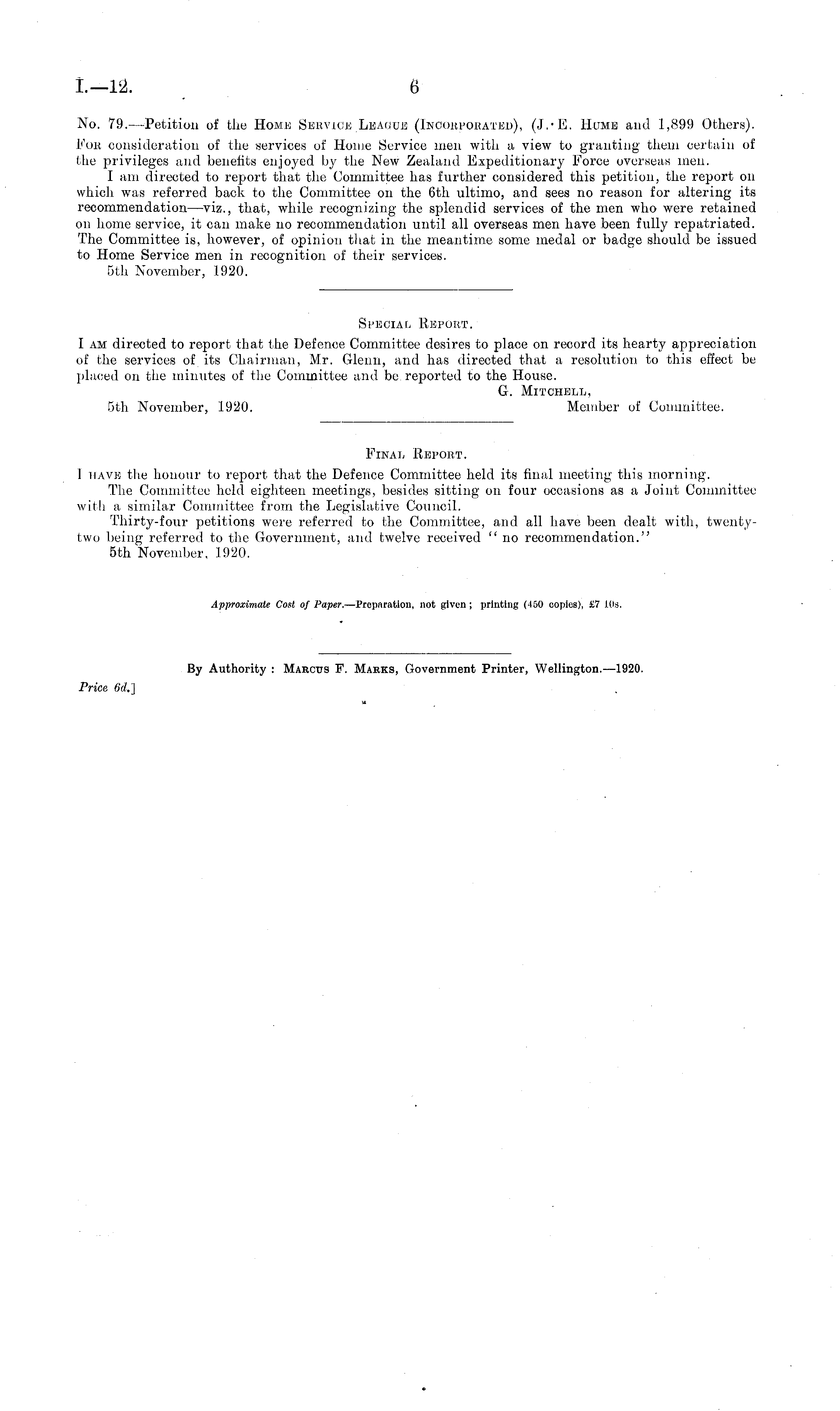 Final Report. I have the honour to report that the Defence Committee held its final meeting this morning. The Committee held eighteen meetings, besides sitting on four occasions as a Joint Committee with a similar Committee from the Legislative Council. Thirty-four petitions were referred to the Committee, and all have been dealt with, twentytwo being referred to the Government, and twelve received " no recommendation." sth November, 1920.