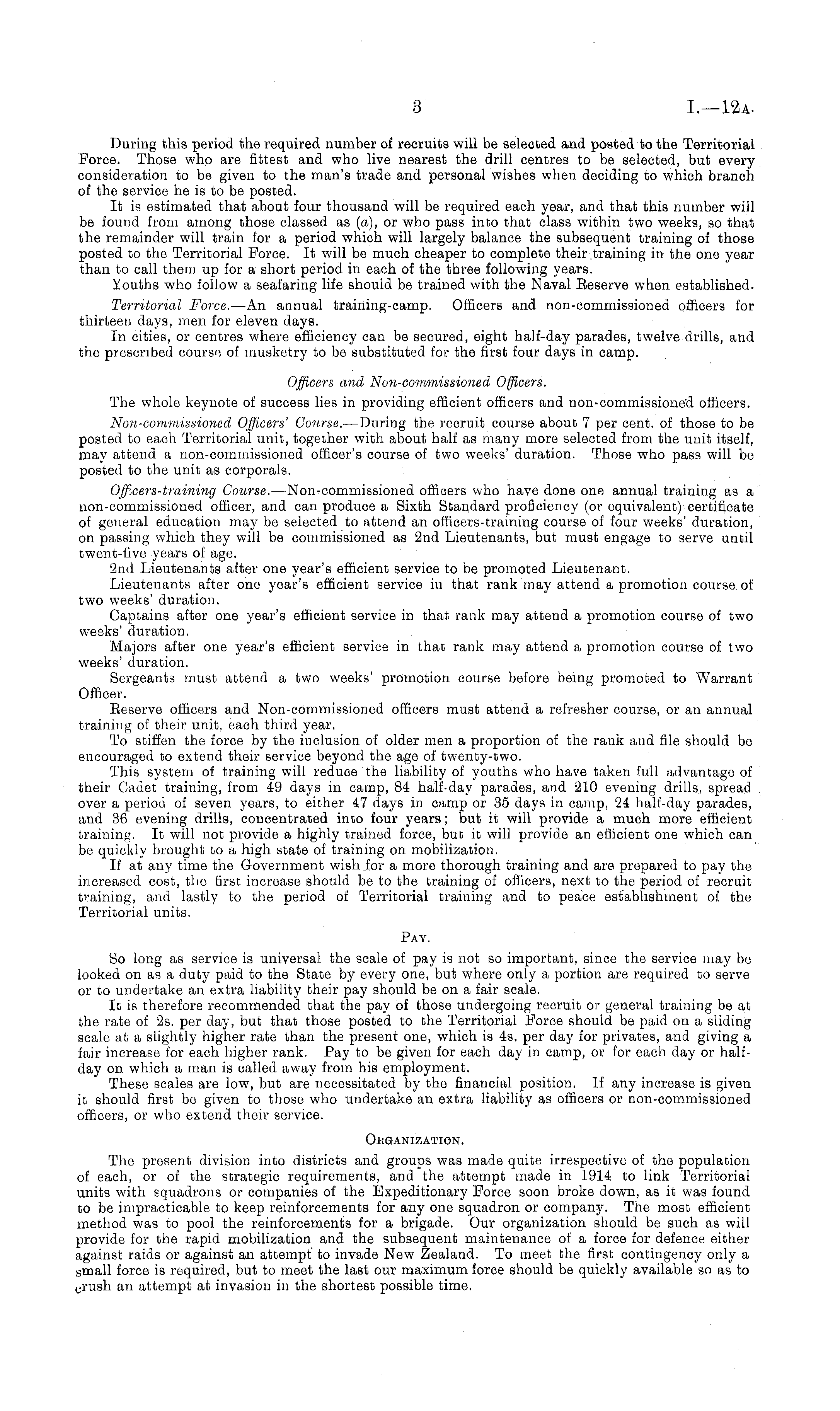 During this period the required number of recruits will be selected and posted to the Territorial Force. Those who are fittest and who live nearest the drill centres to be selected, but every consideration to be given to the man's trade and personal wishes when deciding to which branch of the service he is to be posted. It is estimated that about four thousand will be required each year, and that this number will be found from among those classed as (a), or who pass into that class within two weeks, so that the remainder will train for a period which will largely balance the subsequent training of those posted to the Territorial Force. It will be much cheaper to complete their training in the one year than to call them up for a short period in each of the three following years. Youths who follow a seafaring life should be trained with the Naval Reserve when established. Territorial Force. —An annual training-camp. Officers and non-commissioned officers for thirteen days, men for eleven days. In cities, or centres where efficiency can be secured, eight half-day parades, twelve drills, and the prescribed course of musketry to be substituted for the first four days in camp. Officers and Non-commissioned Officers. The whole keynote of success lies in providing efficient officers and non-commissioned officers. Non-commissioned Officers' Course. —During the recruit course about 7 per cent, of those to be posted to each Territorial unit, together with about half as many more selected from the unit itself, may attend a non-commissioned officer's course of two weeks' duration. Those who pass will be posted to the unit as corporals. Officers-training Course. —Non-commissioned officers who have done one annual training as a non-commissioned officer, and can produce a Sixth Standard proficiency (or equivalent) certificate of general education may be selected to attend an officers-training course of four weeks' duration, on passing which they will be commissioned as 2nd Lieutenants, but must engage to serve until twent-five years of age. 2nd Lieutenants after one year's efficient service to be promoted Lieutenant. Lieutenants after one year's efficient service in that rank may attend a promotion course of two weeks' duration. Captains after one year's efficient service in that rank may attend a promotion course of two weeks' duration. Majors after one year's efficient service in that rank may attend a promotion course of two weeks' duration. Sergeants must attend a two weeks' promotion course before being promoted to Warrant Officer. Eeserve officers and Non-commissioned officers must attend a refresher course, or an annual training of their unit, each third year. To stiffen the force by the inclusion of older men a proportion of the rank and file should be encouraged to extend their service beyond the age of twenty-two. This system of training will reduce the liability of youths who have taken full advantage of their Cadet training, from 49 days in camp, 84 half-day parades, and 210 evening drills, spread over a period of seven years, to either 47 days in camp or 35 days in camp, 24 half-day parades, and 36 evening drills, concentrated into four years; but it will provide a much more efficient training. It will not provide a highly trained force, but it will provide an efficient one which can be quickly brought to a high state of training on mobilization. If at any time the Government wish for a more thorough training and are prepared to pay the increased cost, the first increase should be to the training of officers, next to the period of recruit training, and lastly to the period of Territorial training and to peace establishment of the Territorial units. Pay. So long as service is universal the scale of pay is not so important, since the service may be looked on as a duty paid to the State by every one, but where only a portion are required to serve or to undertake an extra liability their pay should be on a fair scale. It is therefore recommended that the pay of those undergoing recruit or general training be at the rate of 2s. per day, but that those posted to the Territorial Force should be paid on a sliding scale at a slightly higher rate than the present one, which is 4s. per day for privates, and giving a fair increase for each higher rank. Pay to be given for each day in camp, or for each day or halfday on which a man is called away from his employment. These scales are low, but are necessitated by the financial position. If any increase is given it should first be given to those who undertake an extra liability as officers or non-commissioned officers, or who extend their service. Organization. The present division into districts and groups was made quite irrespective of the population of each, or of the strategic requirements, and the attempt made in 1914 to link Territorial units with squadrons or companies of the Expeditionary Force soon broke down, as it was found to be impracticable to keep reinforcements for any one squadron or company. The most efficient method was to pool the reinforcements for a brigade. Our organization should be such as will provide for the rapid mobilization and the subsequent maintenance of a force for defence either against raids or against an attempt to invade New Zealand. To meet the first contingency only a small force is required, but to meet the last our maximum force should be quickly available so as to crush an attempt at invasion in the shortest possible time.