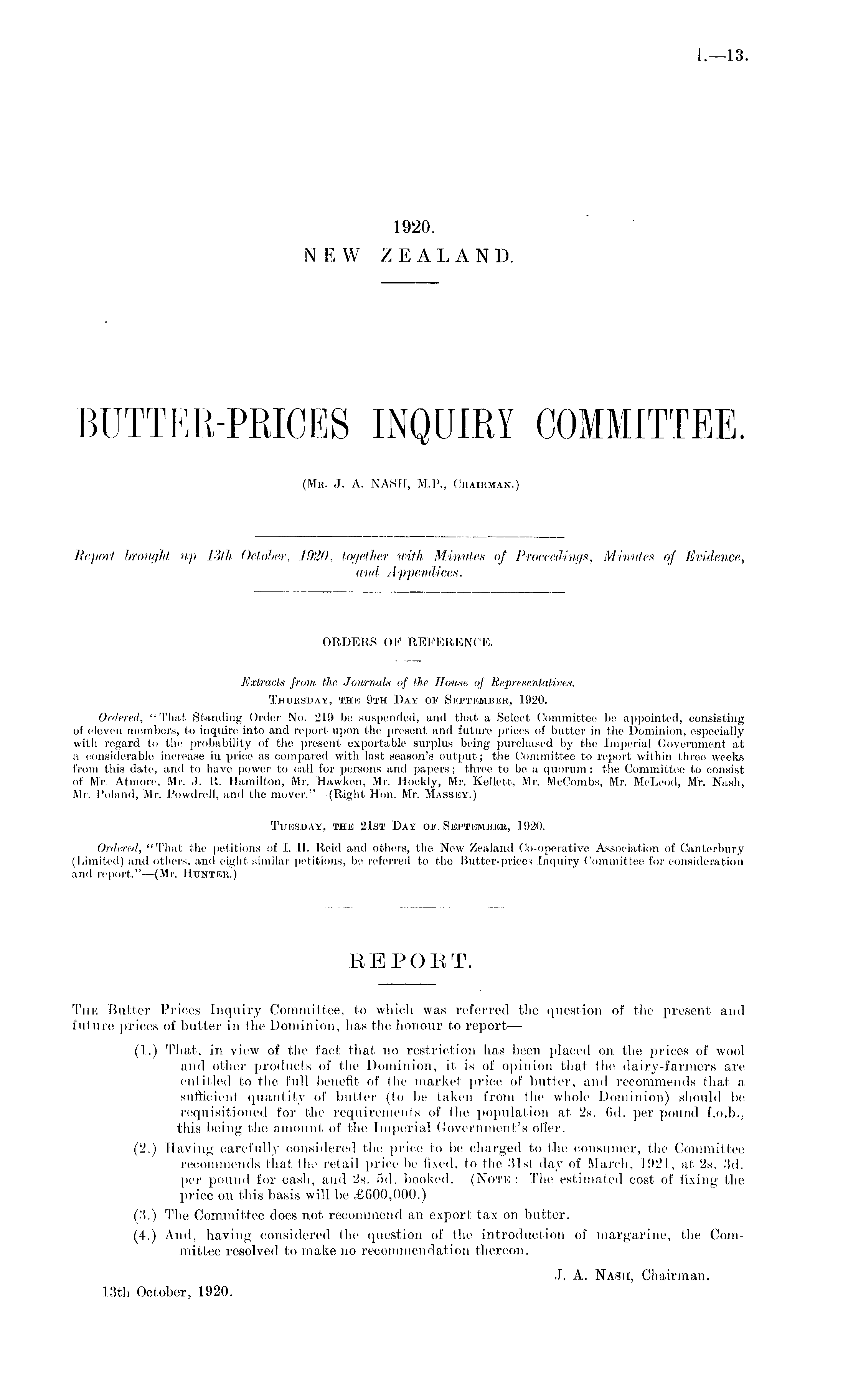 ORDERS OF REFERENCE. Extracts from, the Journals of the House of Representatives. Thursday, thk 9th Day of September, 1920. Ordered, " That Standing Order No. 219 be suspended, and that a Select Committee be appointed, consisting of eleven members, to inquire into and report upon the present and future prices of butter in the Dominion, especially with regard to the probability of the present exportable surplus being purchased by the Imperial Government at a considerable increase in price as compared with last season's output; the Committee to report within three weeks from this date, and to have power to call for persons and papers; three to be a quorum: the Committee to consist of Mr. Atmore, Mr. J. R. Hamilton, Mr. Hawken, Mr. Hockly, Mr. Kellett, Mr. McCombs, Mr. McLeod, Mr. Nash, Mr. Poland, Mr. Powdrell, and the mover."—(Right Hon. Mr. Massey.) Tuesday, the 21st Day' oe. Septkmher, 1920. Ordered, "That the petitions of I. H. Reld and others, the New Zealand Co-operative Association of Canterbury (Limited) and others, and eight similar petitions, be referred to the Butter-price< Inquiry Committee for consideration and report."—(Mr. Hunter.) EEPOET. Tim Butter Prices Inquiry Committee, to which was referred the question of the present and future prices of butter in the Dominion, lias the honour to report — (1.) That, in view of the fact that no restriction has been placed on the prices of wool and other products of the Dominion, it is of opinion that the dairy-farmers are entitled to the full benefit of I lie market price of butter, and recommends that a sufficient quantity of butter (to be taken from Hie whole Dominion) should be requisitioned for the requirements of the population at 2s. Gil. per pound f.0.b., this being the amount of the Imperial Government's offer. (2.) Having carefully considered the price to be charged to the consumer, the Committee recommends that the retail price be fixed, to the 31st, day of March, 1921, at 2s. 3d. per pound for cash, and 2s. Bd. booked. (Note : The estimated cost of fixing the price on this basis will be £600,000.) (3.) The Committee does not recommend an export tax on butter. (4.) And, having considered the question of tbe introduction of margarine, the Committee resolved to make no recommendation thereon. J. A. Nash, Chairman. 13th October, 1920.