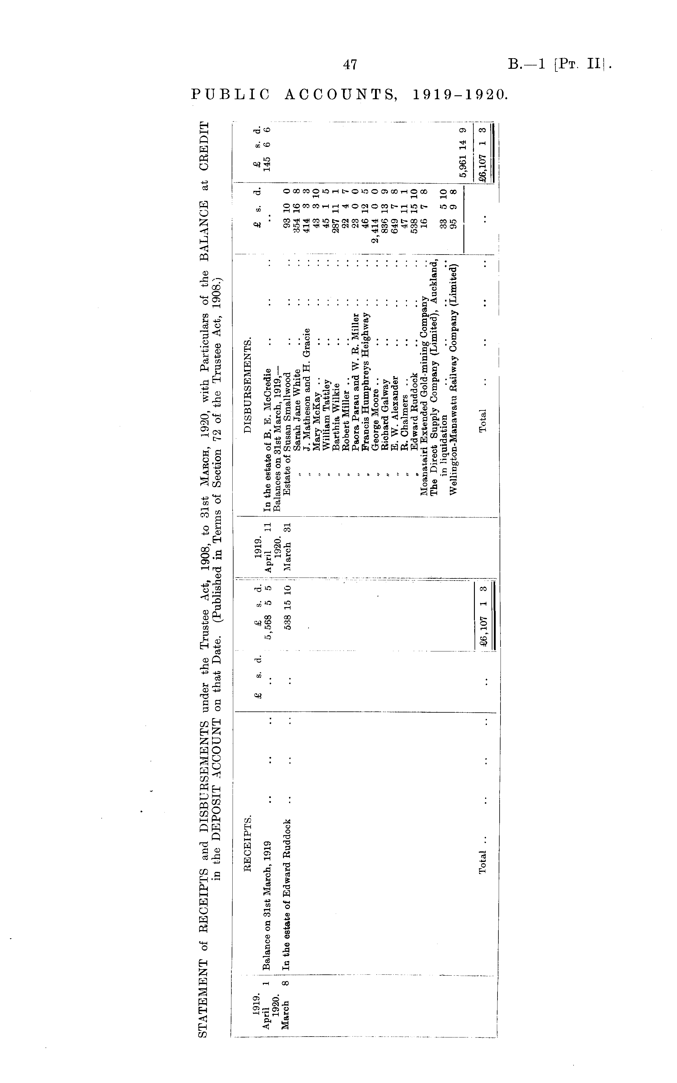 RECEIPTS. DISBURSEMENTS. 1919. April 1 Balance on 31st March, 1919 1920. March 8 In the estate of Edward Ruddock £ s. d. £ s. d. 1919. 5,568 5 5 April 11 1920. 538 15 10 March 31 £ s. d. In the estate of B. E. McCredie Balances on 31st March, 1919, — Estate of Susan Smallwood .. .. .. 93 10 0 Sarah Jane White .. .. .. 354 16 8 J. Matheson and H. Gracie .. .. 414 3 3 Mary McKay .. .. -. .. 43 3 10 William Tattlev .. .. .. 45 1 5 Barthia Wilkie" .. .. .. 287 11 1 Robert Miller .. .. .. .. 22 4 7 Paora Parau and W. R. Miller .. .. 23 0 0 Francis Humphreys Heighway .. .. 46 12 5 George Moore .. .. .. .. 2,414 0 0 Richard Galway .. .. .. 836 13 9 E. W. Alexander .. .. .. 649 7 8 R. Chalmers .. .. .. .. 47 11 1 Edward Ruddock .. .. .. 538 15 10 Moanatairi Extended Gold-mining Company .. 16 7 8 The Direct Supply Company (Limited), Auckland, in liquidation .. .. .. .. 33 5 10 Wellington-Manawatu Railway Company (Limited) 95 9 8 £ s. d. 145 6 6 5,961 14 9 Total .. •• £6,107 1 3 Total £6,107 1 3
