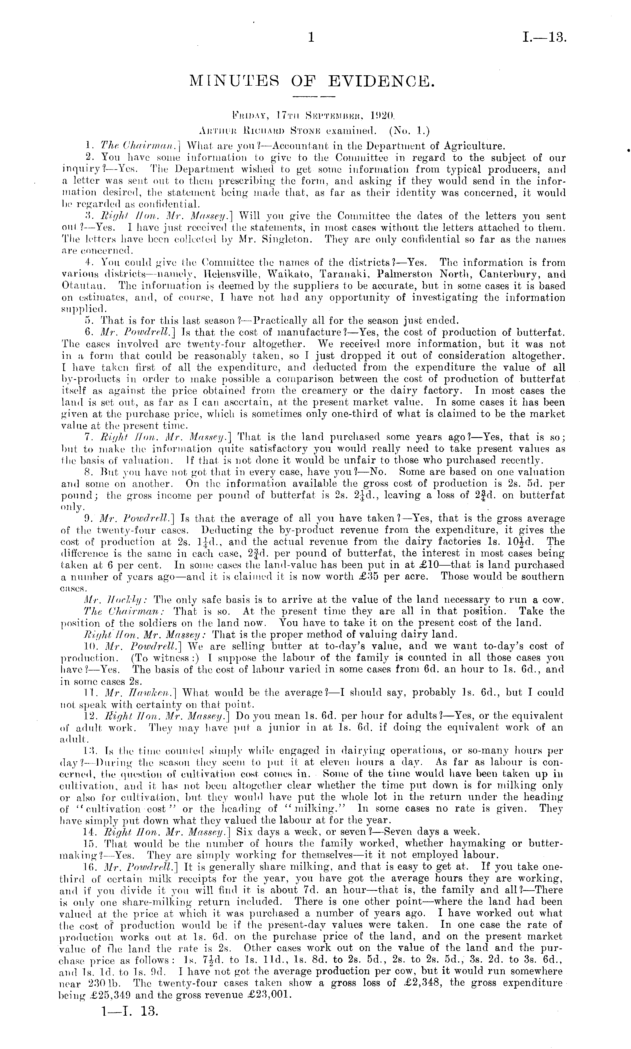 MINUTES OF EVIDENCE. Friday, I7tii September, 1920, Arthur Richard Stone examined. (No. I.) 1. The Chairman.] What are you? —Accountant in the Department of Agriculture. 2. You have some information to give to the Committee in regard to the subject of our inquiry?— Yes. The Department wished to get some information from typical producers, and a, letter was sent out to them prescribing the form, and asking if they would send in the information desired, the statement being made that, as far as their identity was concerned, it would be regarded as confidential. 3. Right Hon. Mr. Massey.] Will you give the Committee the dates of the letters you sent oill ?—Yes. I have just received Ihe statements, in most cases without the letters attached to them. The letters have been collected by Mr. Singleton. They are only confidential so far as the names are concerned. 4. You could give the Committee the names of the districts? —Yes. The information is from various districts —namely, Ilelensville, Waikato, Taranaki, Paluterston North, Canterbury, and Otautau. The information is deemed by the suppliers to be accurate, but in some cases it is based on estimates, and, of course, I have not had any opportunity of investigating the information supplied. 5. That is for this last season? —Practically all for the season just, ended. 6. Mr. Powdrell.] Is that the cost of manufacture? —Yes, the cost of production of butterfat. The cases involved are twenty-four altogether. We received more information, but it was not in a form that could be reasonably taken, so I just dropped it out of consideration altogether. I have taken first of all the expenditure, and deducted from the expenditure the value of all by-products in order to make possible a comparison between the cost of production of butterfat itself as against the price obtained from the creamery or the dairy factory. In most cases the land is set out, as far as I can ascertain, at the present market value. In some cases it has been given at the purchase price, which is sometimes only one-third of what is claimed to be the market value at the present time. 7. Right Hon. Mr. Massey.] That is the land purchased some years ago?— Yes, that is so; but to make the information quite satisfactory you would really need to take present values as the basis of valuation. If that is not tlone it would be unfair to those who purchased recently. 8. But you have not got that in every case, have you? —No. Some are based on one valuation and some on another. On the information available the gross cost of production is 2s. sd. per pound; the gross income per pound of butterfat is 2s. 2 ; |d., leaving a loss of 2|d. on butterfat only. 9. Mr. Powdrell.] Is that the average of all you have taken?— Yes, that is the gross average of the twenty-four cases. Deducting the by-product revenue from the expenditure, it gives the cost of production at 2s. ljd., and the actual revenue from the dairy factories Is. IOJd. The difference is the same in each case, 2|d. per pound of butterfat, the interest in most cases being taken at 6 per cent. In some cases the land-value has been put in at £10—that is land purchased a number of years ago—antl it is claimed it is now worth £35 per acre. Those would be southern cases. Mr. Hockly: The only safe basis is to arrive at the value of the land necessary to run a cow. The Chairman: That is so. At the present time they are all in that position. Take the position of the soldiers on the land now. You have to take it, on the present cost of the land. Right Hon. Mr. Massey: That is the proper method of valuing tlairy land. 10. Mr. Powdrell.] We are selling butter at to-day's value, and we want to-day's cost of production. (To witness:) I suppose the labour of the family is counted in all those cases you have? —Yes. The basis of the cost of labour varied in some cases from 6d. an hour to Is. 6d., and in some cases 2s. 11. Mr. Hawken.] What would be the average?—l should say, probably Is. 6d., but I could not speak with certainty on that point. 12. Right If on, Mr. Massey.] Do you mean Is. Gd. per hour for adults? —Yes, or the equivalent of adult work. They may have pul a junior in at Is. (id. if doing the equivalent work of an adult. 13. Is the time counted simply while engaged in dairying operations, or so-many hours per day?— During the season they seem lo put il at eleven hours a day. As far as labour is concerned, the question of cultivation cost comes in. Some of the time would have been taken up in cultivation, and it has not been altogether clear whether the time put down is for milking only or also for cultivation, but they would have put the whole lot in the return under the heading of "cultivation cost" or the heading of "milking." In some cases no rate is given. They have simply put down what they valued the labour at for the year. 14. Right Hon. Mr. Massey.] Six days a week, or seven?— Seven days a week. 15. That would be the number of hours the family worked, whether haymaking or buttermaking?—Yes. They are simply working for themselves —it it not employed labour. 16. Mr. Powdrell.] It is generally share milking, and that is easy to get at. If you take onethird of certain milk receipts for the year, you have got, the average hours they are working, and if you divide it you will find it is about 7d. an hour —that is, the family and all? —There is only one share-milking return included. There is one other point—where the land had been valued at the price at which it was purchased a number of years ago. I have worked out what the cost of production would be if the present-day values were taken. In one case the rate of production works out at Is. 6d. on the purchase price of the land, and on the present market value of flic land the rate is 2s. Other cases work out on the value of the land and the purchase price as follows: Is. 7|d. to Is. lid., Is. Bd. to 2s. 5d., 2s. to 2s. 5d., 3s. 2d. to 3s. 6d., and