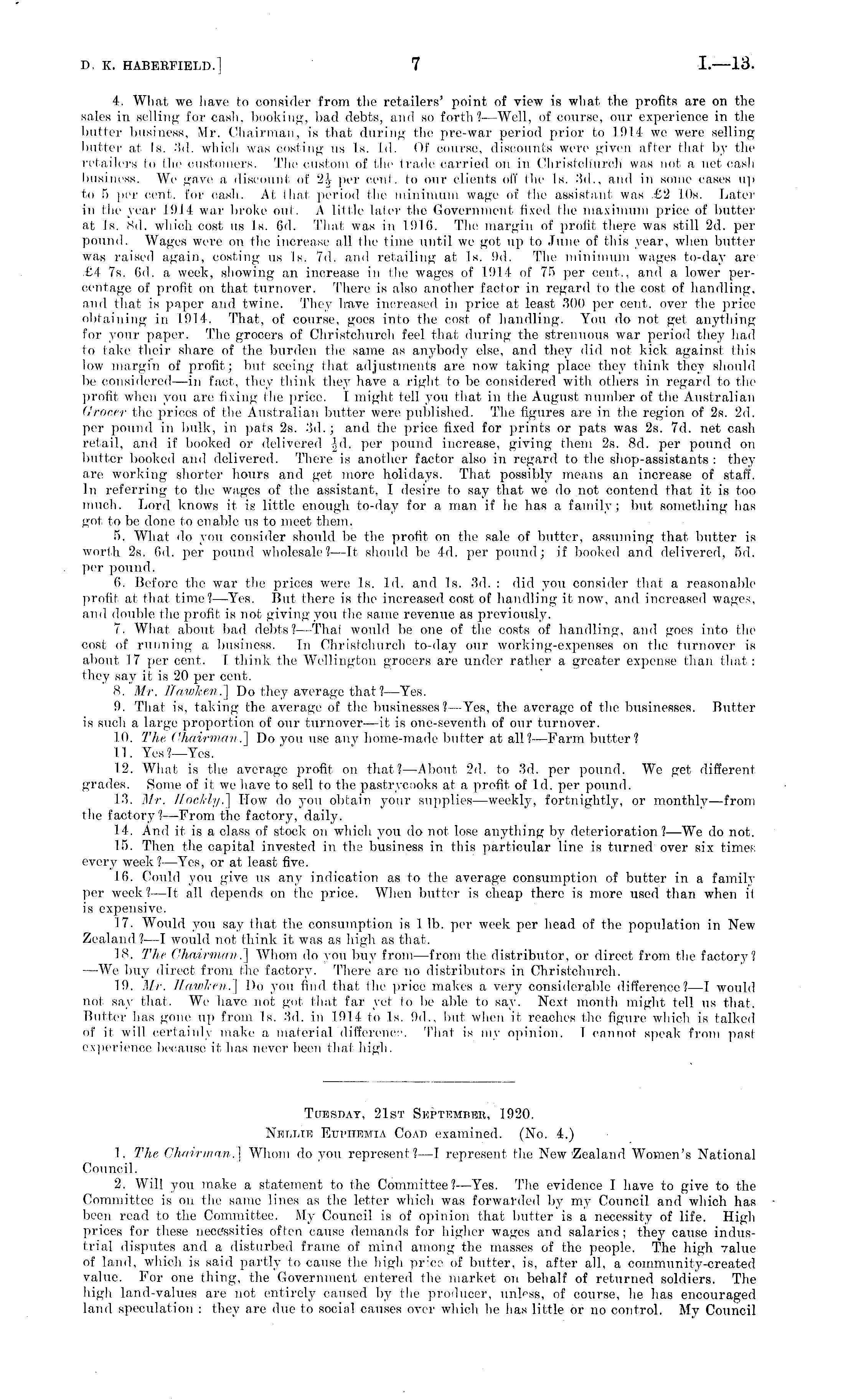 Tuesday, 21st September, 1920. Nellie Euvhemia Ooad examined. (No. 4.) 1. The Chairman ,| Whom do you represent?—T represent the New Zealand Women's National Council. 2. Will you make a statement to the Committee?— Yes. The evidence I have to give to the Committee is on the same lines as the letter which was forwarded by my Council and which has been read to the Committee. My Council is of opinion that butter is a necessity of life. High prices for these necessities often cause demands for higher wages and salaries; they canst; industrial disputes and a disturbed frame of mind among the masses of the people. The high value of land, which is said partly to cause the high price of butter, is, after all, a community-created value. For one thing, the Government entered the market on behalf of returned soldiers. The high land-values are not entirely caused by the producer, unhss, of course, he has encouraged land speculation ; they are due to social causes over which he has little or no control. My Council