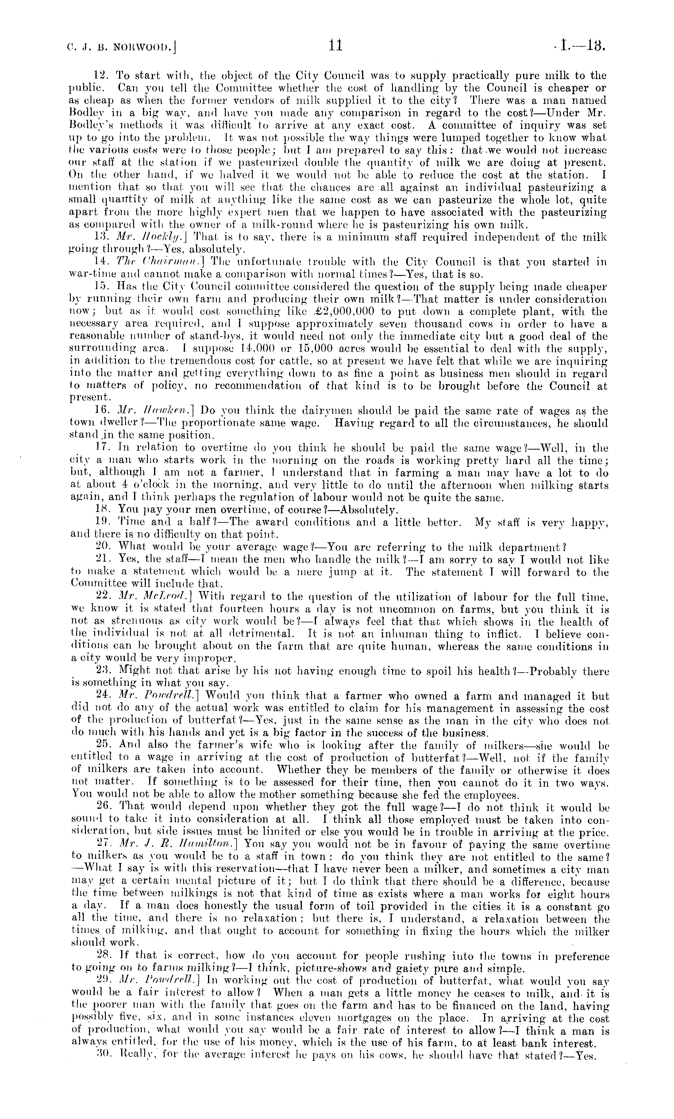 12. To start with, the object of the City Council was to supply practically pure milk to the public. Can you tell the Committee whelher the cost of handling by the Council is cheaper or as cheap as when the former vendors of milk supplied it to the city? There was a man named Bodley in a big way, and have you made any comparison in regard to the cost?— Under Mr. Bodice's methods il was dillicult lo arrive at any exact cost. A committee of inquiry was set up to go into the problem. It was not possible the way things were lumped together to know what the various costs were to those people; but I am prepared to say this: that .we would not increase our staff at the station if we pasteurized double the quantity of milk we are doing at present. On the other hand, if we halved it we would uol be able to reduce the cost at the station. I mention that so thai, you wilt see I hat, the chances are all against an individual pasteurizing a small quantity of milk at anything like the same cost as we can pasteurize the whole lot, quite apart from the more highly expert men that we happen to have associated with the pasteurizing as compared with the owner of a milk-round where he is pasteurizing his own milk. 13. Mr. Hockly.] That is to say, there is a minimum staff required independent of the milk going through?— Yes, absolutely. 14. 77(t- Chairman.} The unfortunate I rouble with the City Council is that you started in war-time and cannot make a comparison with normal times?— Yes, that is so. 15. Has the City Council committee considered the question of the supply being made cheaper by running (heir own farm and producing their own milk?— That matter is under consideration now; but as if would cost, something like £2,000,000 to put down a complete plant, with the necessary area required, and 1 suppose approximately seven thousand cows in order to have a reasonable number of stand-bys, it would need not only I he immediate city but a good deal of the surrounding area. I suppose 11,000 or 15,000 acres would be essential to deal with tin- supply, in addition to the tremendous cost for cat lie, so at present we have felt that while we are inquiring into the matter and getting everything down to as fine a point as business men should in regard to matters of policy, no recommendation of that kind is to be brought before the Council at present. 16. Mr. Hawken,] Do you think the dairymen should be paid the same rate of wages as the town dweller?— The proportionate same wage. Having regard to all the circumstances, he should stand, jn the same position. 17. In relation to overtime do you think he should lie paid the same wage?— Well, in the city a man who starts work in the morning on the roads is working pretty hard all the time; but, although 1 am not a farmer, I understand that in farming a man may have a lot to do at about 4 o'clock in the morning, and very little to do until the afternoon when milking starts again, and I think perhaps the regulation of labour would not be quite the same. 18. You \mj your men overtime, of course?— Absolutely. 19. Time and a half? —The award conditions and a little better. My staff is very happy, and there is no difficulty on that point. 20. What would be your average wage?— You are referring to the milk department? 21. Yes, the staff—T mean the men who handle the milk?—l am sorry to say I would nol like to make a Statement which would be a mere jump at it. The statement T will forward to the Committee will include that. 22. Mr. McLeod.] With regard to the question of the utilization of labour for the full time, we know it is stated that fourteen hours a day is not uncommon on farms, but you think it is not as strenuous as city work would be?—l always feel that that which shows in the health of the individual is not at all detrimental. It is not an inhuman thing to inflict. I believe conditions can be brought about on the farm that are quite human, whereas the same conditions in a city would be very improper. 23. Might not that arise by his not having enough time to spoil his health?— Probably there is something in what you say. 24. Mr. I'owdrill,] Would you think that a farmer who owned a farm and managed it but did not do any of the actual work was entitled to claim for his management in assessing the cost of the production of butterfat?—Yes, just in the same sense as the man in the city who does not do much with his hands and yet is a big factor in the success of the business. 25. And also the farmer's wife who is looking after the family of milkers —siie would be entitled to a wage in arriving at the cost of production of butterfat?—Well, nol if the family of milkers are taken into account. Whether they be members of the family or otherwise it does not matter. If something is to be assessed for their time, tlien you cannot do it in two ways. You would not be able to allow the mother something because she fed the employees. 26. That would depend upon whether they got the full wage?—l do nol think it would be sound to take it into consideration at all. I think all those employed must be taken into consideration, but side issues must be limited or else you would be in trouble in arriving at the price. 27. Mr. J. R, Hamilton.] You say you would not be in favour of paying the same overtime to milkers as you would be to a staff in town: do you think they are not entitled to the same? —What I say is with this reservation—that I have never been a milker, and sometimes a city man may get a certain mental picture of it; but I do think thai there should be a difference, because the time between milkings is not that kind of time as exisls where a man works foi eight hours a day. If a man does honestly the usual form of toil provided in the cities it is a constant go all the time, and there is no relaxation ; but there is, 1 understand, a relaxation between the times of milking, and thai ought lo account for something in fixing the hours which 