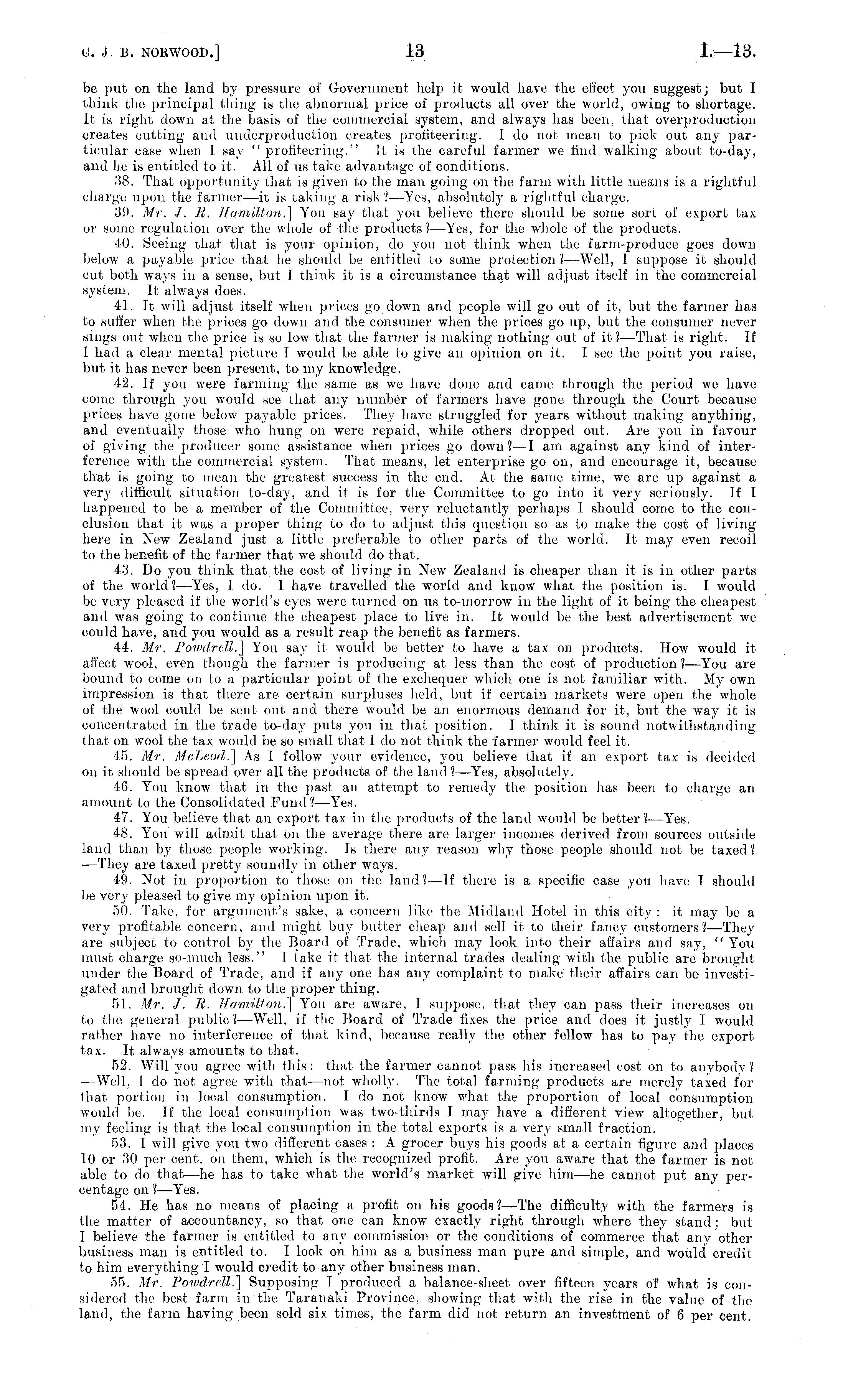 be put on the land by pressure of Government help it would have the effect you suggest; but I think the principal thing is the abnormal price of products all over the world, owing to shortage. It is right down at the basis of the commercial system, and always has been, that overproduction creates cutting and underproduction creates profiteering. I do not mean to pick out any particular case when I say "profiteering." It is the careful farmer we find walking about to-day, and he is entitled to it. All of us take advantage of conditions. 38. That opportunity that is given to the man going on the farm with little means is a rightful charge upon the farmer—it is taking a risk? —Yes, absolutely a rightful charge. 39. Mr. J. R. Hamilton.] You say that you believe there should be some sort of export tax or some regulation over the whole of the products?— Yes, for the whole of the products. 40. Seeing that that is your opinion, do you not think, when the farm-produce goes down below a payable price that he should be entitled to some protection?— Well, I suppose it should cut both ways in a sense, but I think it is a circumstance that will adjust itself in the commercial system. It always does. 41. It will adjust itself when prices go down and people will go out of it, but the farmer has to suffer when the prices go down and the consumer when the prices go up, but the consumer never sings out when the price is so low that the farmer is making nothing out, of if?— That is right. If I had a clear mental picture I would be able to give an ojiinion on it. I see the point you raise, but it has never been present, to my knowledge. 42. If you were farming the same as we have done and came through the period we have come through you would see that any number of farmers have gone through the Court because prices have gone below payable prices. They have struggled for years without making anything, and eventually those who hung on were repaid, while others dropped out. Are you in favour of giving the producer some assistance when prices go down?—l am against any kind of interference with the commercial system. That means, let enterprise go on, and encourage it, because that is going to mean the greatest success in the end. At the same time, we are up against a very difficult situation to-day, and it is for the Committee to go into it very seriously. If I happened to be a member of the Committee, very reluctantly perhaps 1 should come to the conclusion that it was a proper thing to do to adjust this question so as to make the cost of living here in New Zealand just a little preferable to other parts of the world. It may even recoil to the benefit of the farmer that we should do that. 43. Do you think that the cost of living in New Zealand is cheaper than it is in other parts of the world? —Yes, I do. I have travelled the world and know what the position is. I would be very pleased if the world's eyes were turned on us to-morrow in the light of it being the cheapest and was going to continue the cheapest place to live in. It would be the best advertisement we could have, and you would as a result reap the benefit as farmers. 44. Mr. Powdrell] You say it would be better to have a tax on products. How would it affect wool, even though the farmer is producing at less than the cost of production?— You are bound to come on to a particular point of the exchequer which one is not familiar with. My own impression is that there are certain surpluses held, but if certain markets were open the whole of the wool could be sent out and there would be an enormous demand for it, but the way it is concentrated in the trade to-day puts you in that position. I think it is sound notwithstanding that on wool the tax would be so small that I do not think the farmer would feel it. 45. Mr. McLeod.] As 1 follow your evidence, you believe that if an export tax is decided on it should be spread over all the products of the land ?—Yes, absolutely. 46. You know that in the past an attempt to remedy the position has been to charge an amount to the Consolidated Fund?— Yes. 47. You believe that an export tax in the products of the land would be better?— Yes. 48. You will admit that on the average there are larger incomes derived from sources outside land than by those people working. Is there any reason why those people should not be taxed? —They are taxed pretty soundly in other ways. 49. Not in proportion to those on the land? —If there is a specific case have I should be very pleased to give my opinion upon it. 50. Take, for argument's sake, a concern like the Midland Hotel in this city : it may be a very profitable concern, and might buy butter cheap and sell it to their fancy customers?— They are subject to control by the Board of Trade, which may look into their affairs and say, " You must charge so-much less." I take it that the internal trades dealing with the public are brought under the Board of Trade, and if any one has any complaint to make their affairs can be investigated and brought down to the proper thing. 51. Mr. J. R. Hamilton.] You are aware, I suppose, that they can pass their increases on to the general public? —Well, if the Board of Trade fixes the price and does it justly I would rather have no interference of that kind, because really the other fellow has to pay the export tax. It always amounts to that. 52. Will you agree with this: that the farmer cannot pass his increasetl cost on to anybody? —Well, I do not agree with that—not wholly. The total farming products are merely taxed for that portion in local consumption. I do not know what the proportion of local consumption would be. If the local consumption was two-thirds I may have a different view altogether, but my feeling is that the local consumption in the total exports is a very small fraction. 53. I will give you two different cases : A grocer buys his goods at a certain figure and places 10 or 30 per cent, on them, which 